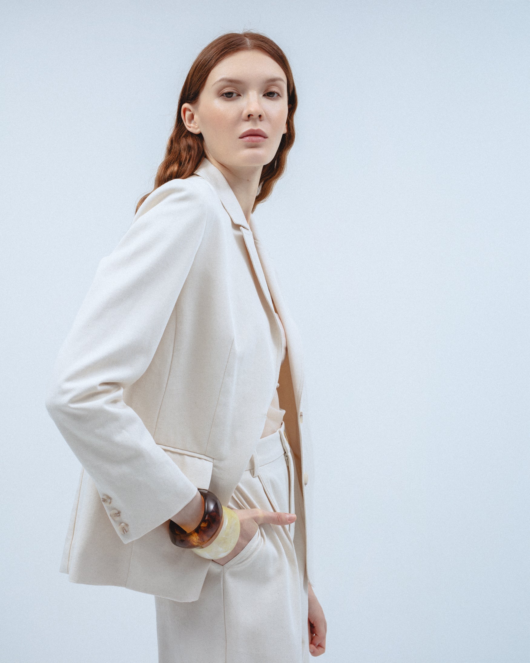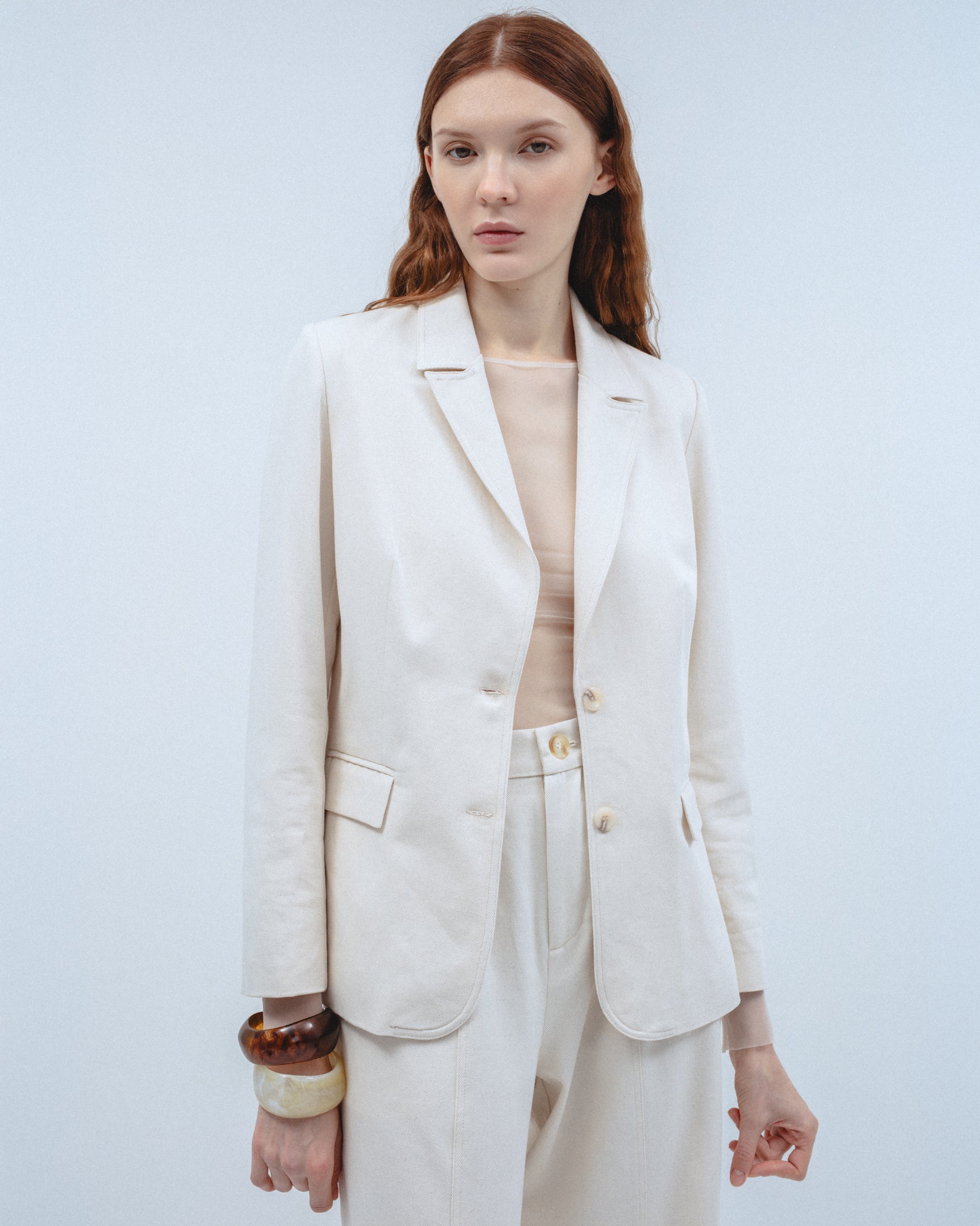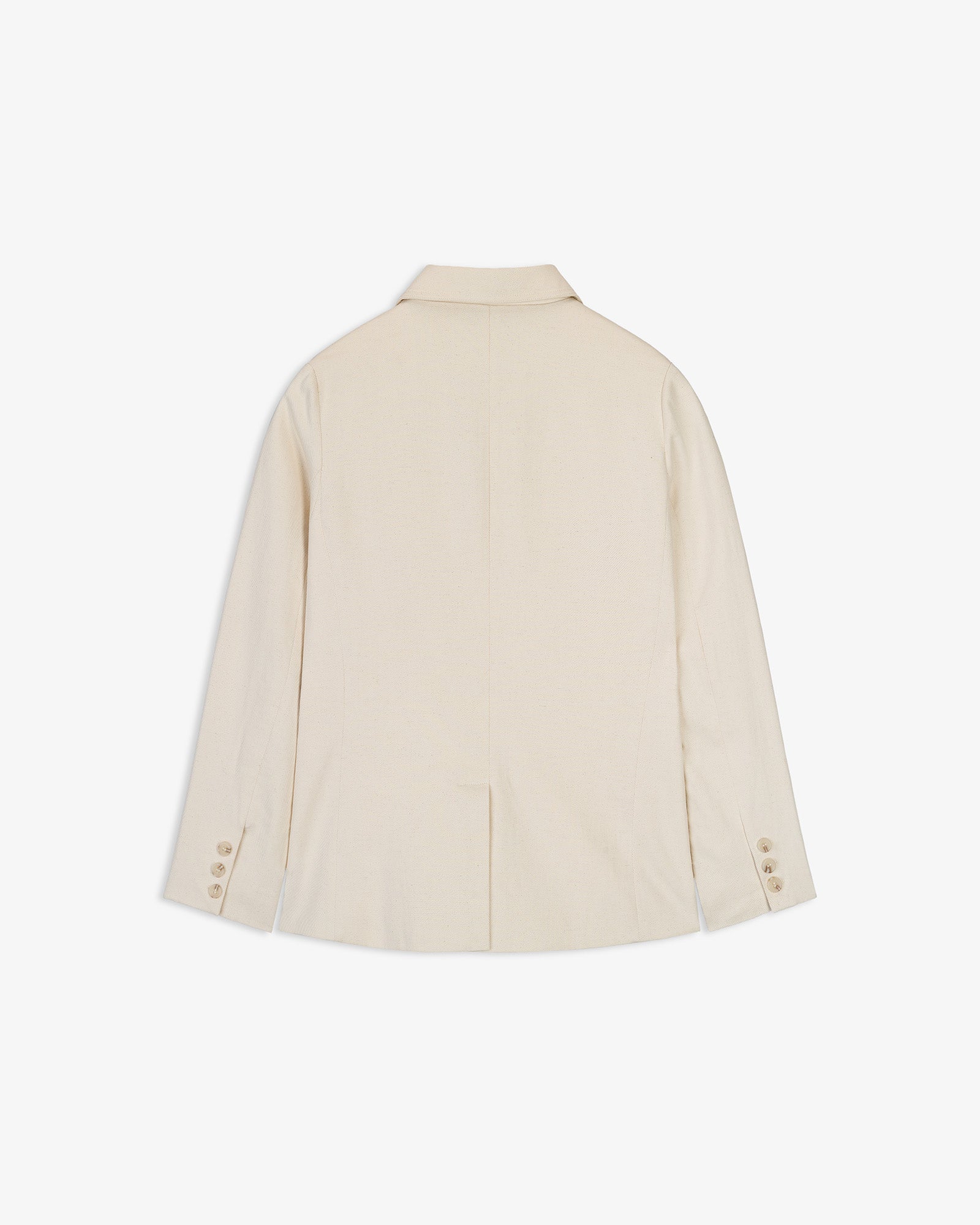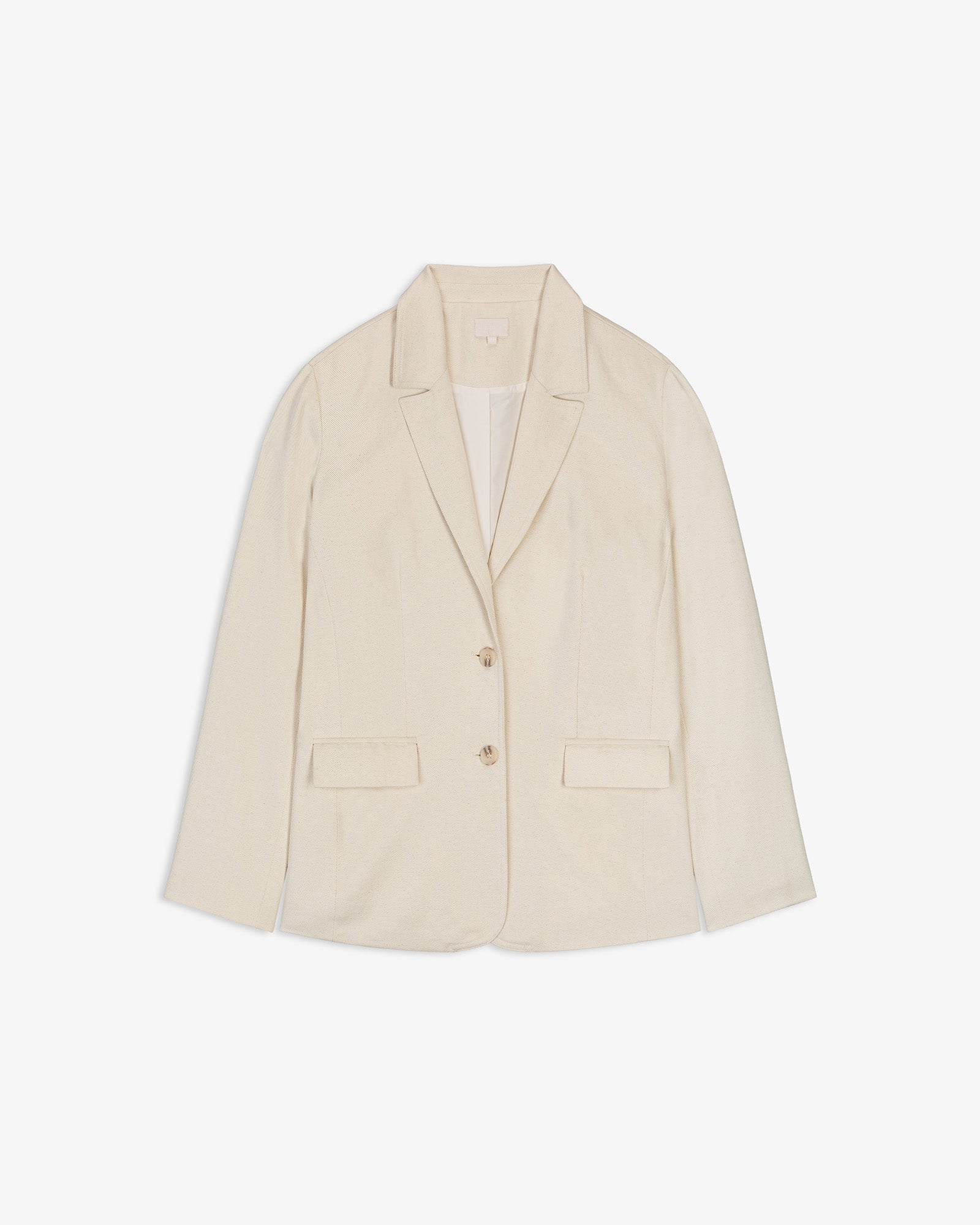 Americana de cuello solapa y manga larga. Detalle de bolsillos de solapa en delantero. Tejido con acabado de aspecto rústico y caída fluida. Cierre frontal mediante botón.