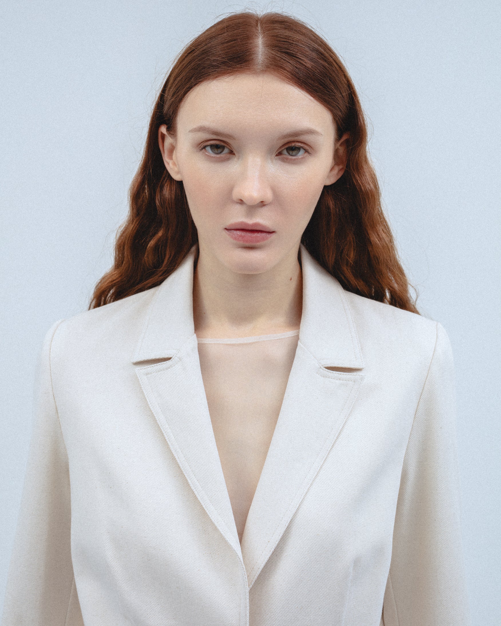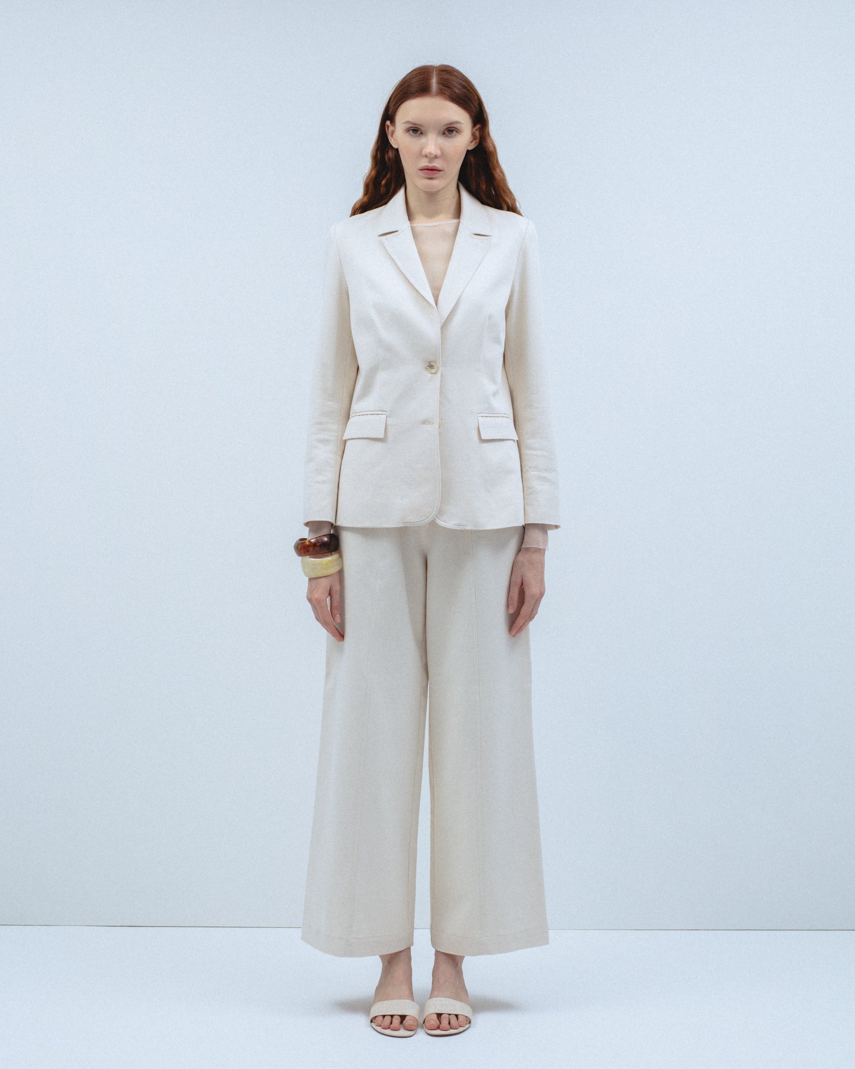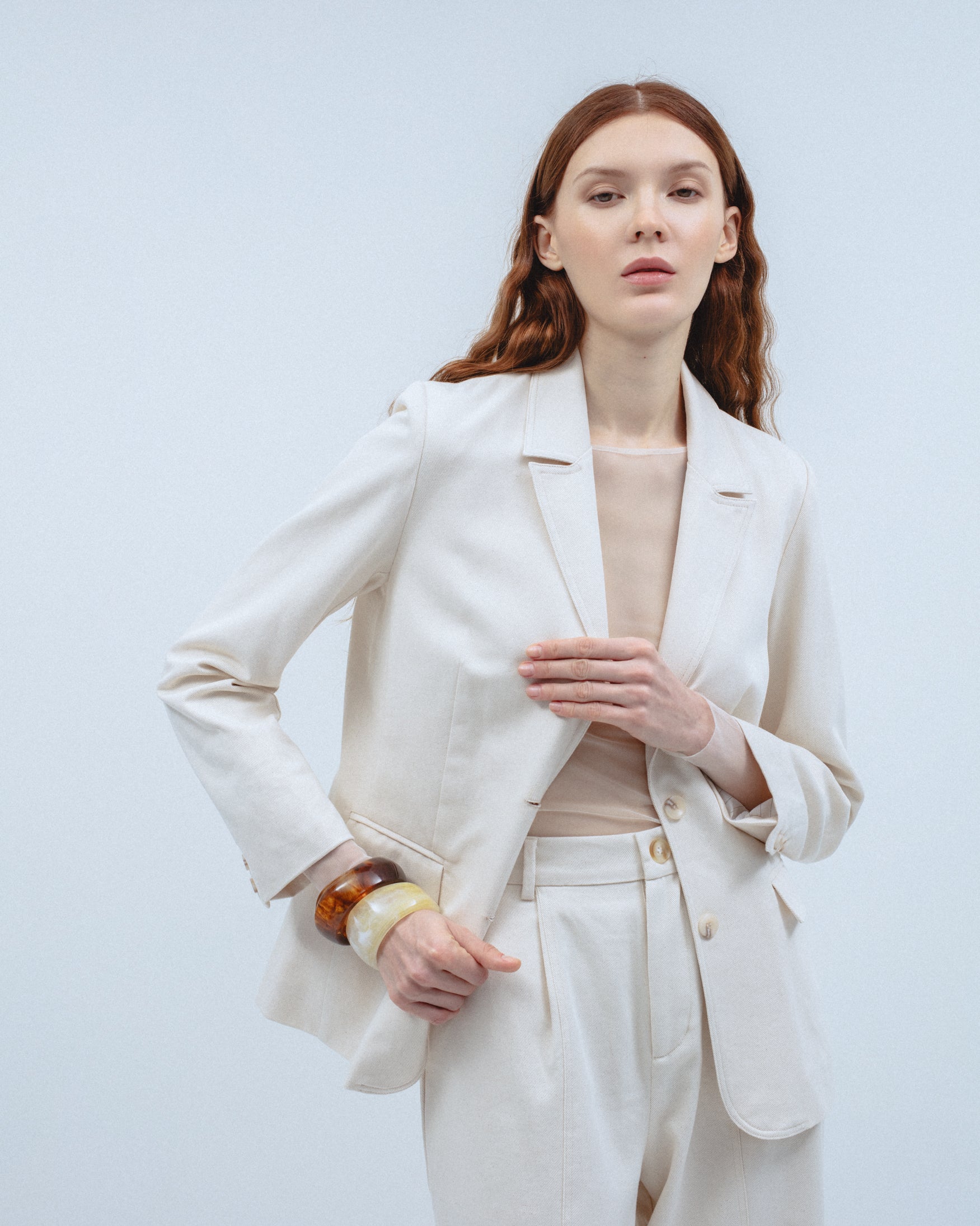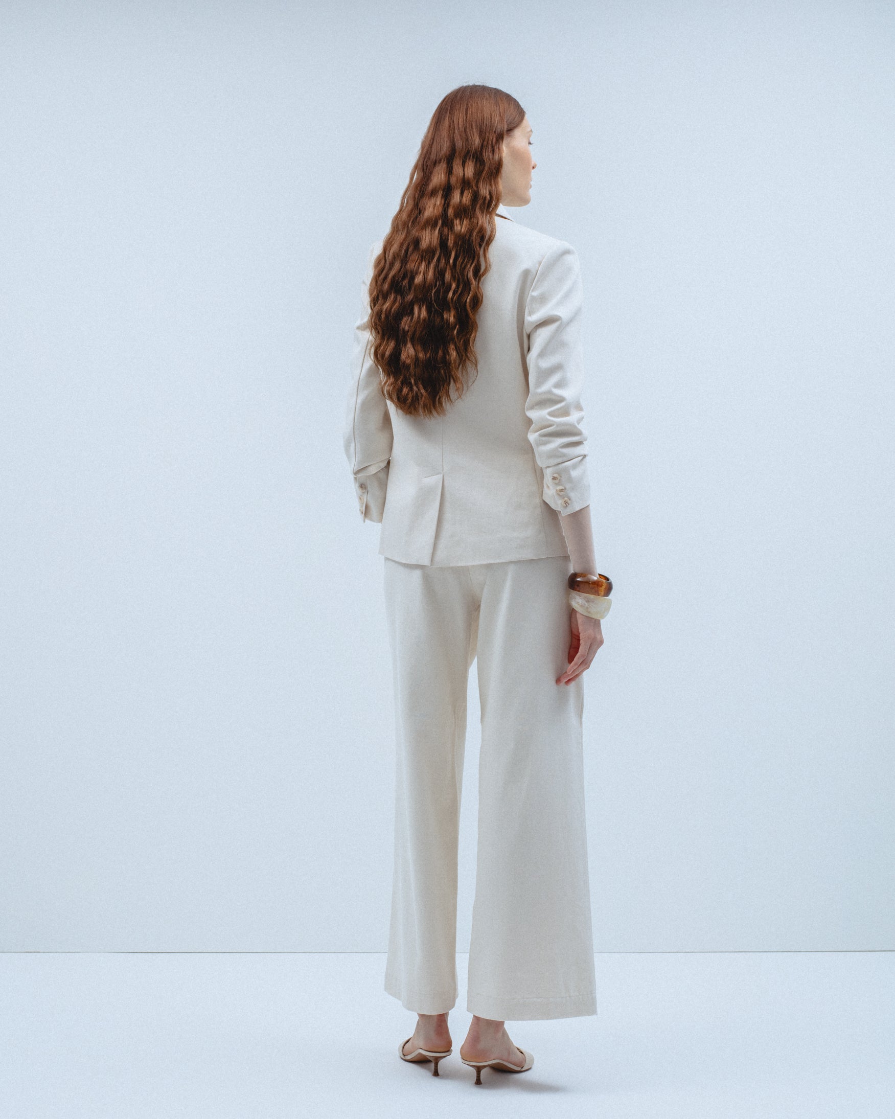 Americana de cuello solapa y manga larga. Detalle de bolsillos de solapa en delantero. Tejido con acabado de aspecto rústico y caída fluida. Cierre frontal mediante botón.