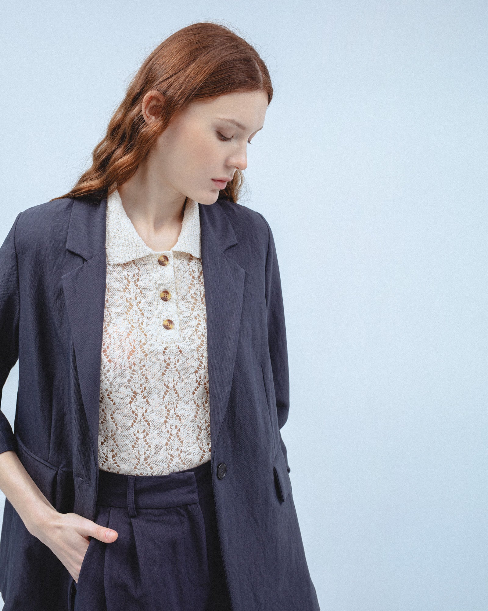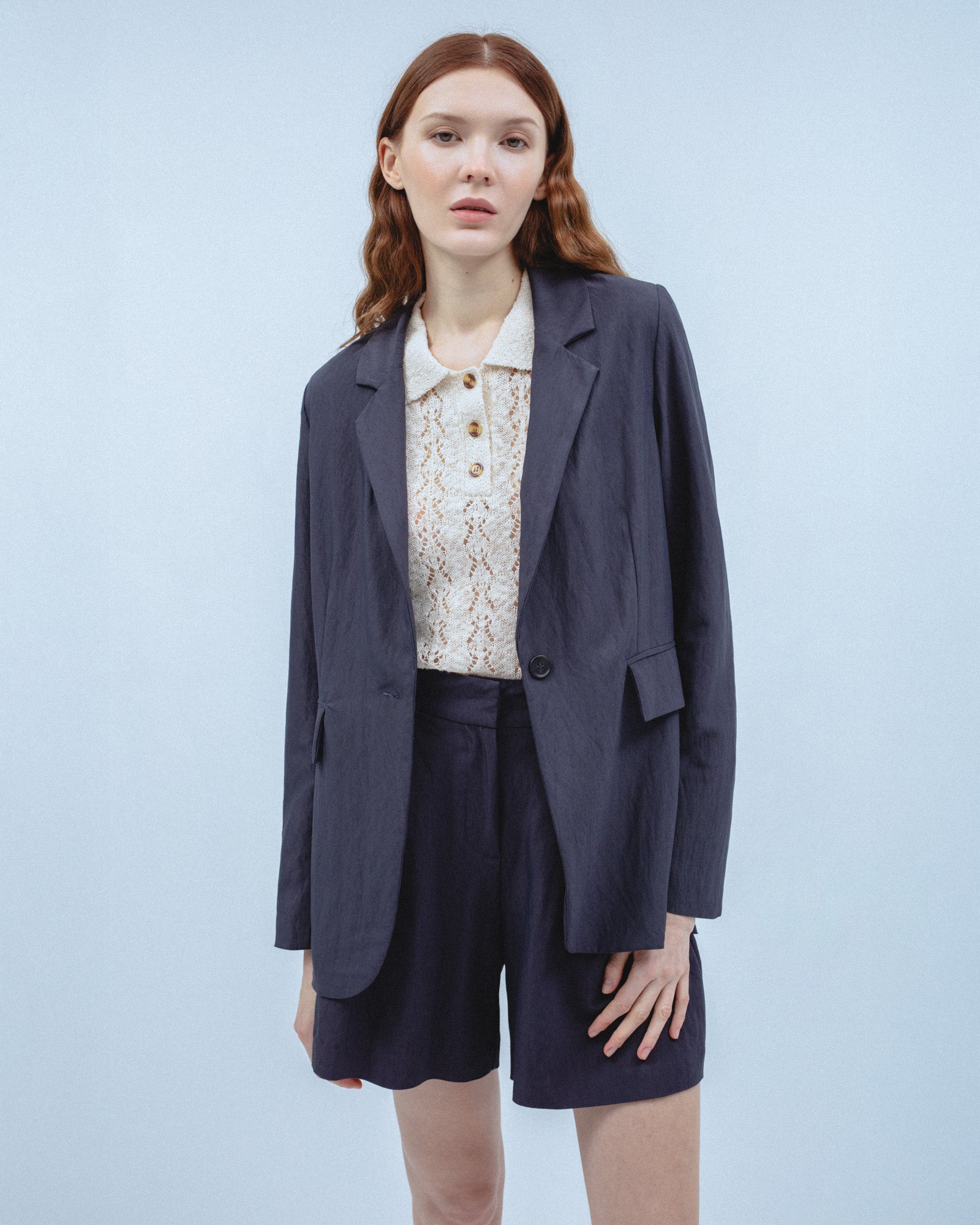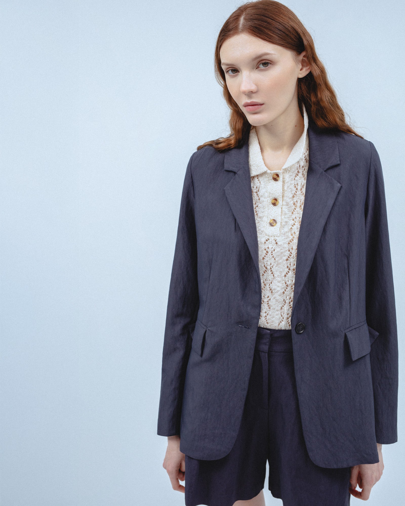 Americana de cuello solapa y manga larga con hombros marcados. Detalle de doble bolsillo con solapa en un lateral y bolsillo sencillo en el opuesto. Cierre frontal mediante botón a contraste.
