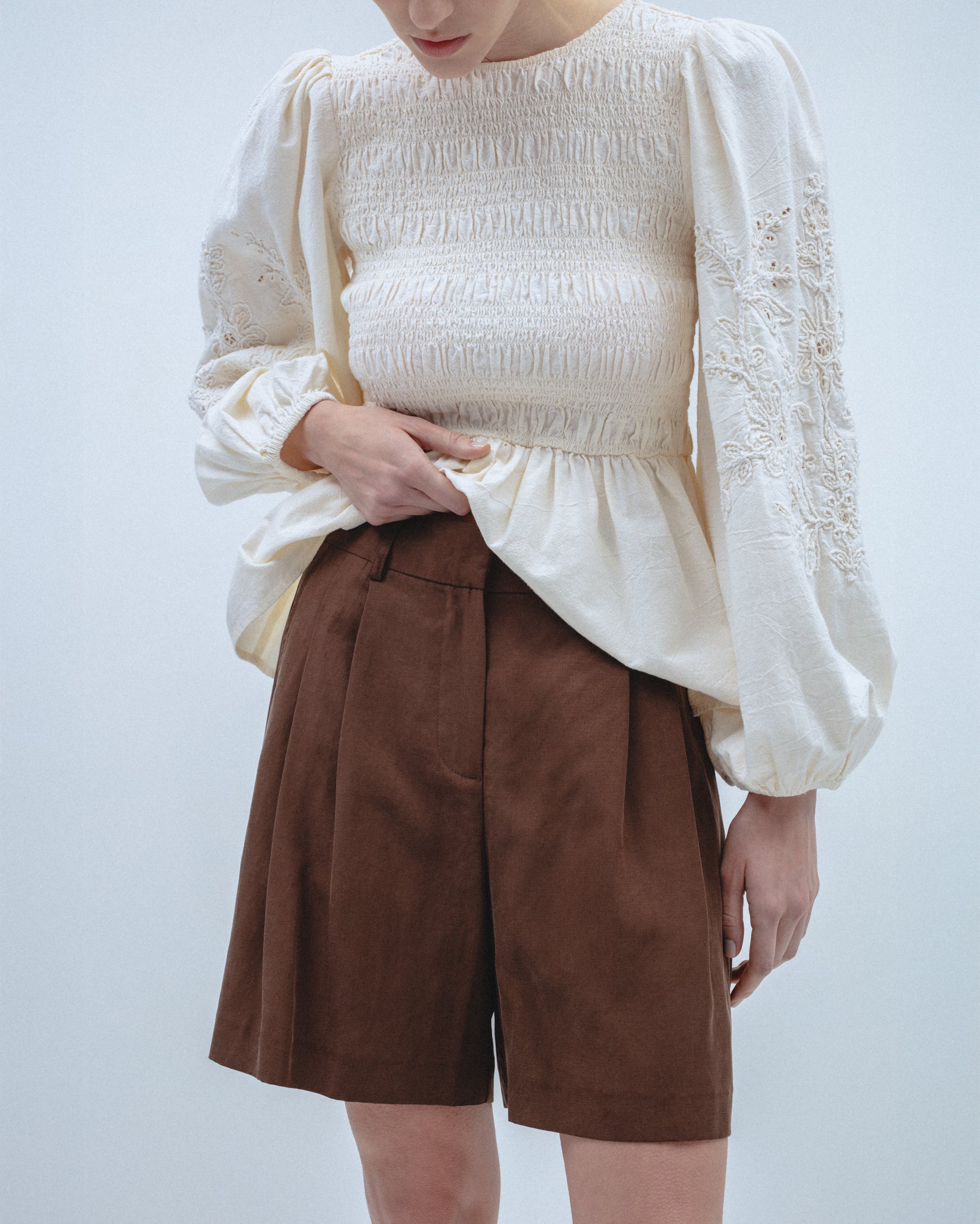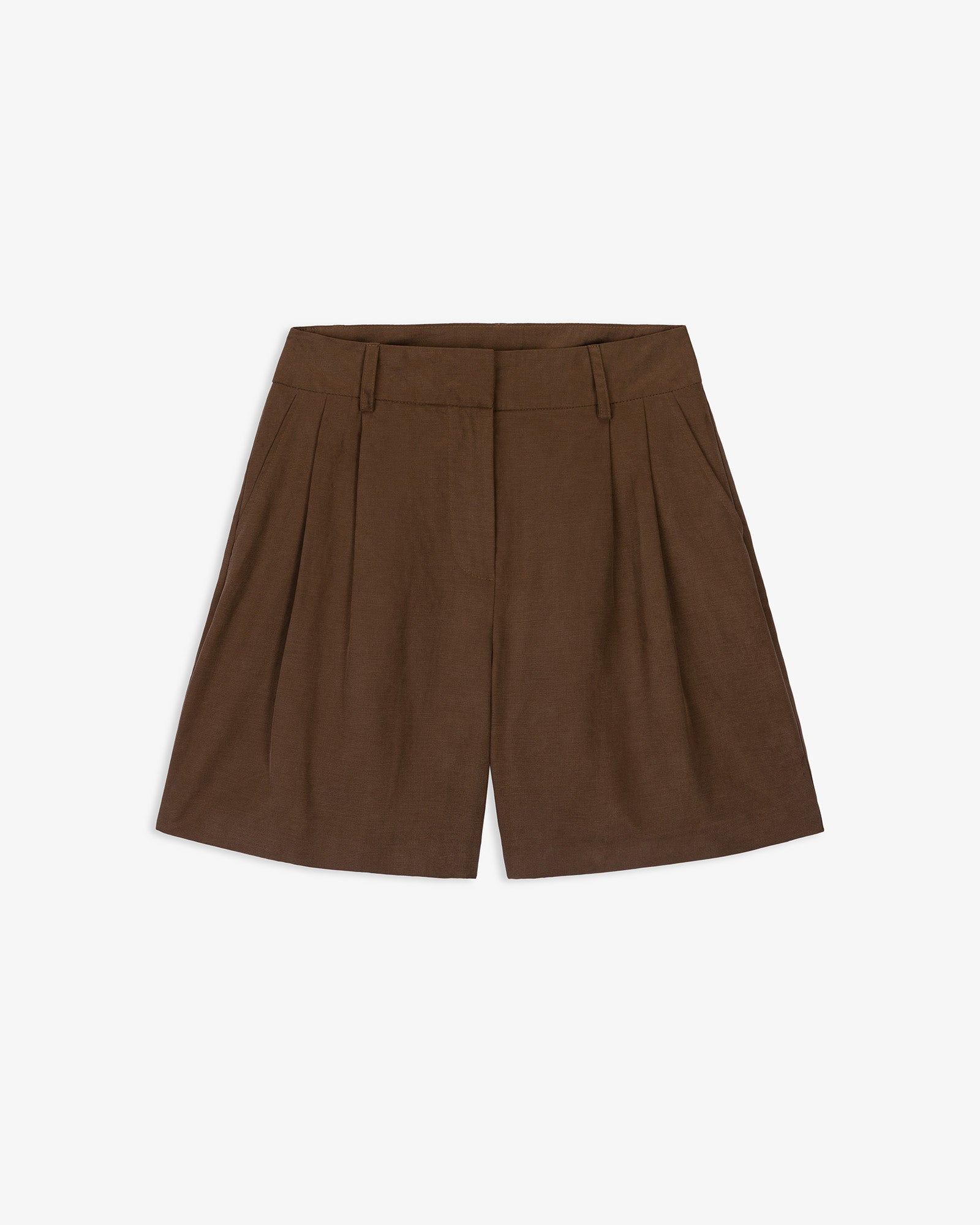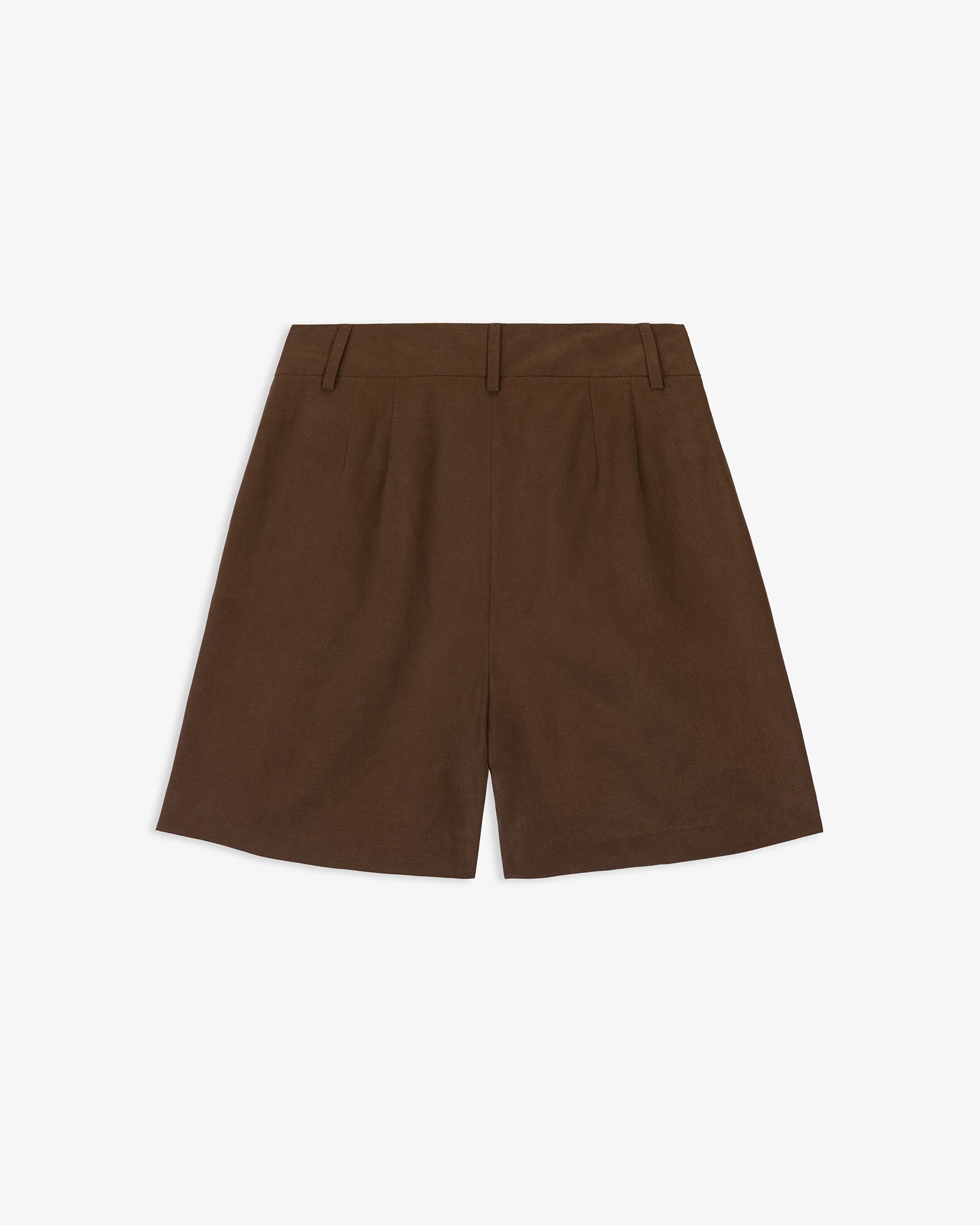 Bermuda de tiro alto confeccionada en tejido con mezcla de lino. Detalle de pinzas delanteras y bolsillos laterales. Cierre frontal con cremallera, botón interior y gancho metálico.