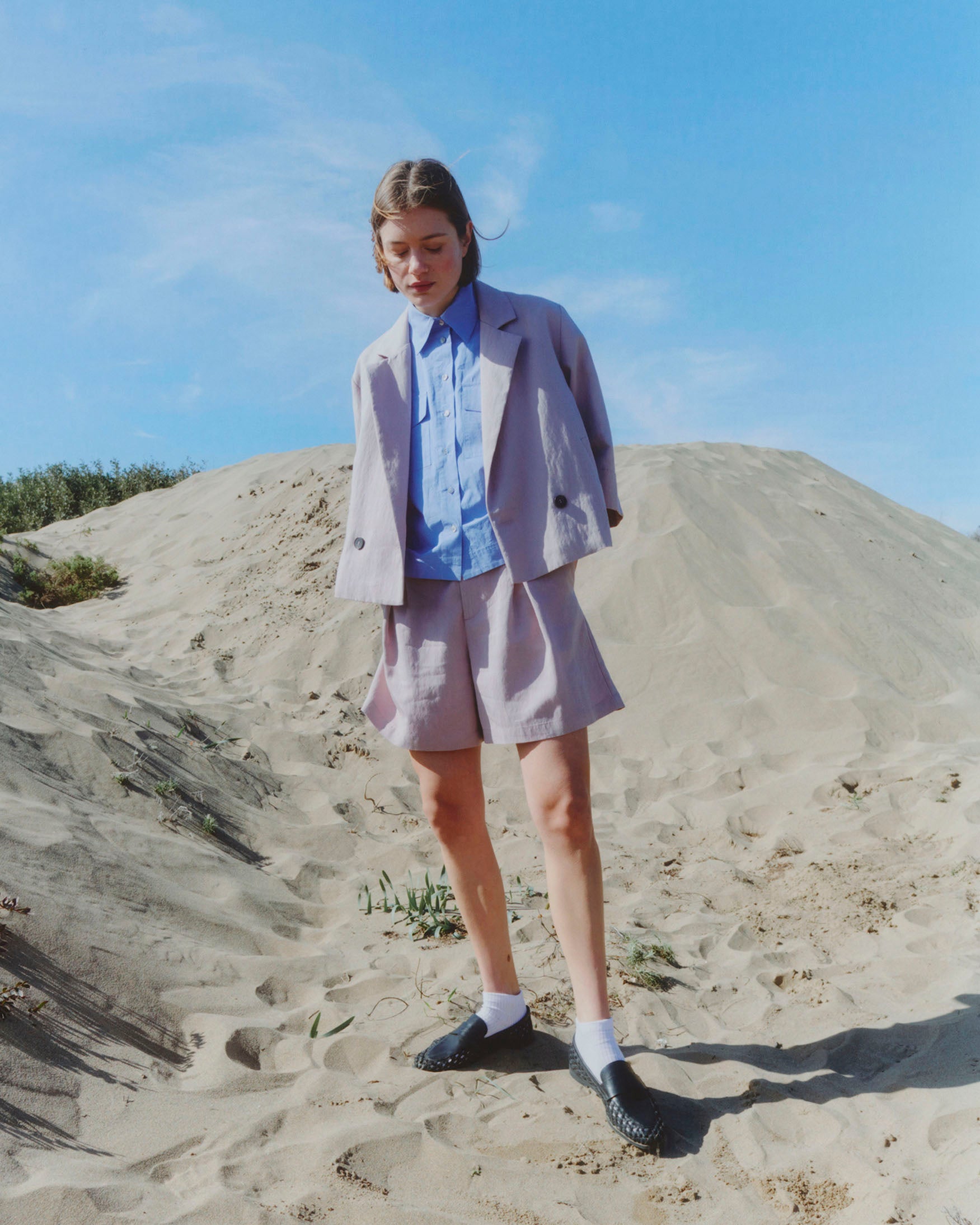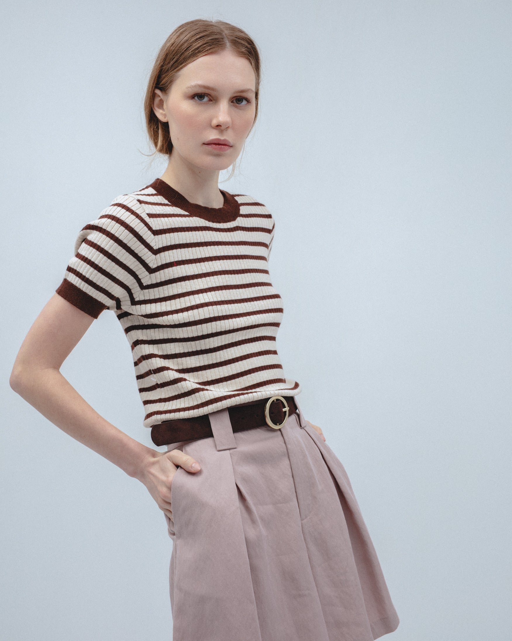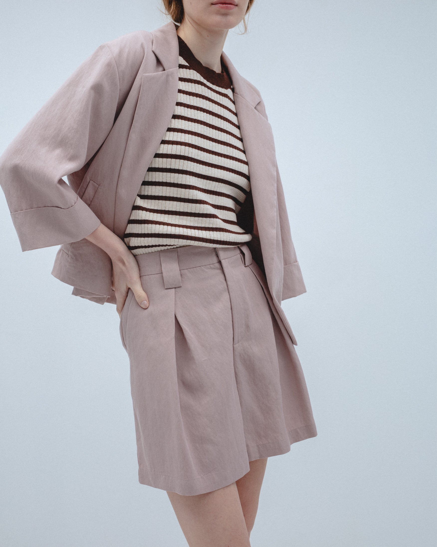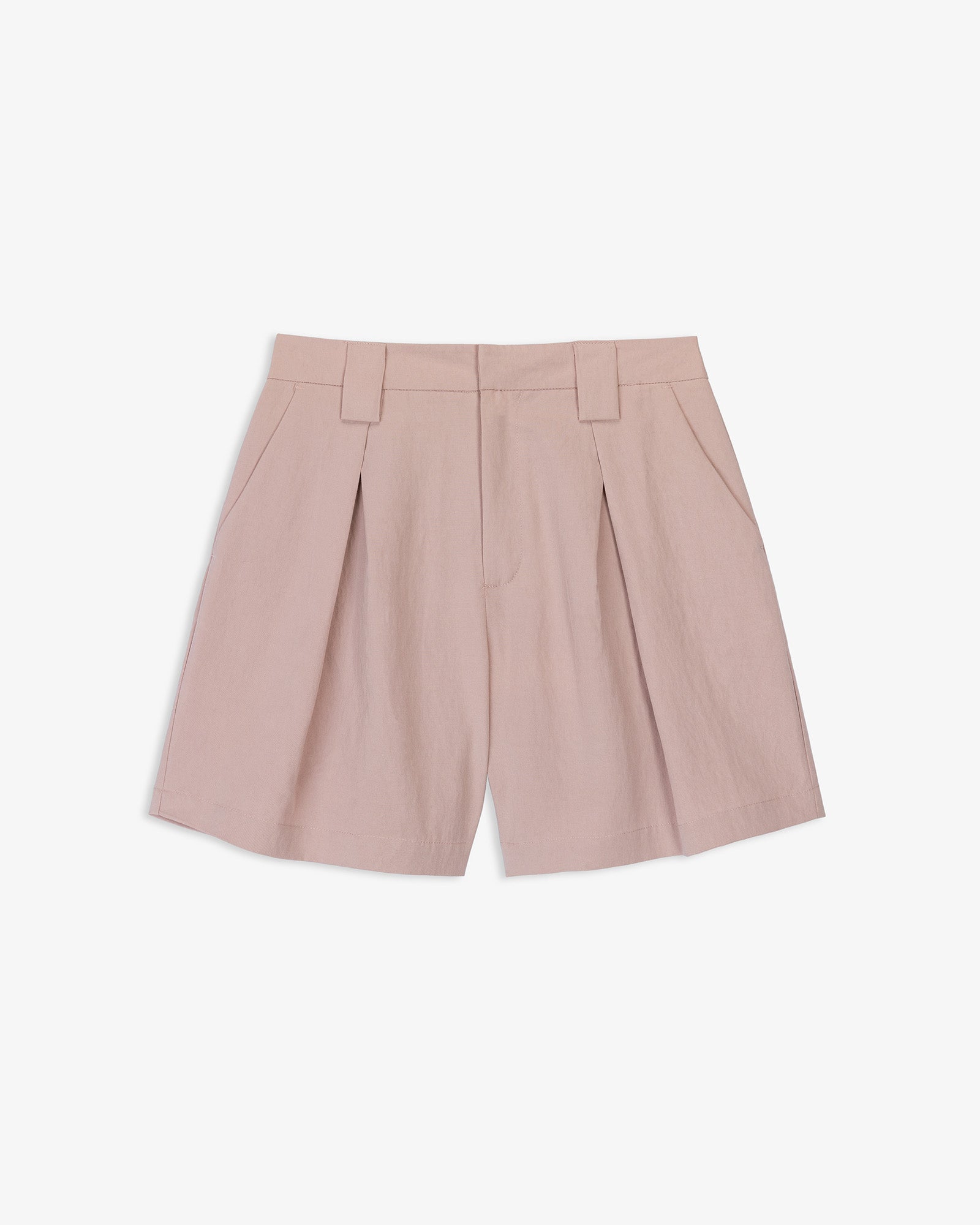 Bermuda de tiro alto. Detalle de pinzas delanteras. Bolsillos laterales y de vivo en espalda. Cierre frontal con cremallera, botón interior y gancho metálico.