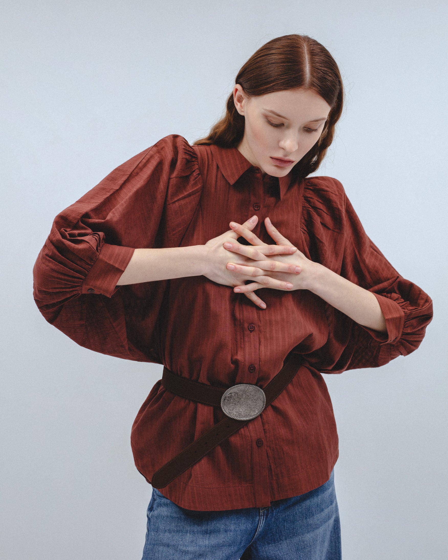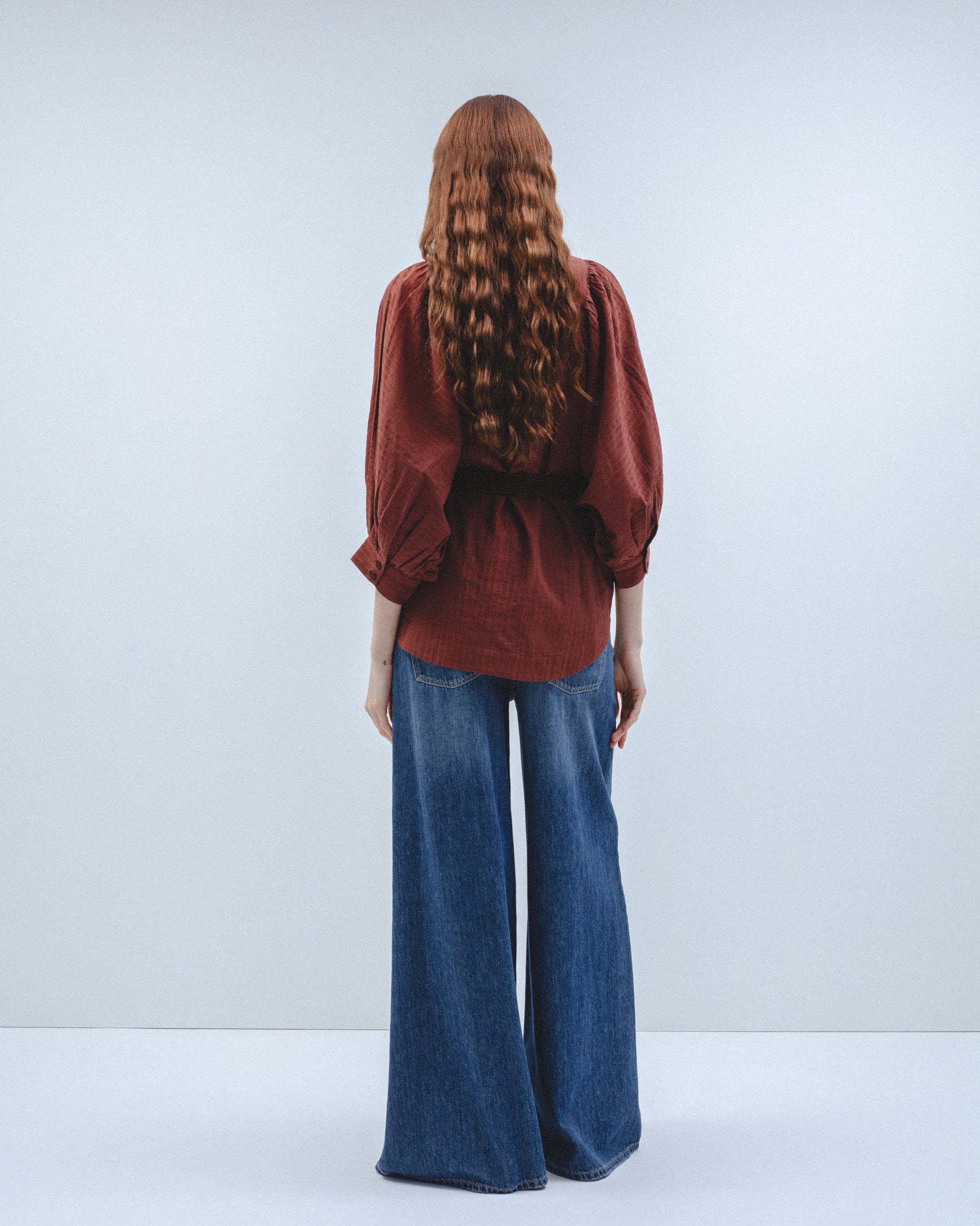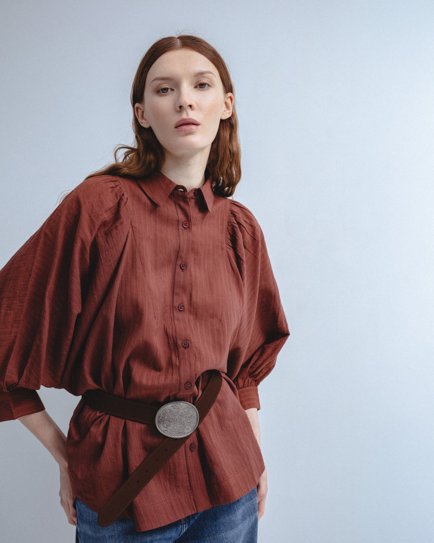 Camisa de cuello solapa y manga abullonada por debajo del codo acabada en puño. Detalle de pliegues en hombros que aportan volumen. Bajo asimétrico con aberturas laterales. Cierre frontal con botones a tono.