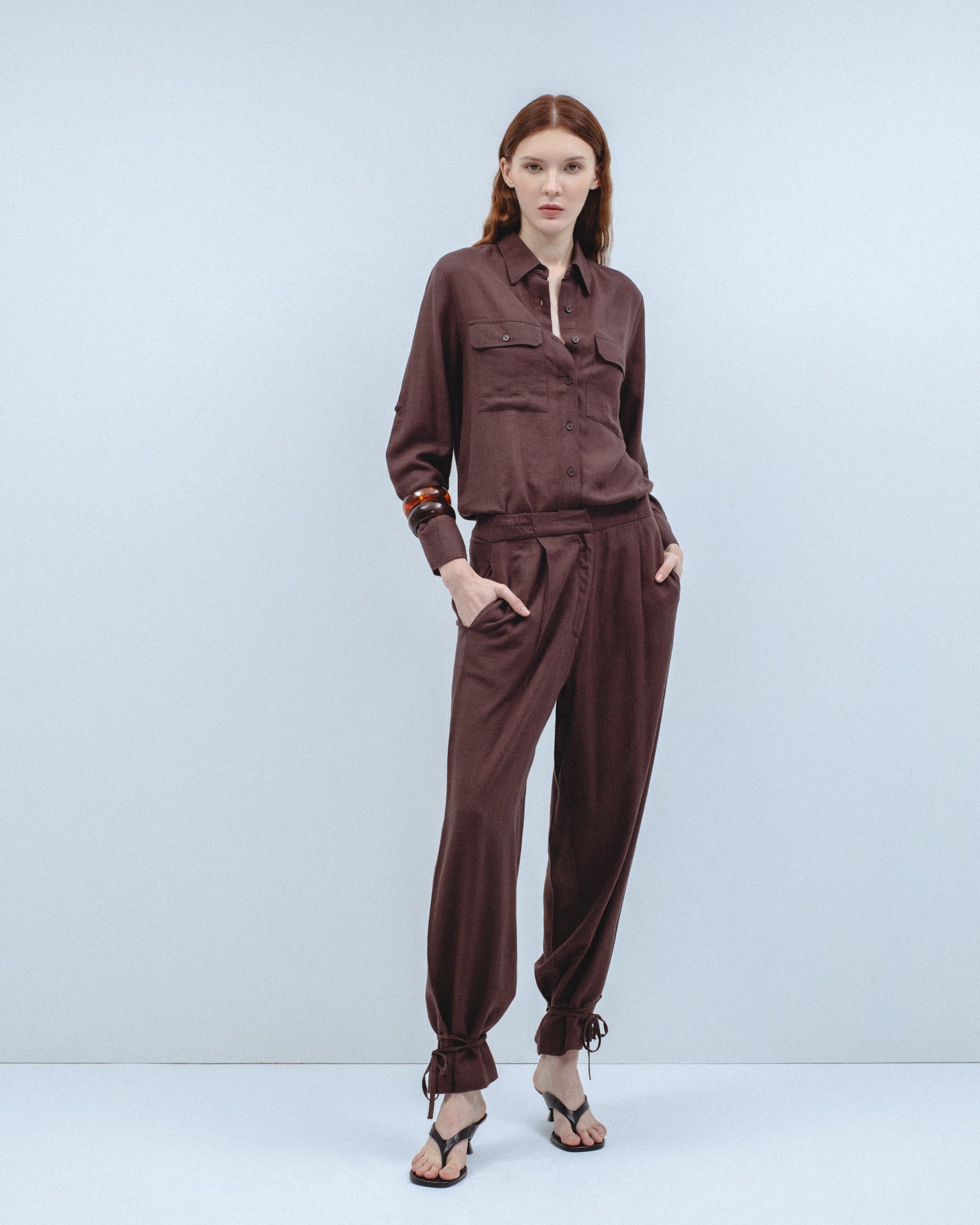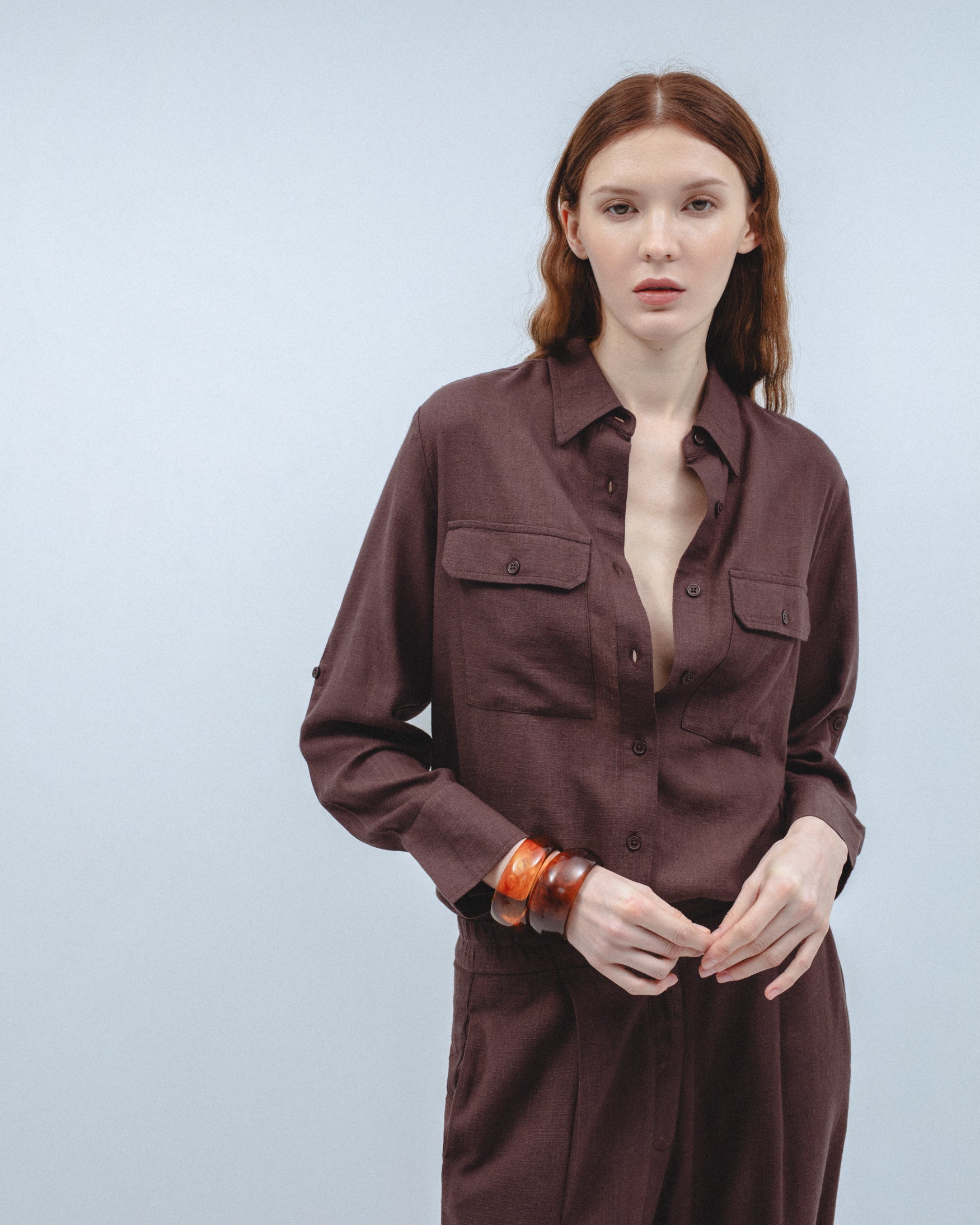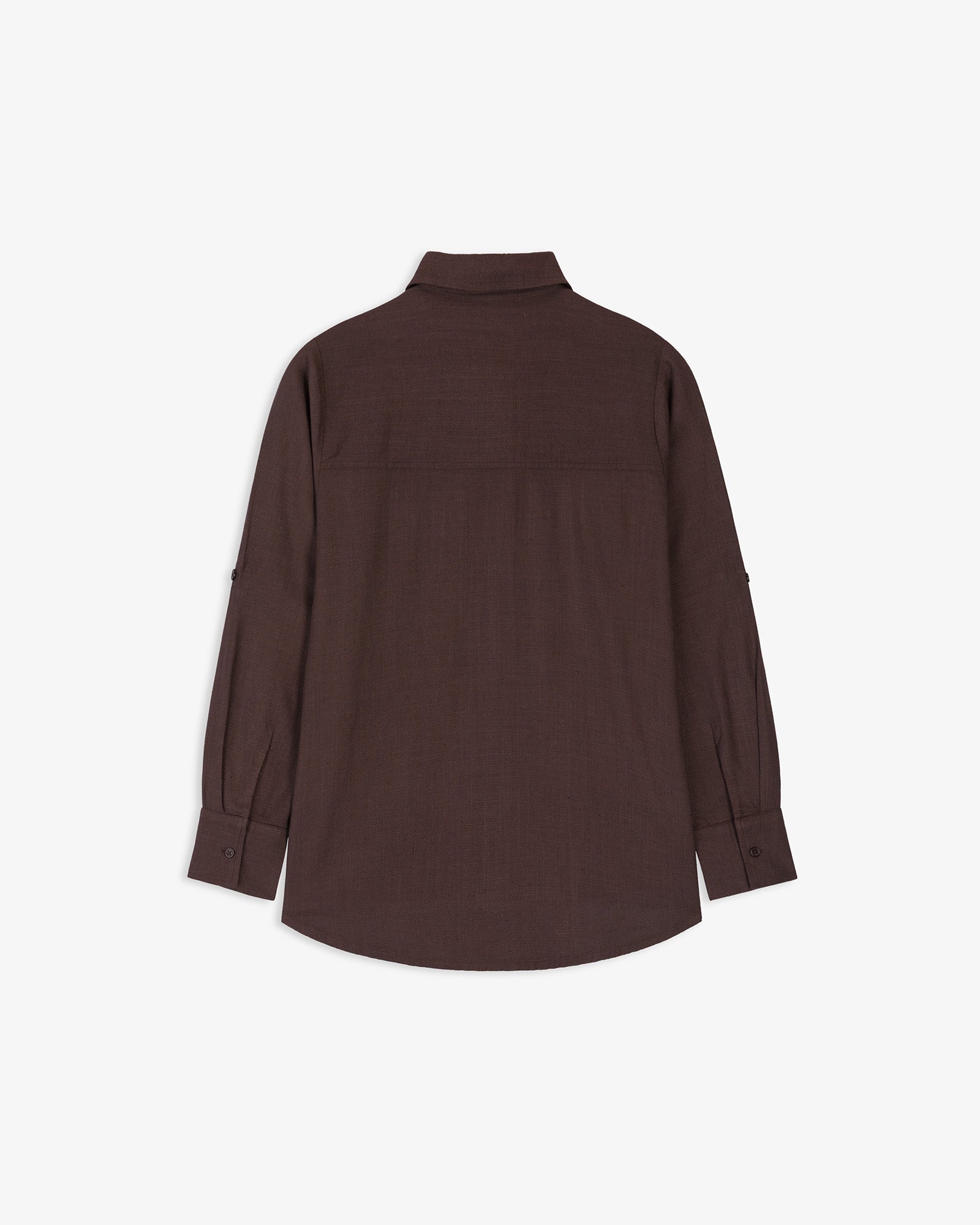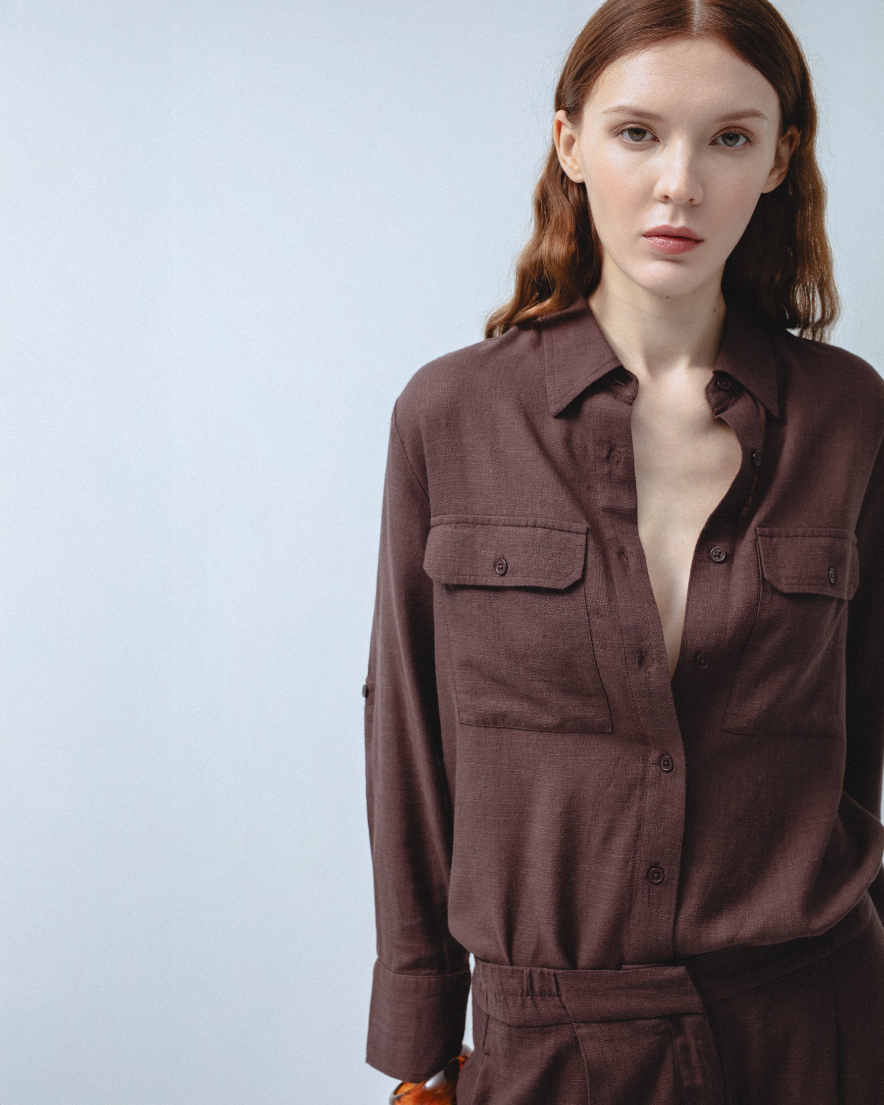Camisa de cuello solapa y manga larga acabada en puño. Detalle de bolsillos de plastrón con solapa y botón en delantero. Manga ajustable mediante trabilla y botón. Cierre frontal con botonadura simple. Bajo con aberturas laterales.