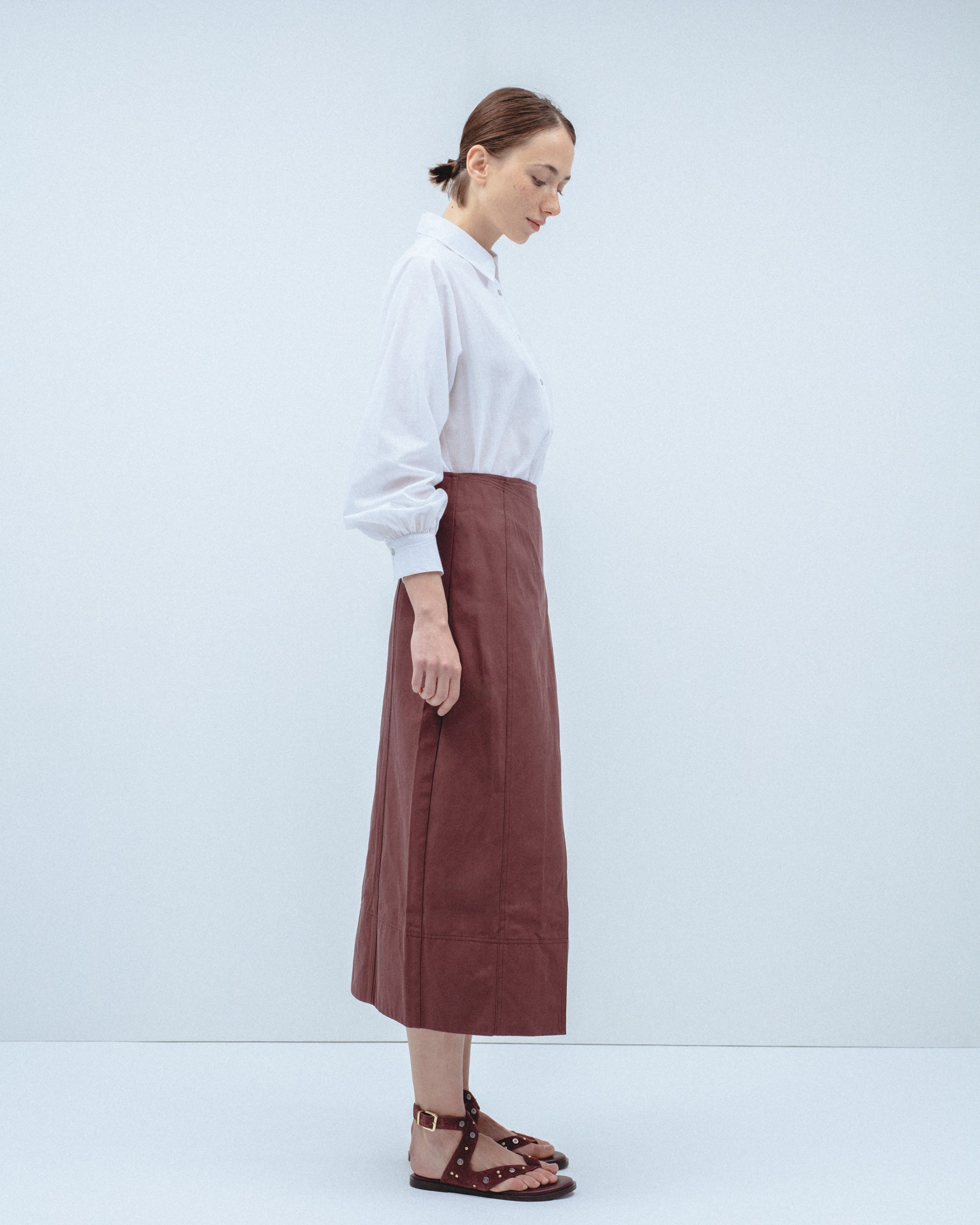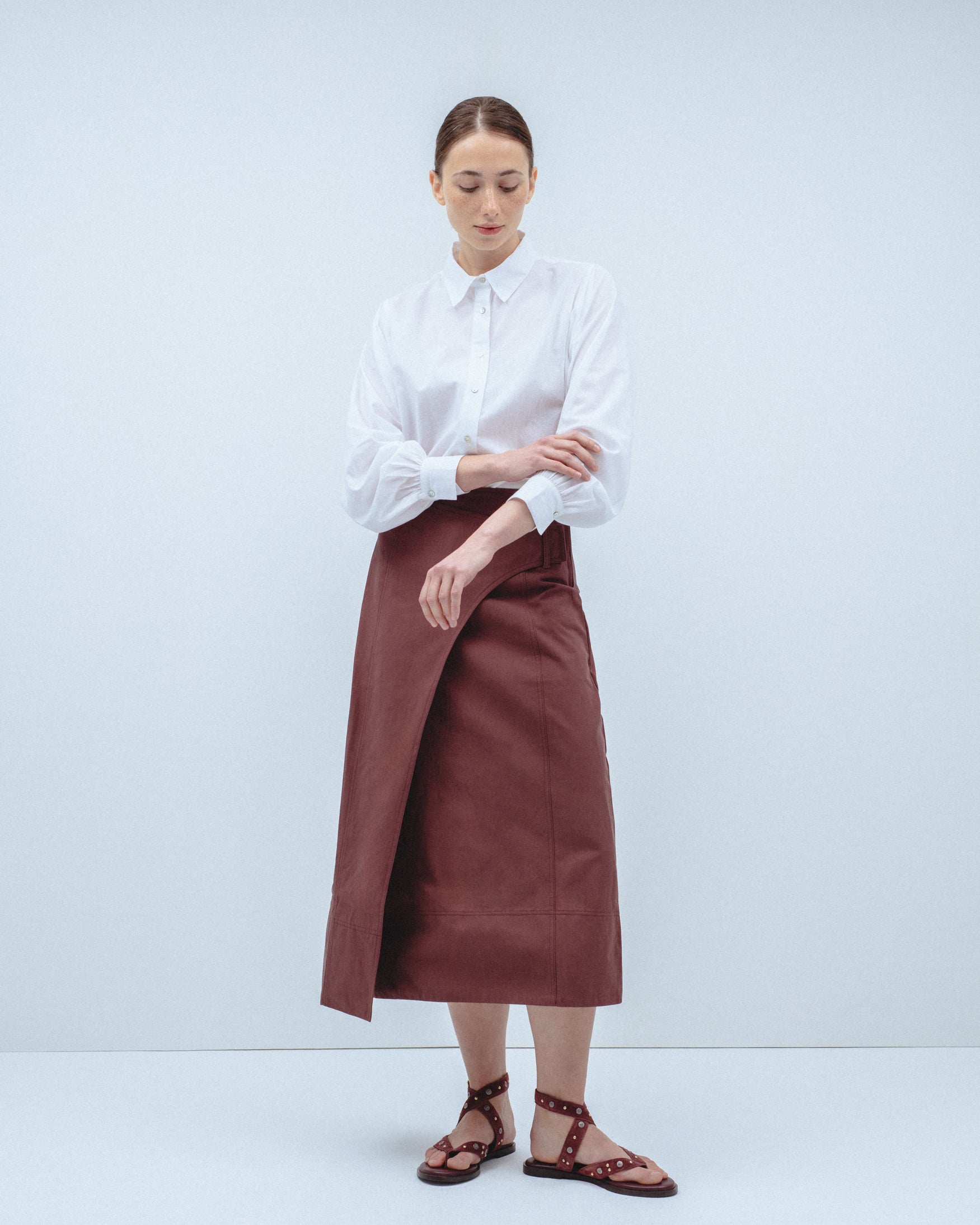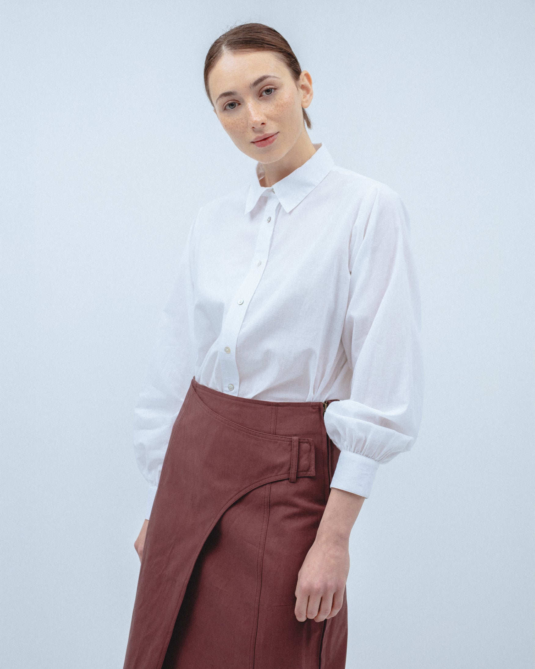 Camisa de cuello solapa y manga larga acabada en puño elástico con detalle de frunces. Bajo con aberturas laterales. Cierre frontal con botones.