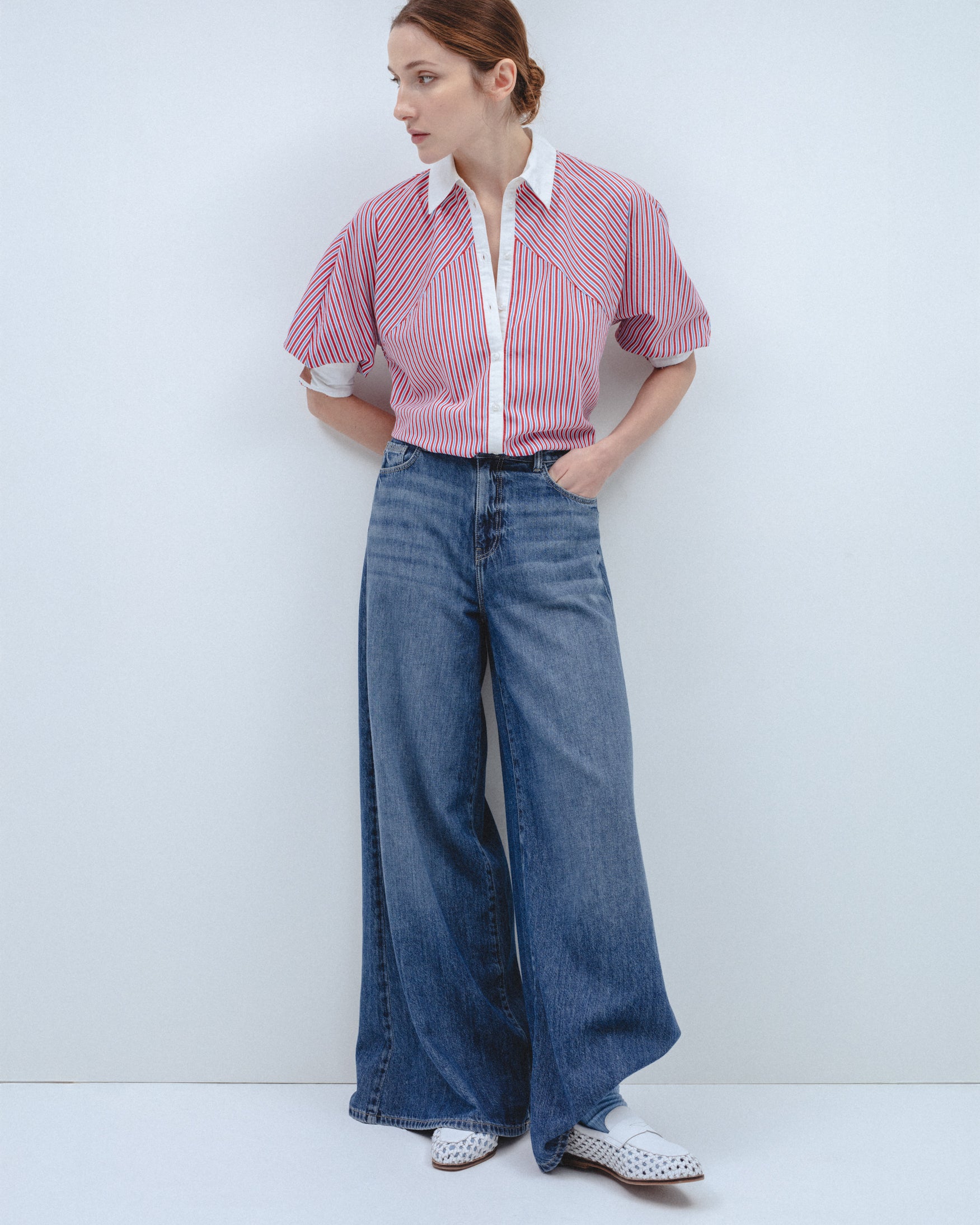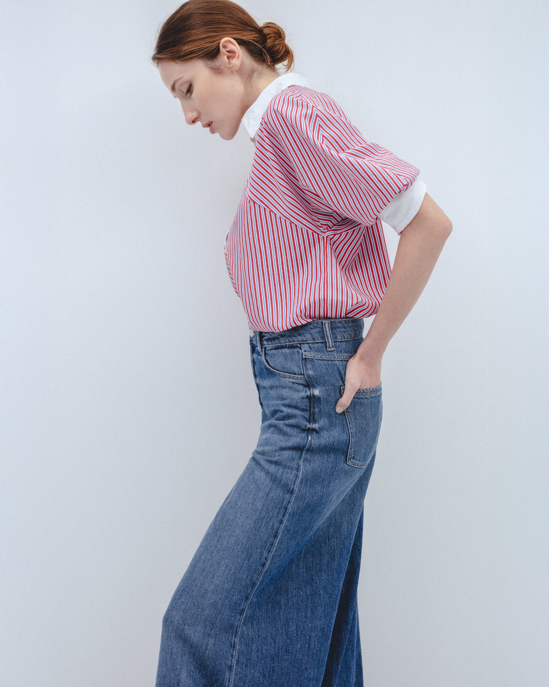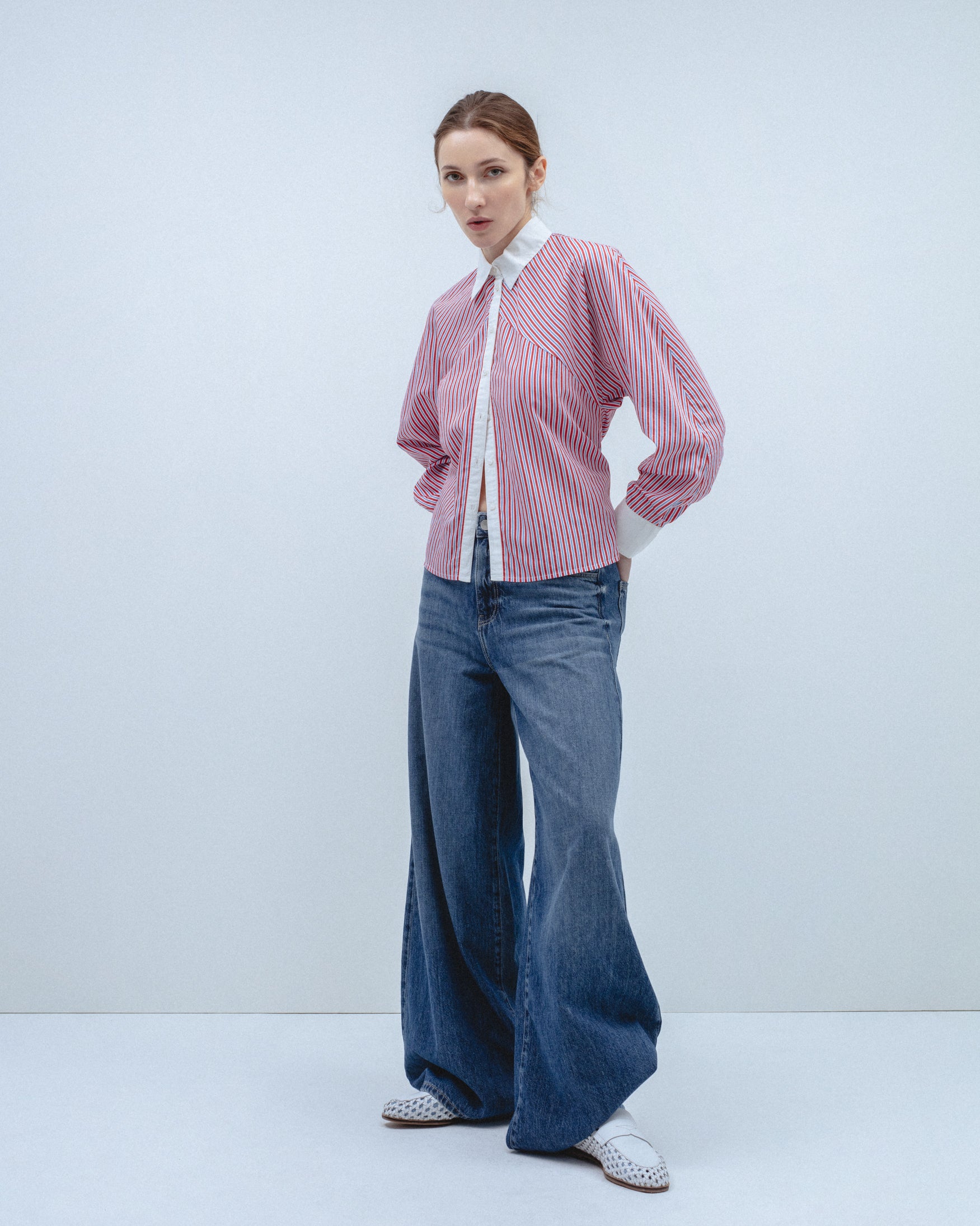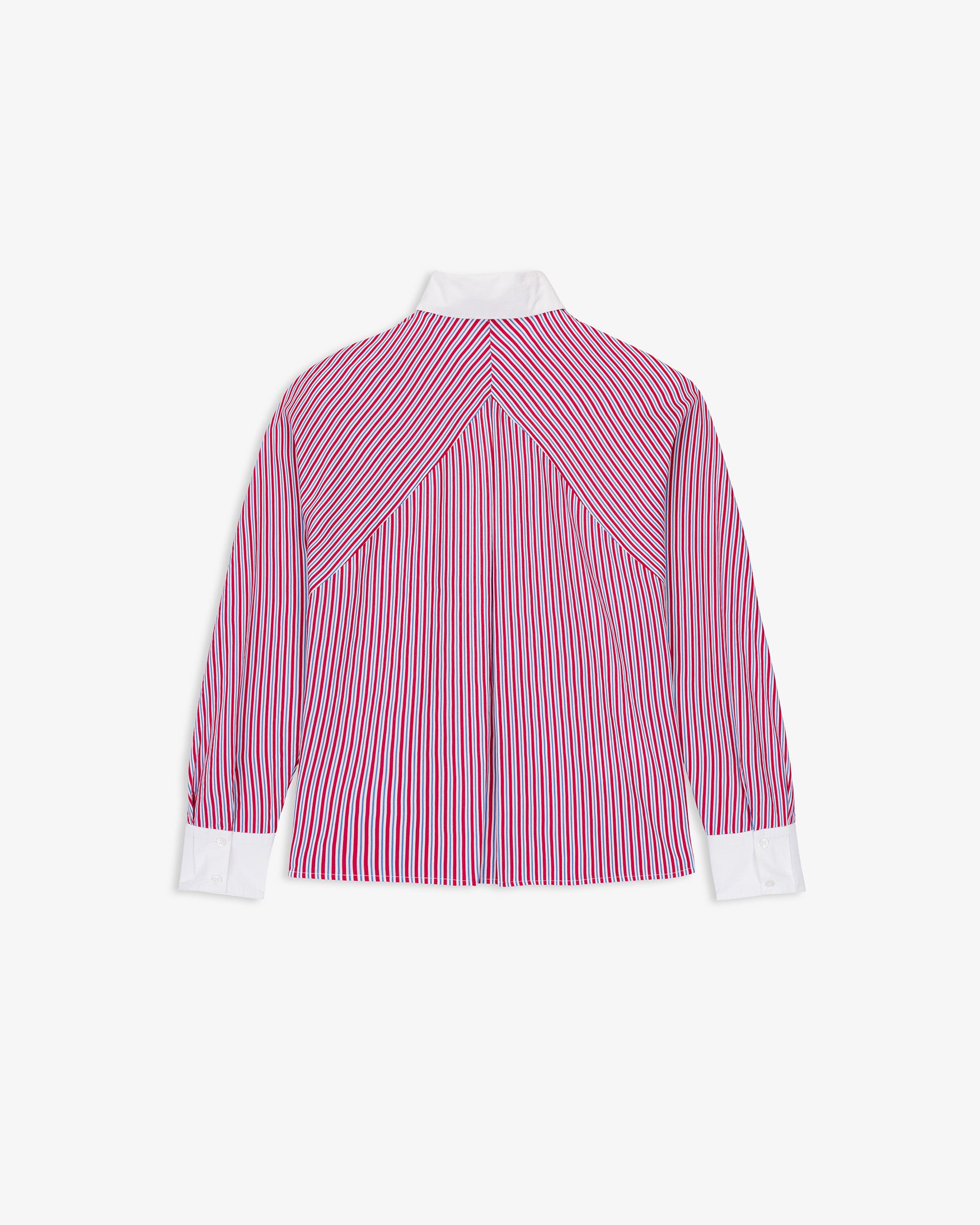 Camisa de cuello solapa a contraste y manga larga acabada en puño. Detalle de canesú delantero con rayas en posición oblicua. Cierre frontal con botones.