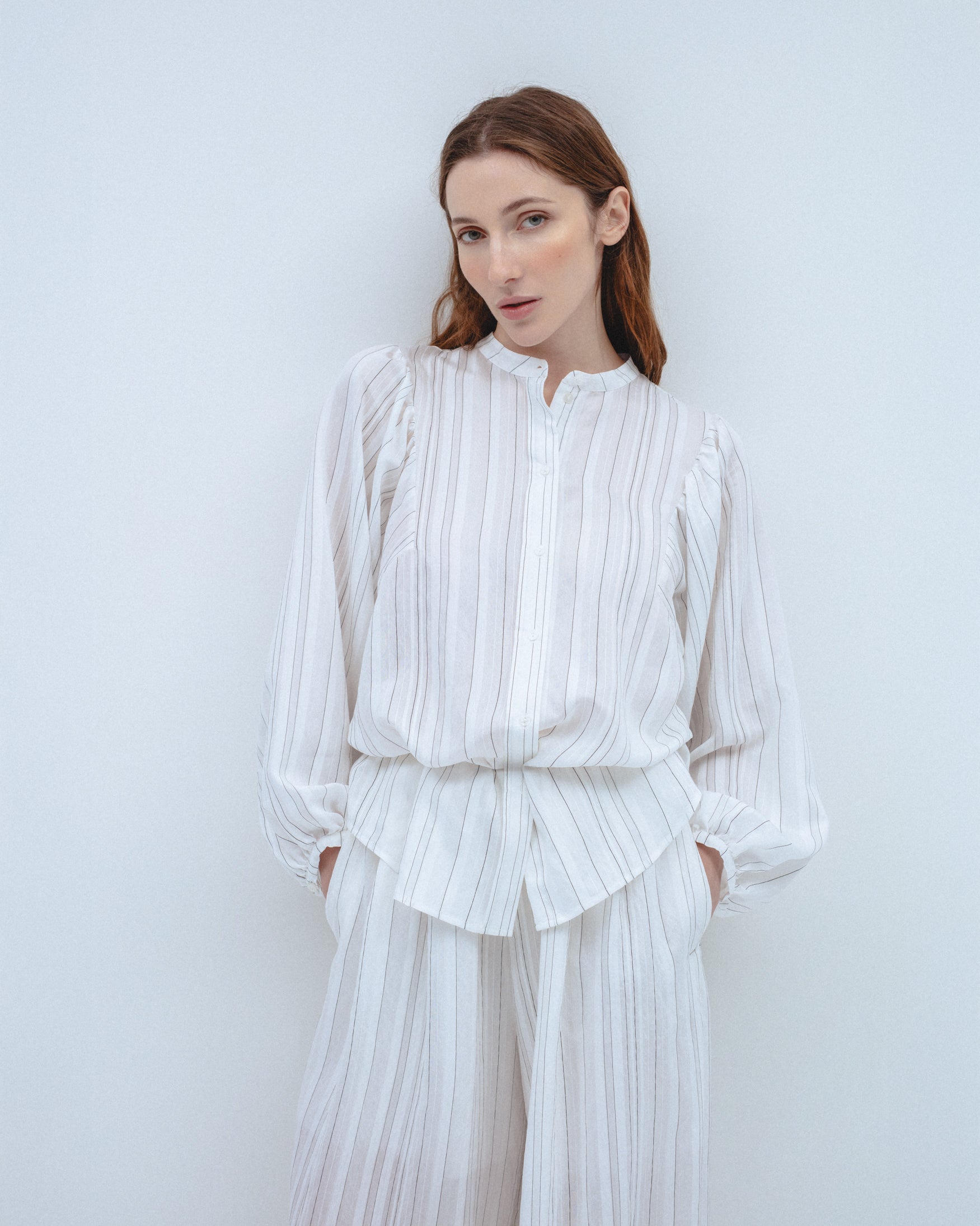 Camisa de cuello subido y manga larga acabada en puño con elástico. Detalle de tejido con estructura de rayas verticales. Cierre frontal con botones.