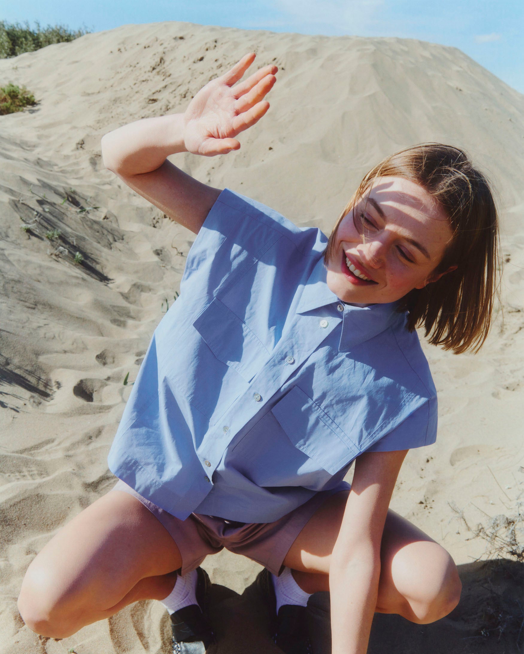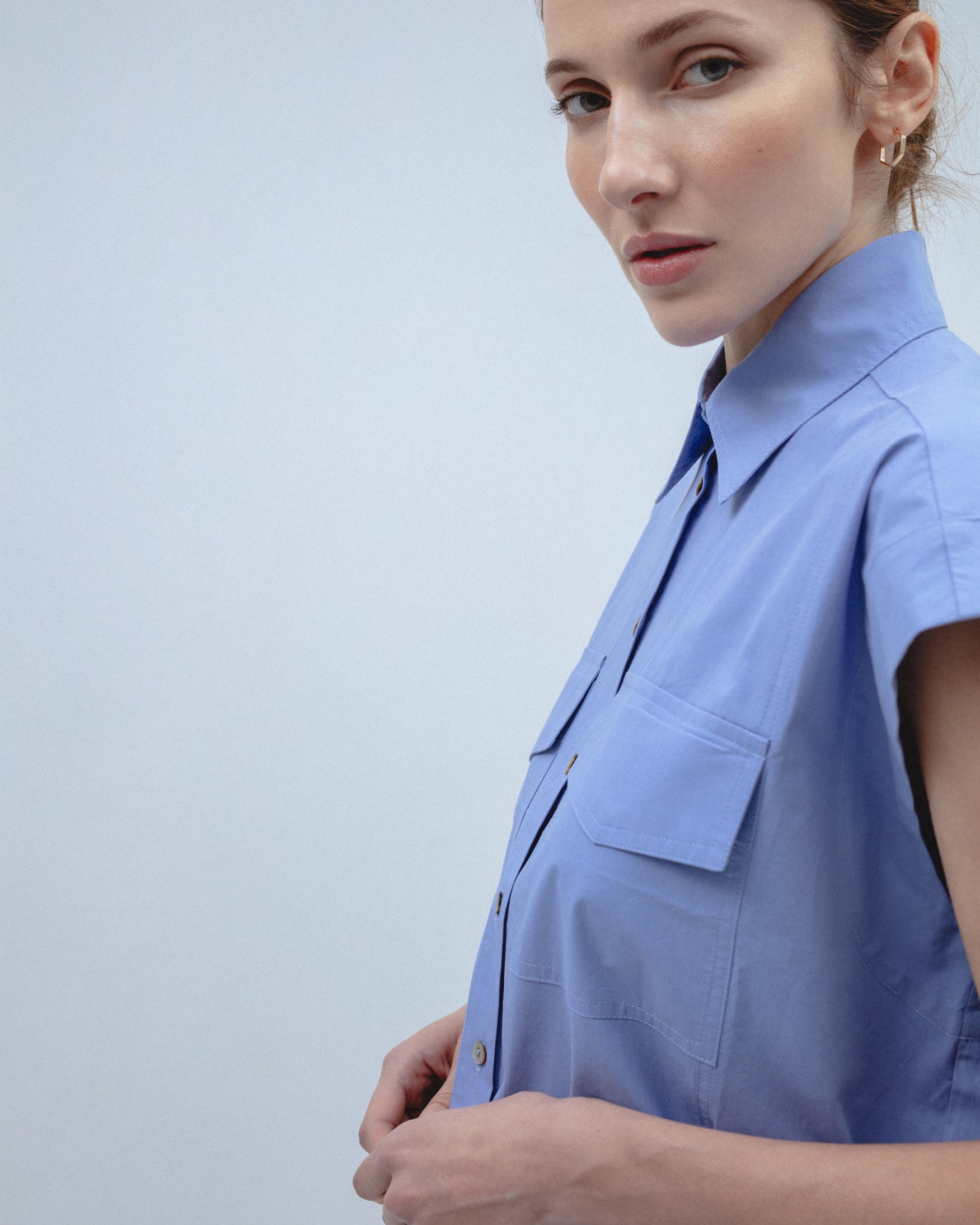 Camisa de cuello solapa y manga corta caída con efecto de hombro marcado. Detalle de bolsillos de plastrón con solapa en delantero. Cierre frontal con botones a contraste. Bajo recto y silueta de corte holgado. Confeccionada en tejido con cuerpo de acabado suave.