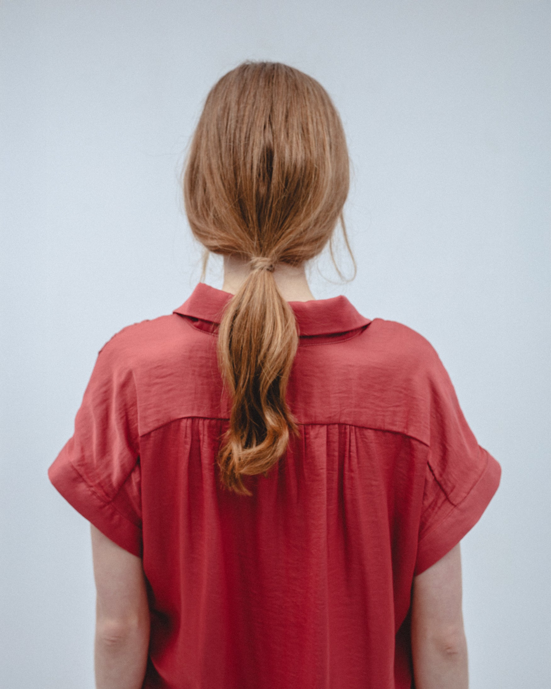 Camisa de cuello solapa y manga corta acabada en vuelta. Detalle de pliegues en canesú delantero y espalda que aportan volumen. Cierre frontal con botones a contraste. Bajo con aberturas laterales.