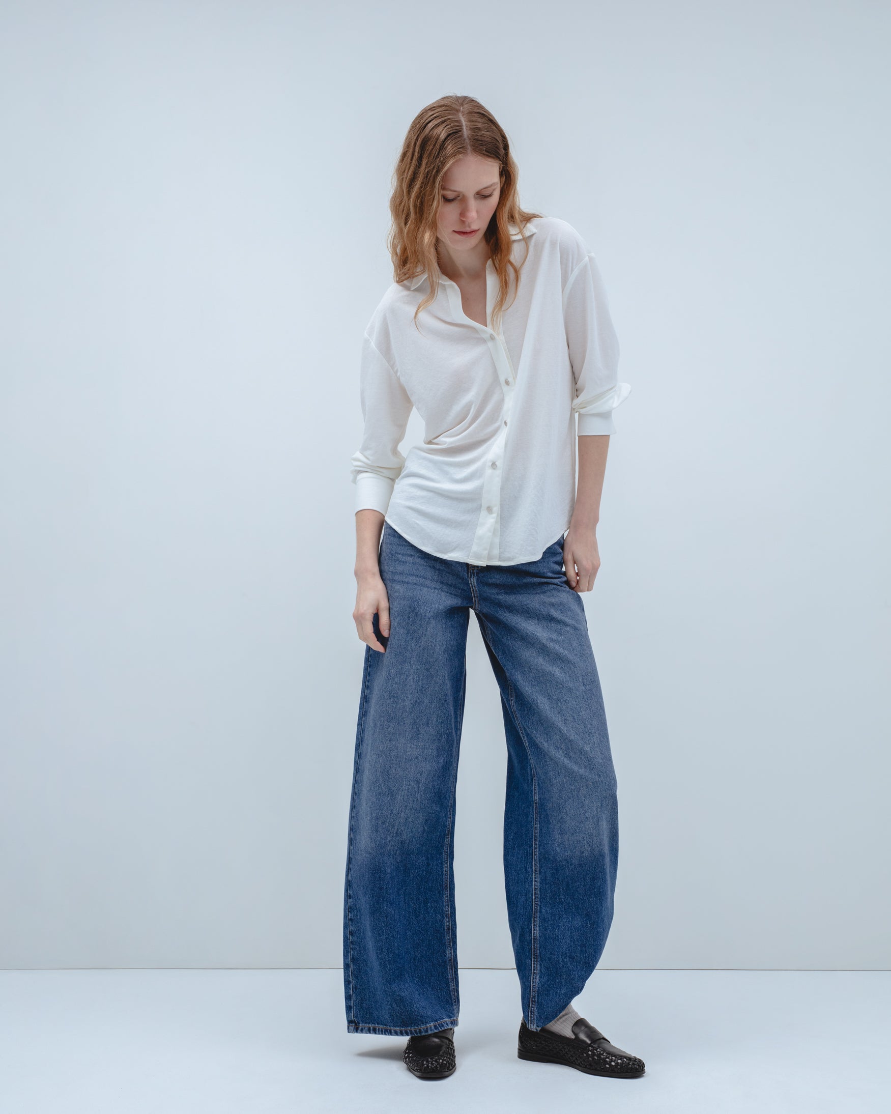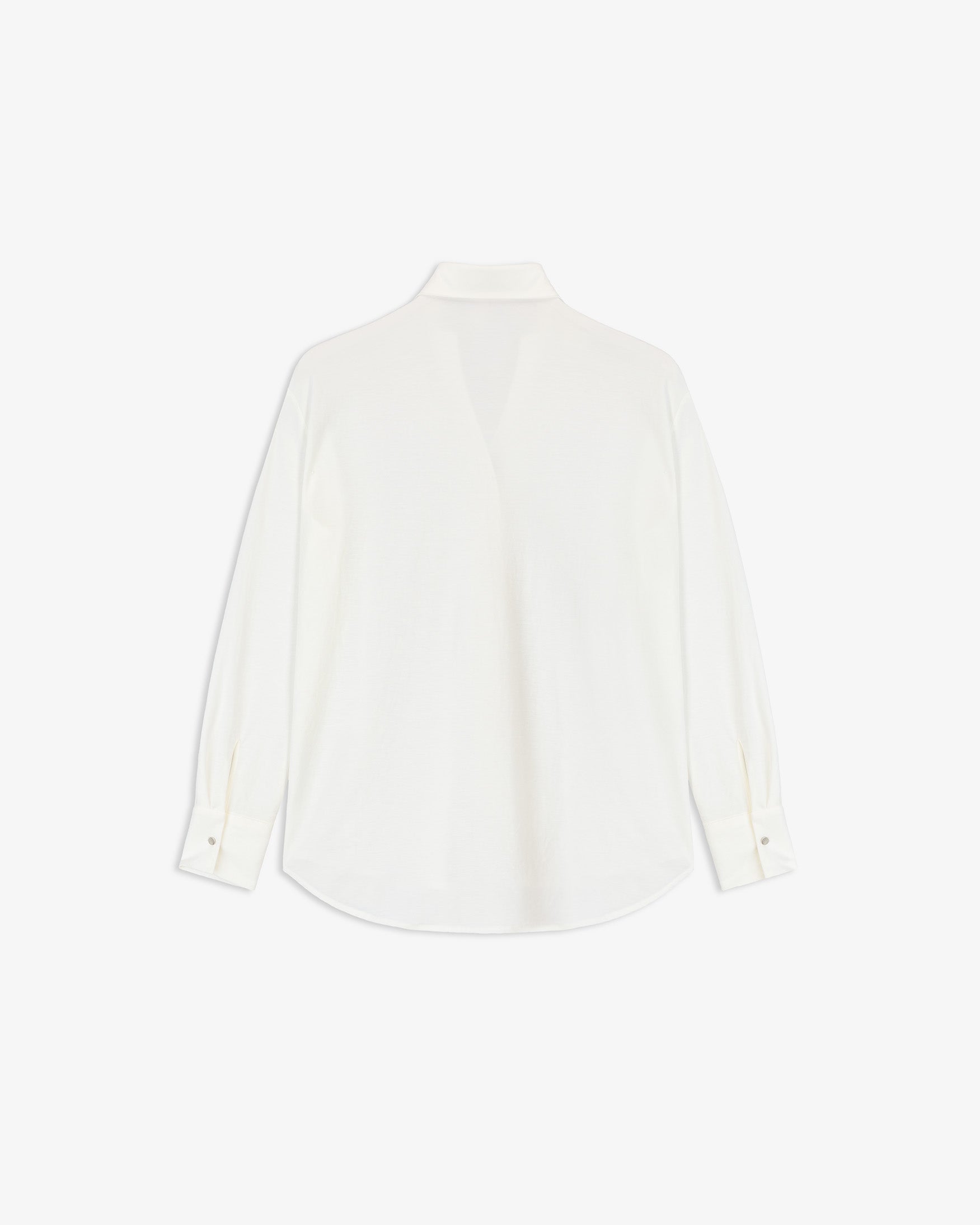 Camisa de cuello solapa con escote en pico y manga larga acabada en puño ancho. Detalle de cierre frontal con botones metálicos a presión.