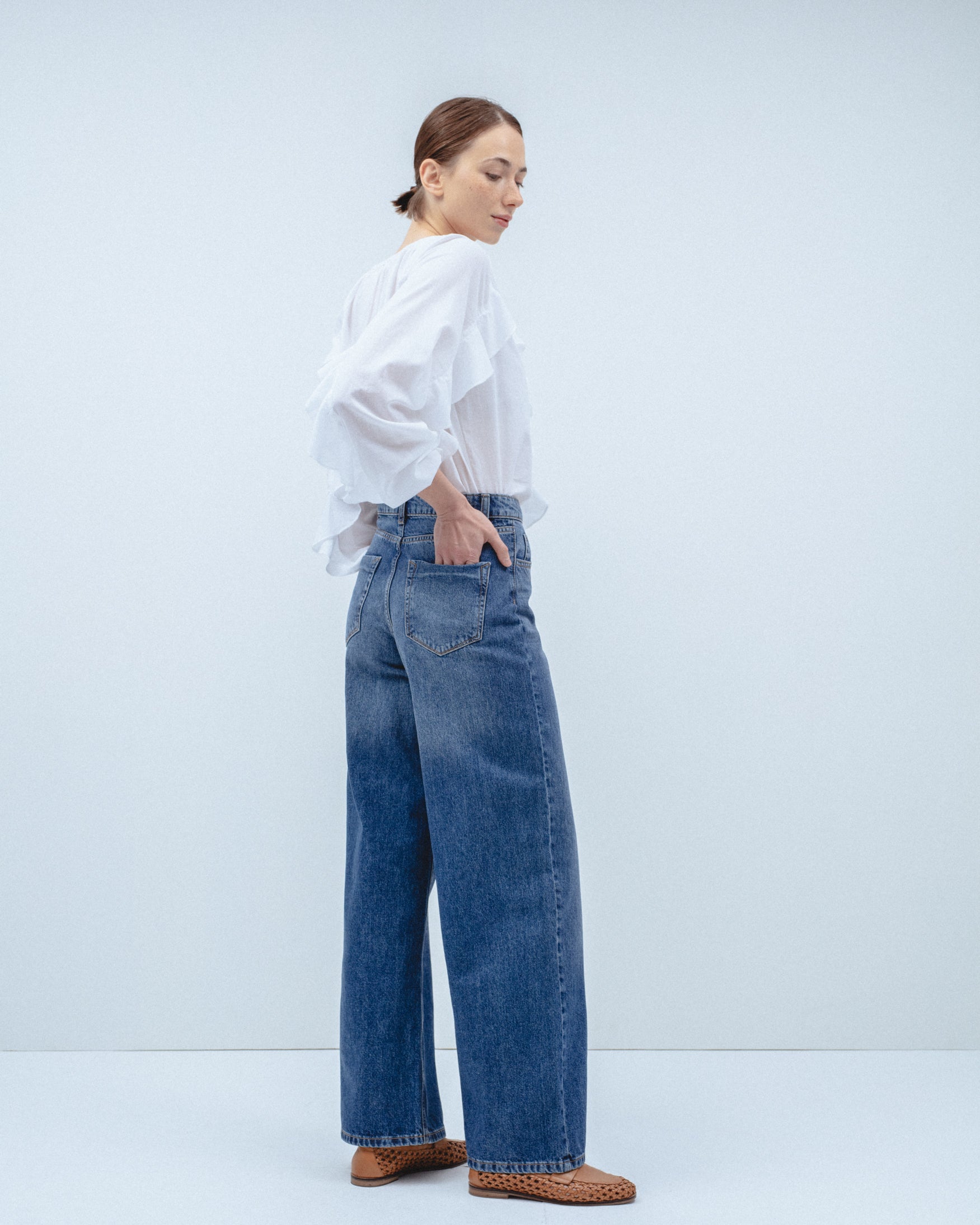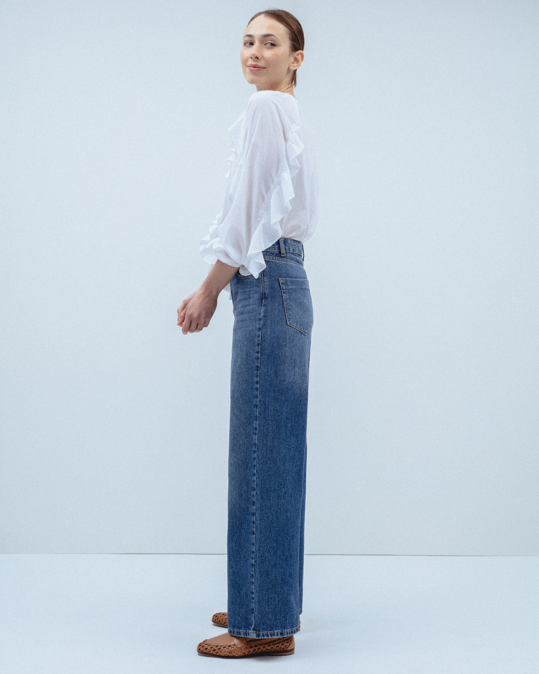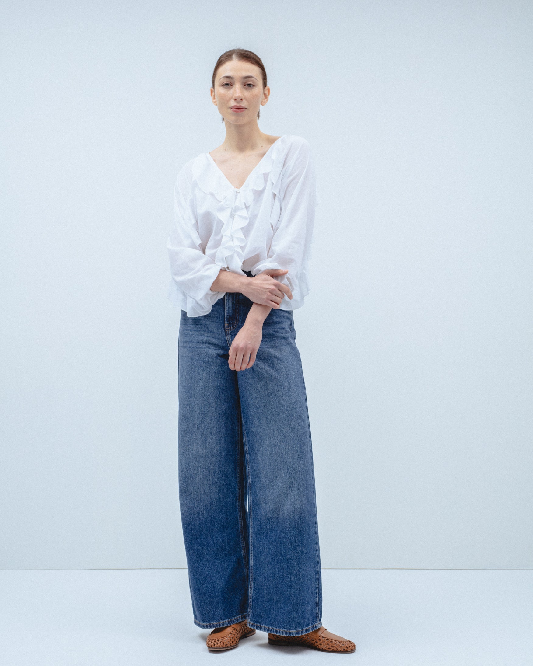 Camisa de escote pico y manga larga acabada en elástico. Detalle de volantes combinados a tono en delantero y espalda.