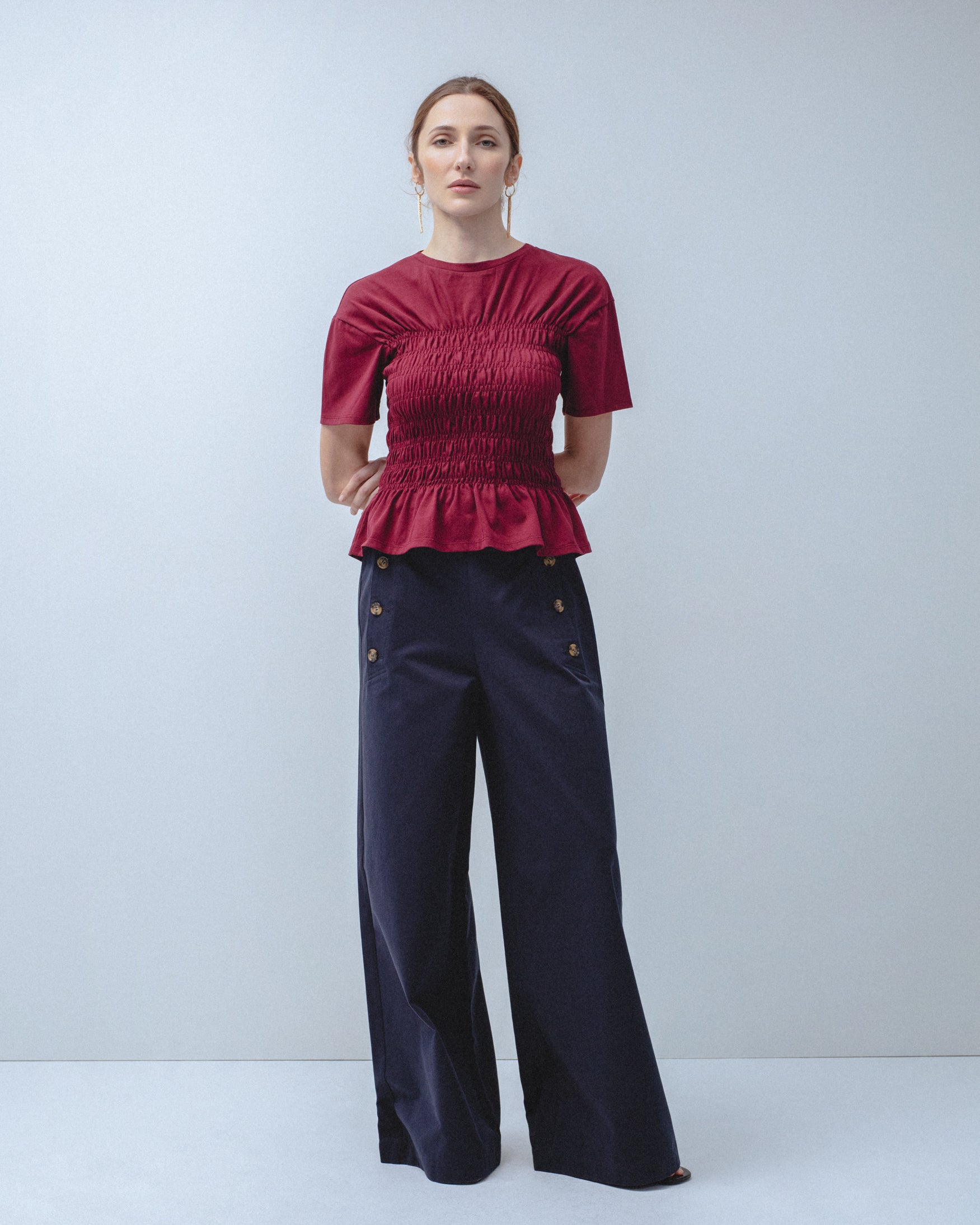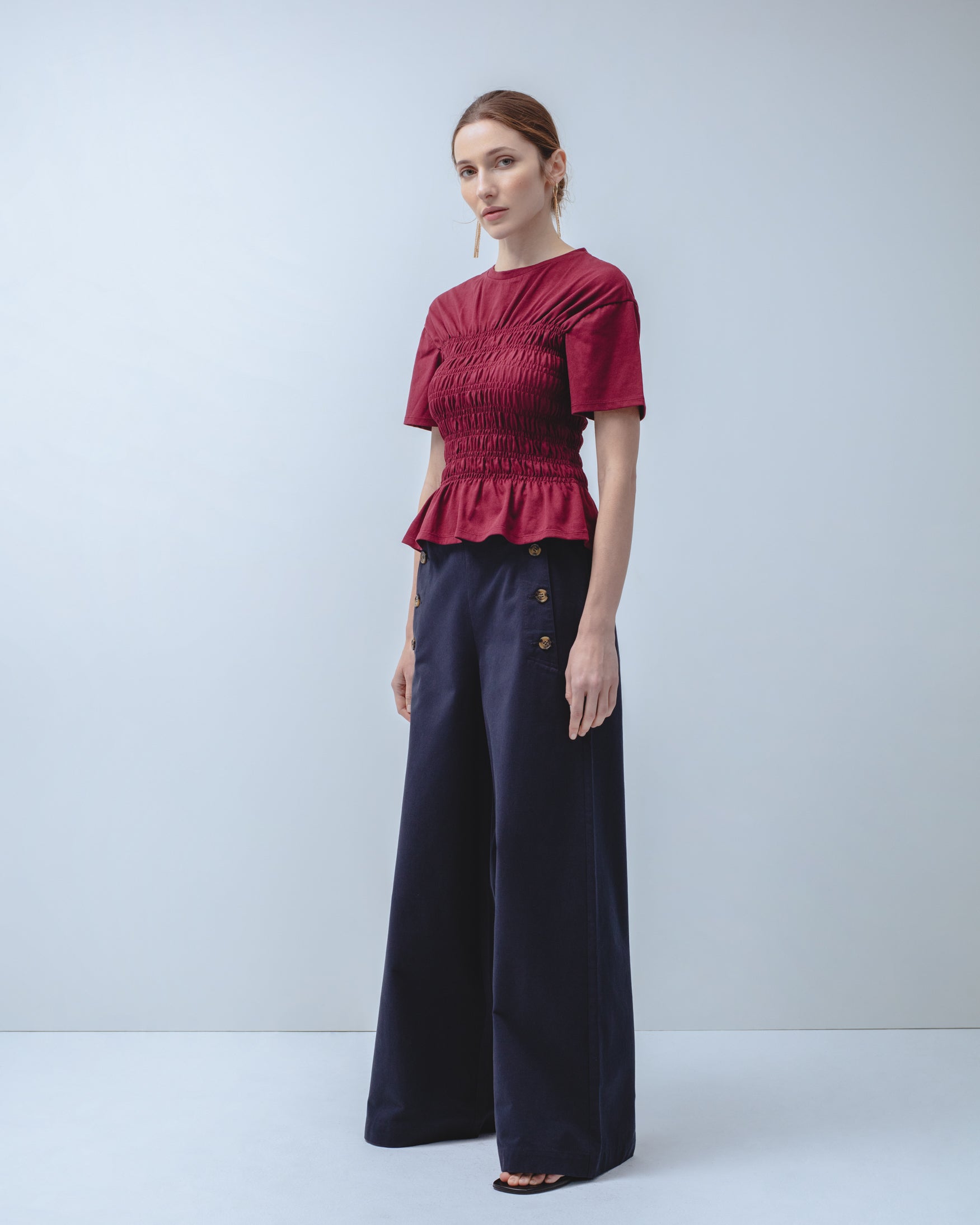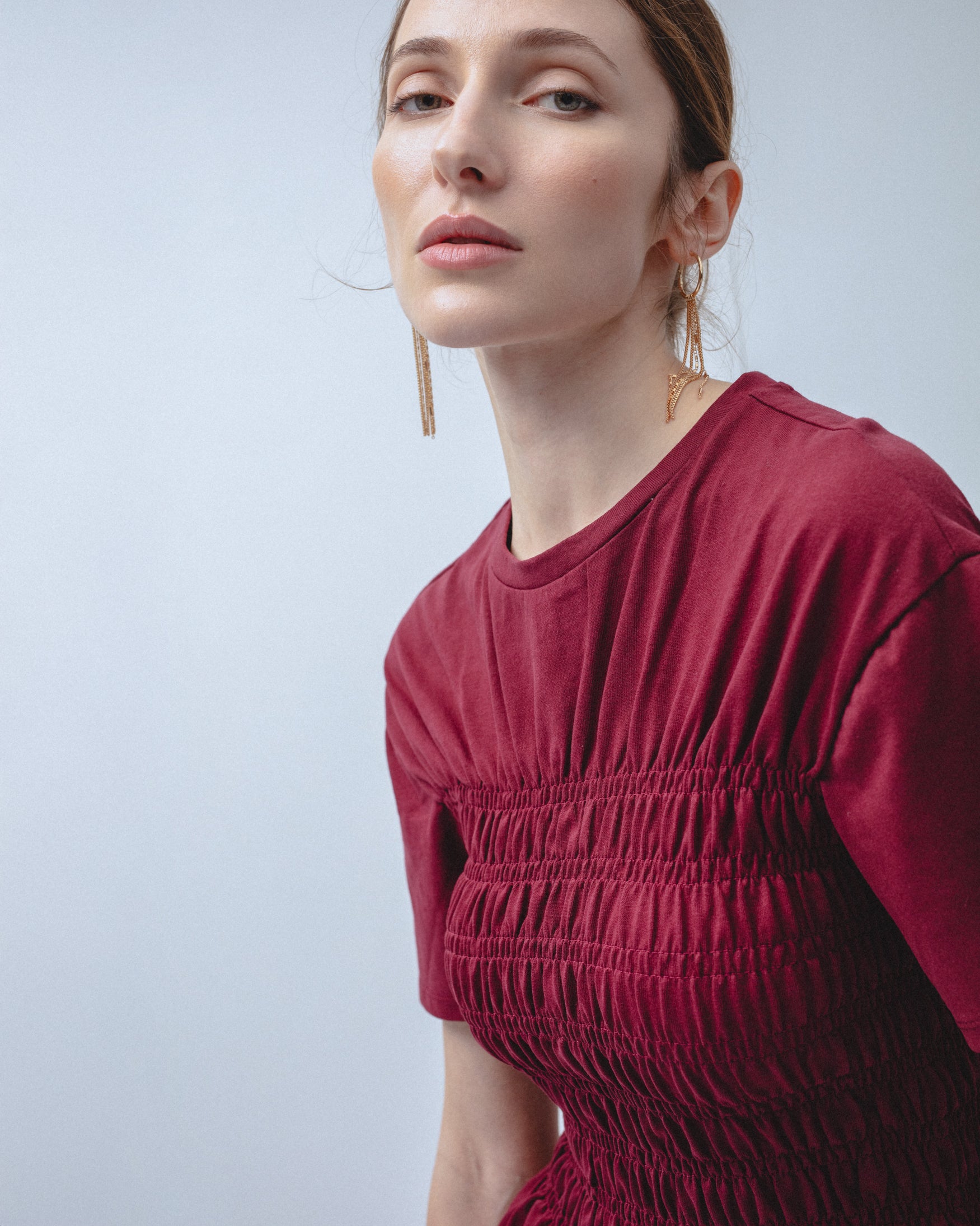 Camiseta confeccionada en 100% algodón. De cuello redondo y manga corta. Detalle de cuerpo elástico con fruncidos tipo nido de abeja en delantero y espalda. Bajo acabado en volante.