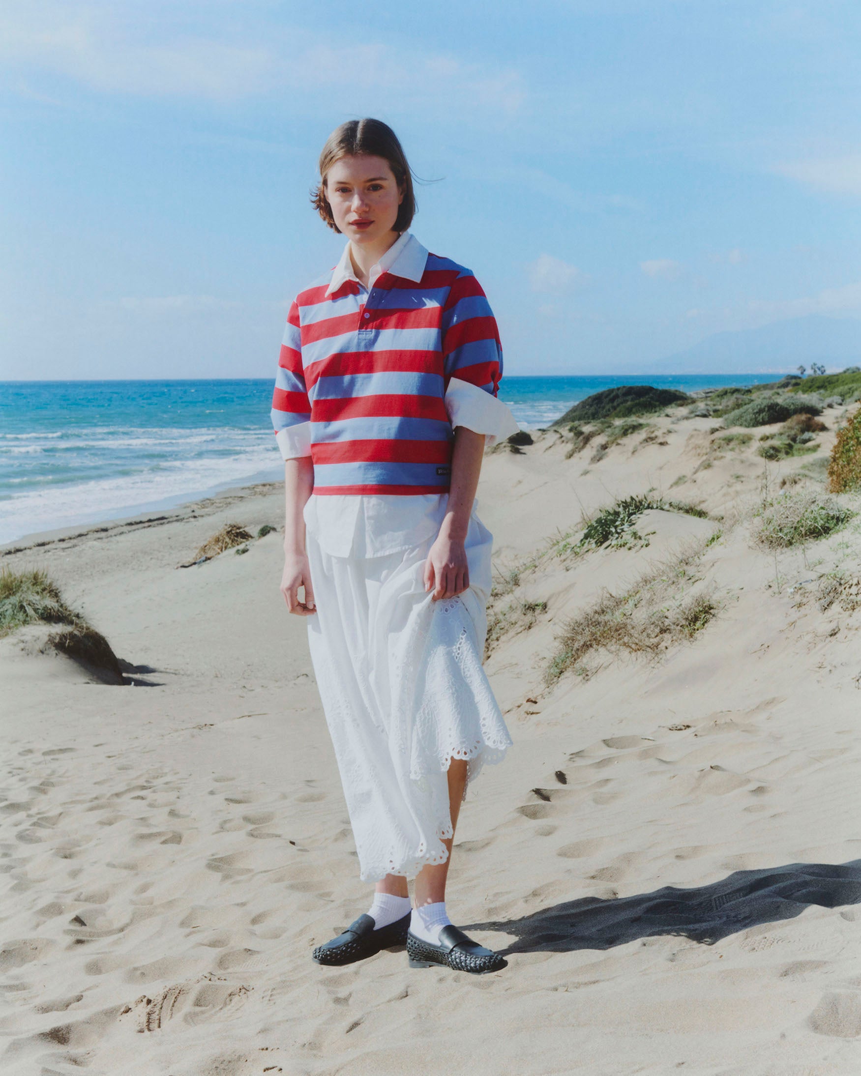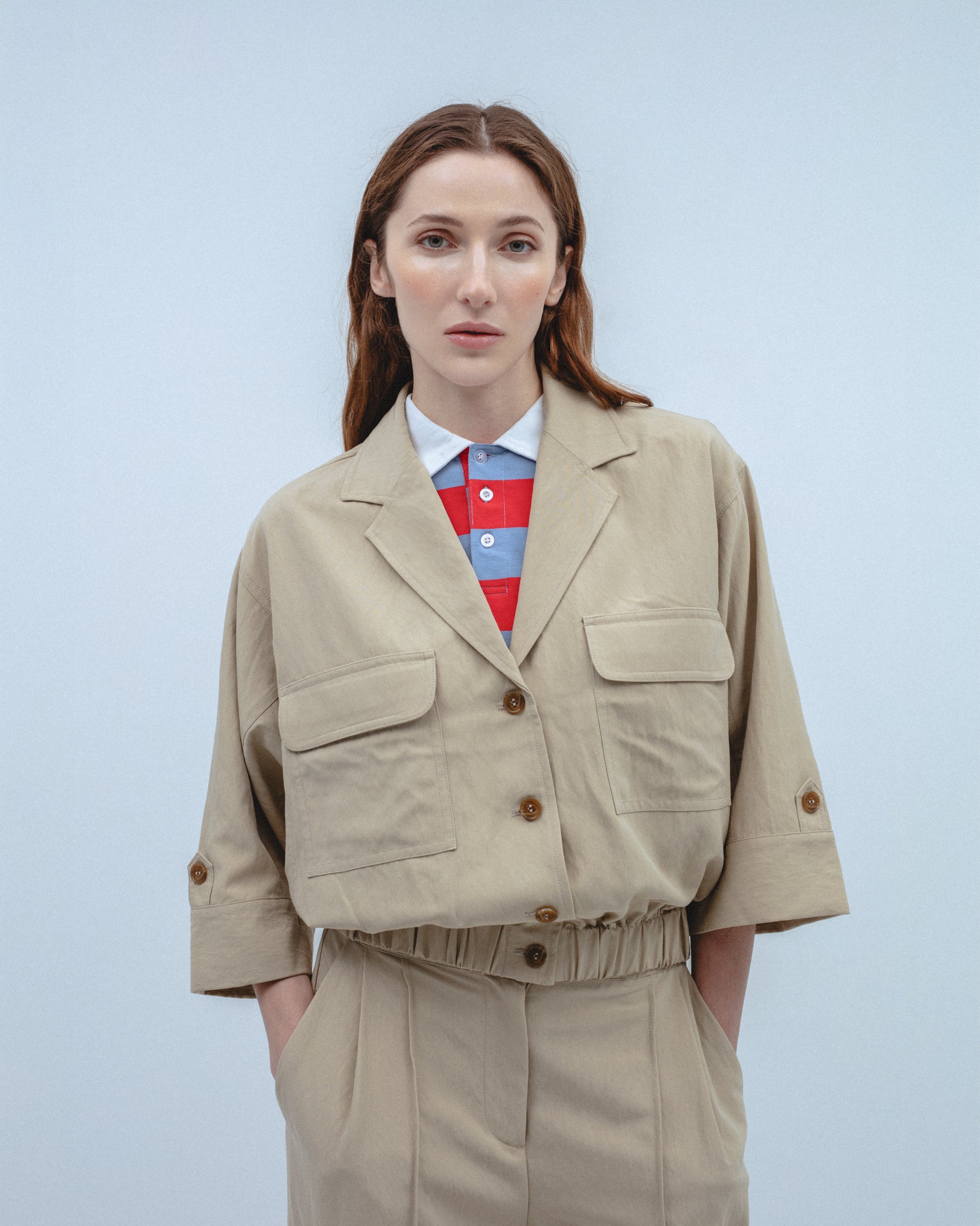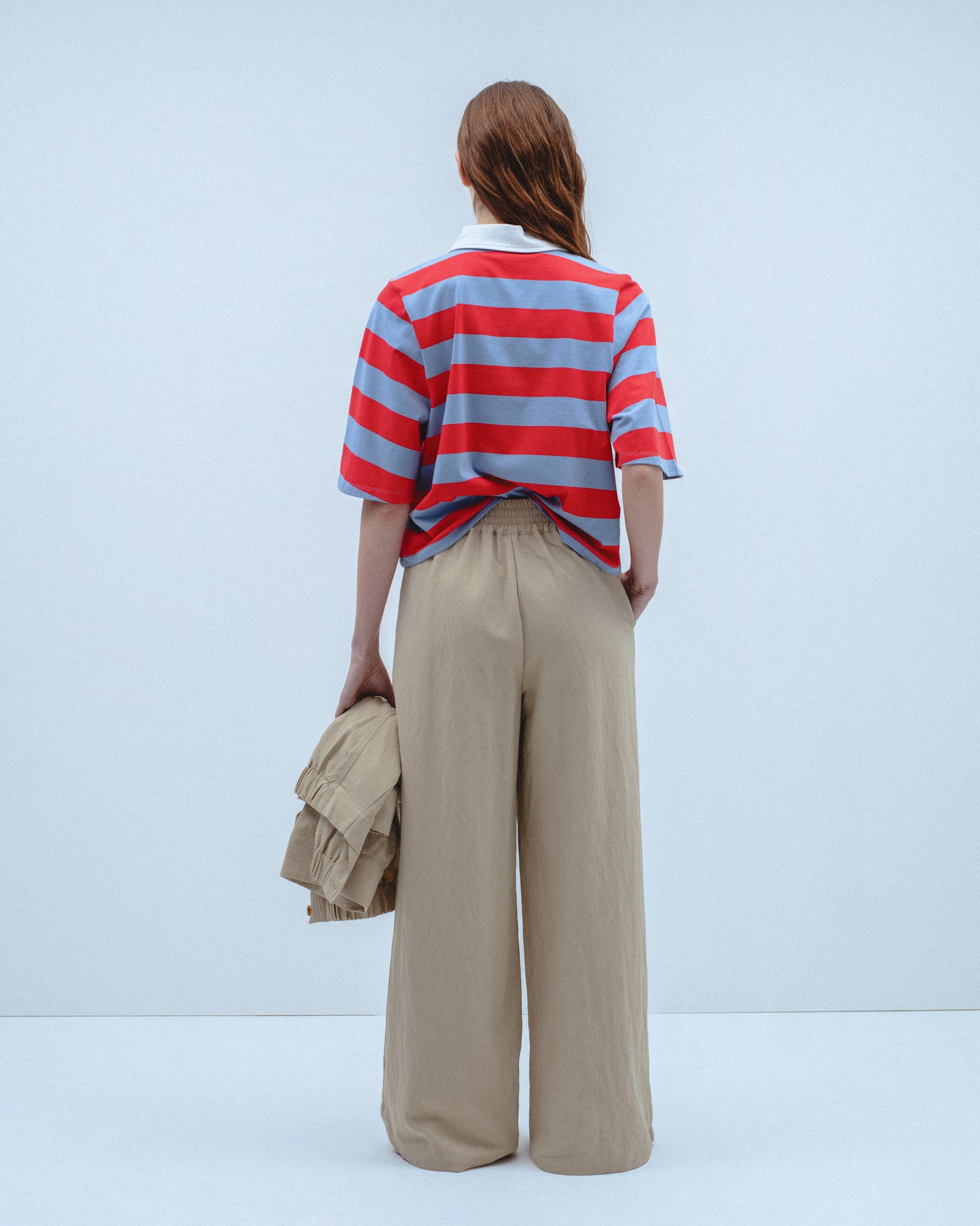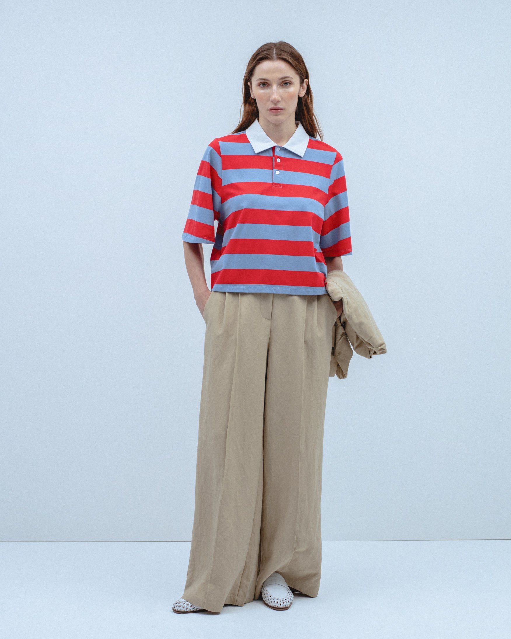 Polo de cuello solapa a contraste y manga corta acabada en sisa caída. Cierre frontal con botones.