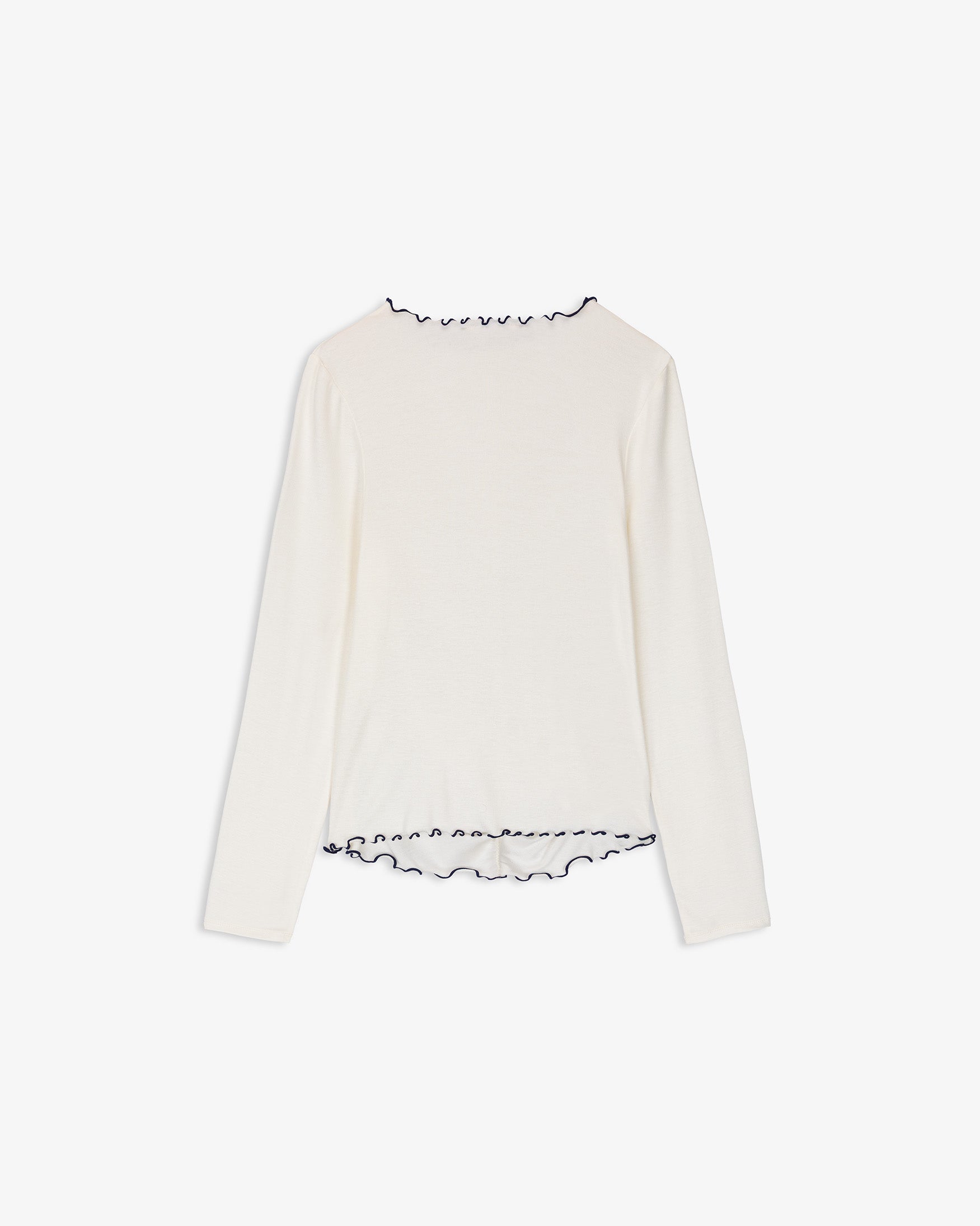 Camiseta confeccionada en tejido elástico de tacto suave. Diseño con fruncido central delantero que realza la silueta. Cuello redondo con acabado ondulado y bajo con detalle de volante. Manga larga. Ajuste slim fit.