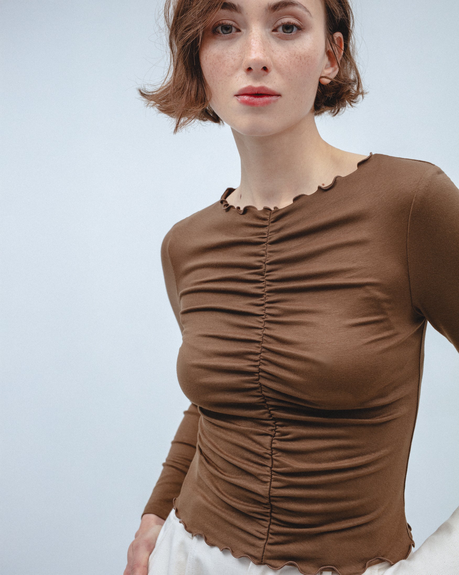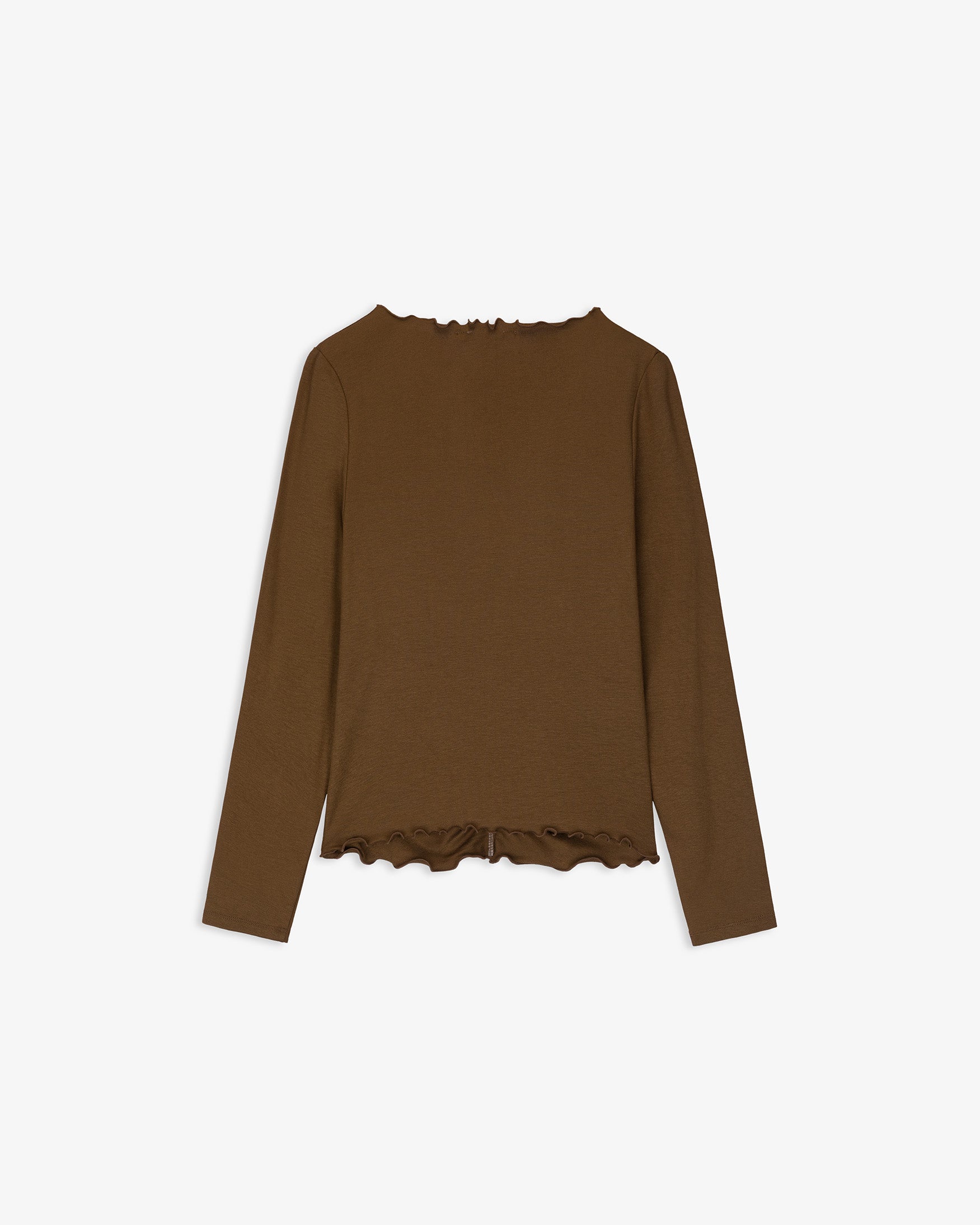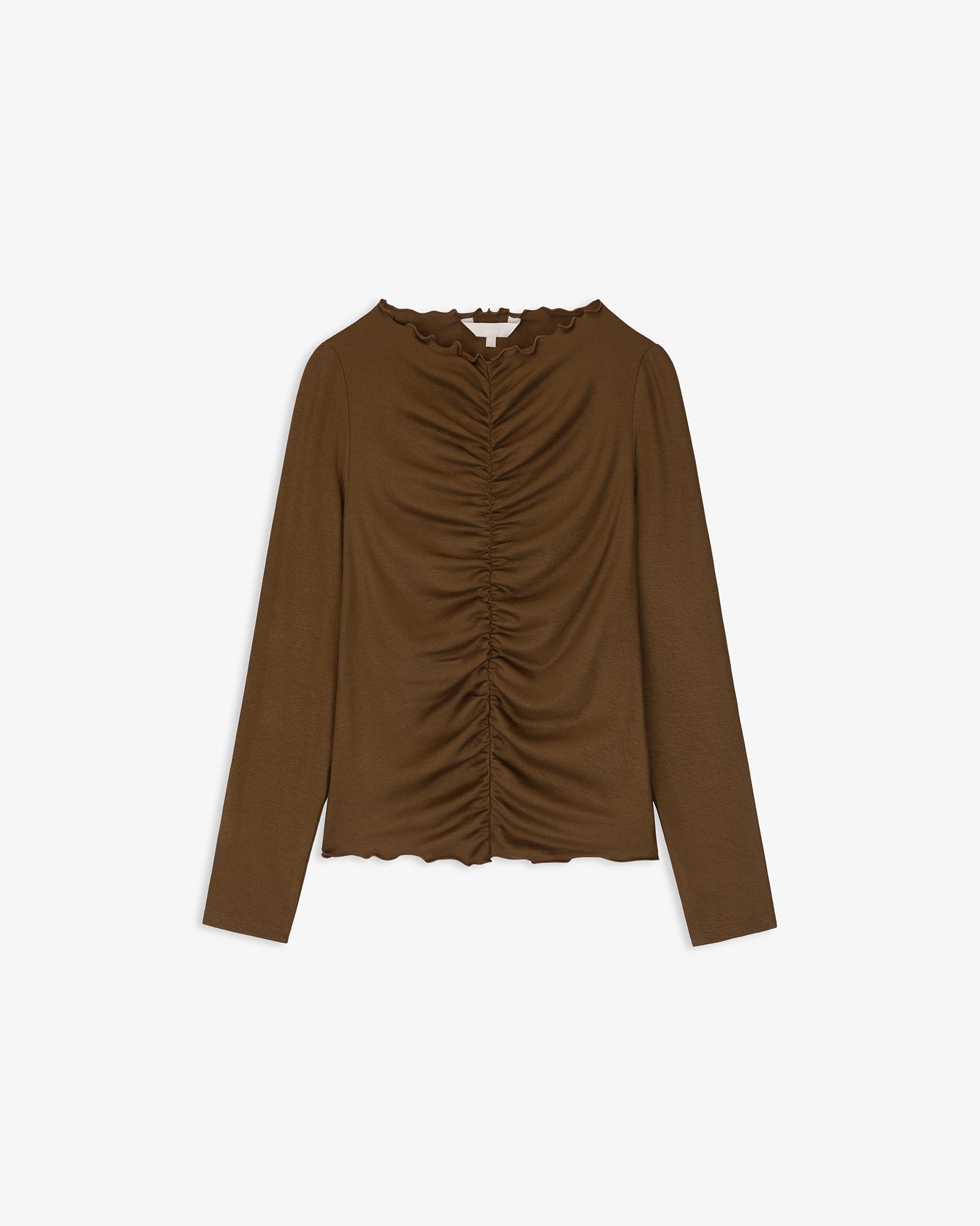 Camiseta confeccionada en tejido elástico de tacto suave. Diseño con fruncido central delantero que realza la silueta. Cuello redondo con acabado ondulado y bajo con detalle de volante. Manga larga. Ajuste slim fit.