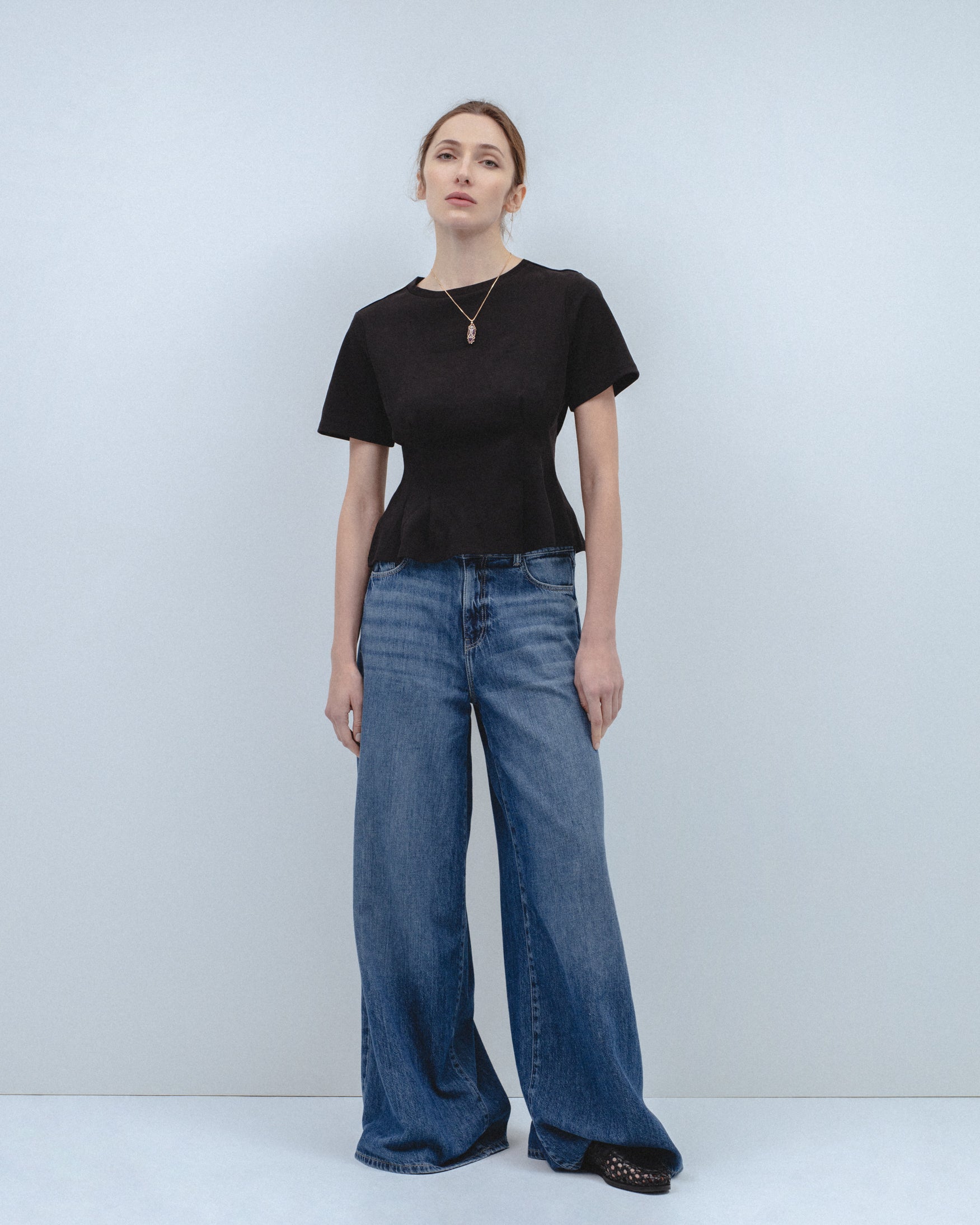 Camiseta de cuello redondo y manga corta. Detalle de costuras marcadas y pinzas frontales y en espalda que entallan la cintura y crean un bajo con ligero vuelo. Aplicación de etiqueta combinada a contraste en espalda.
