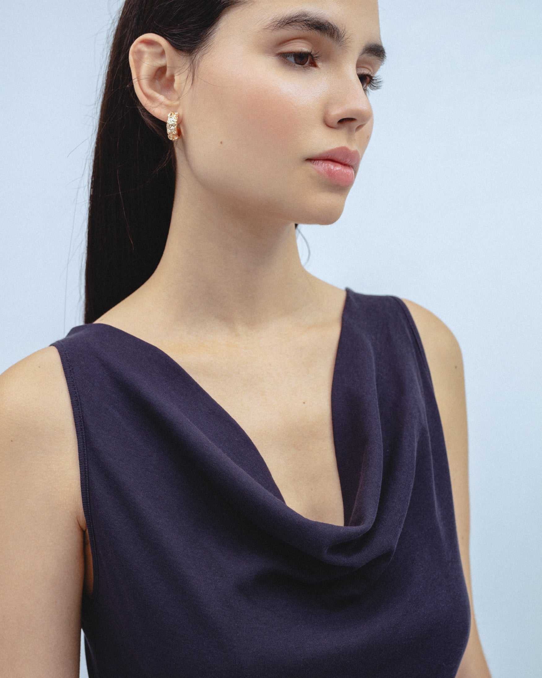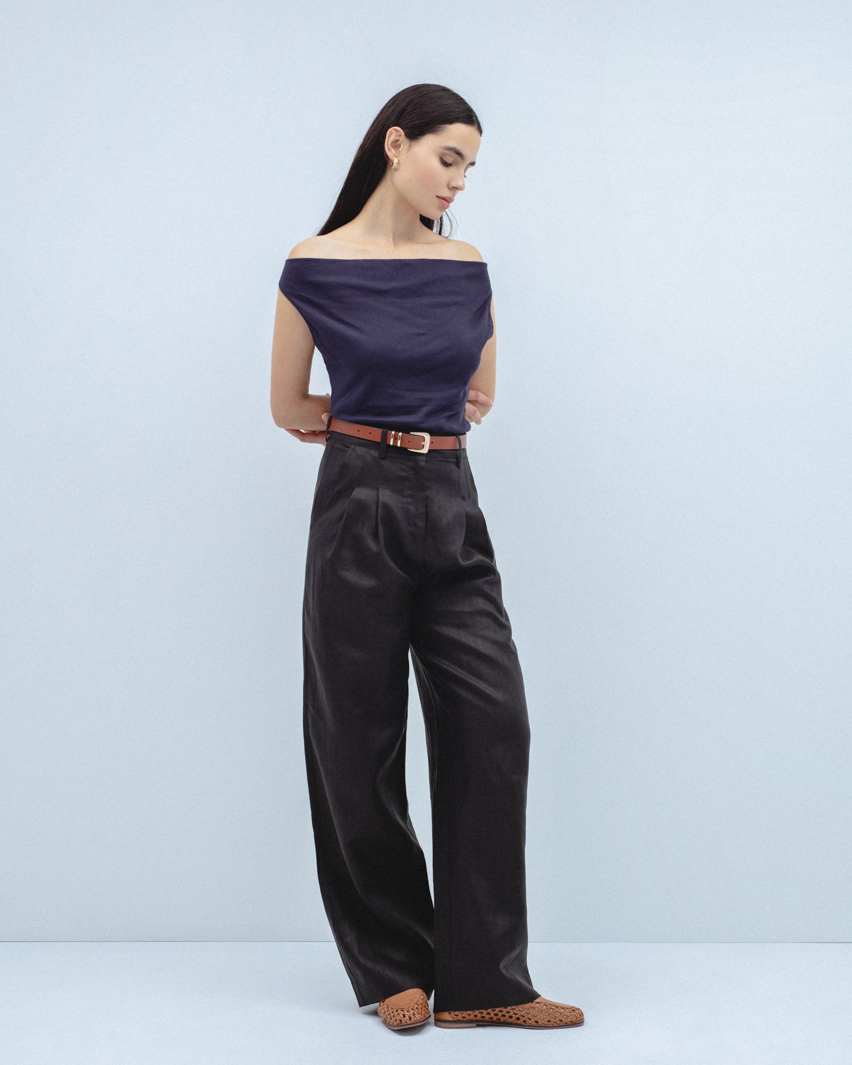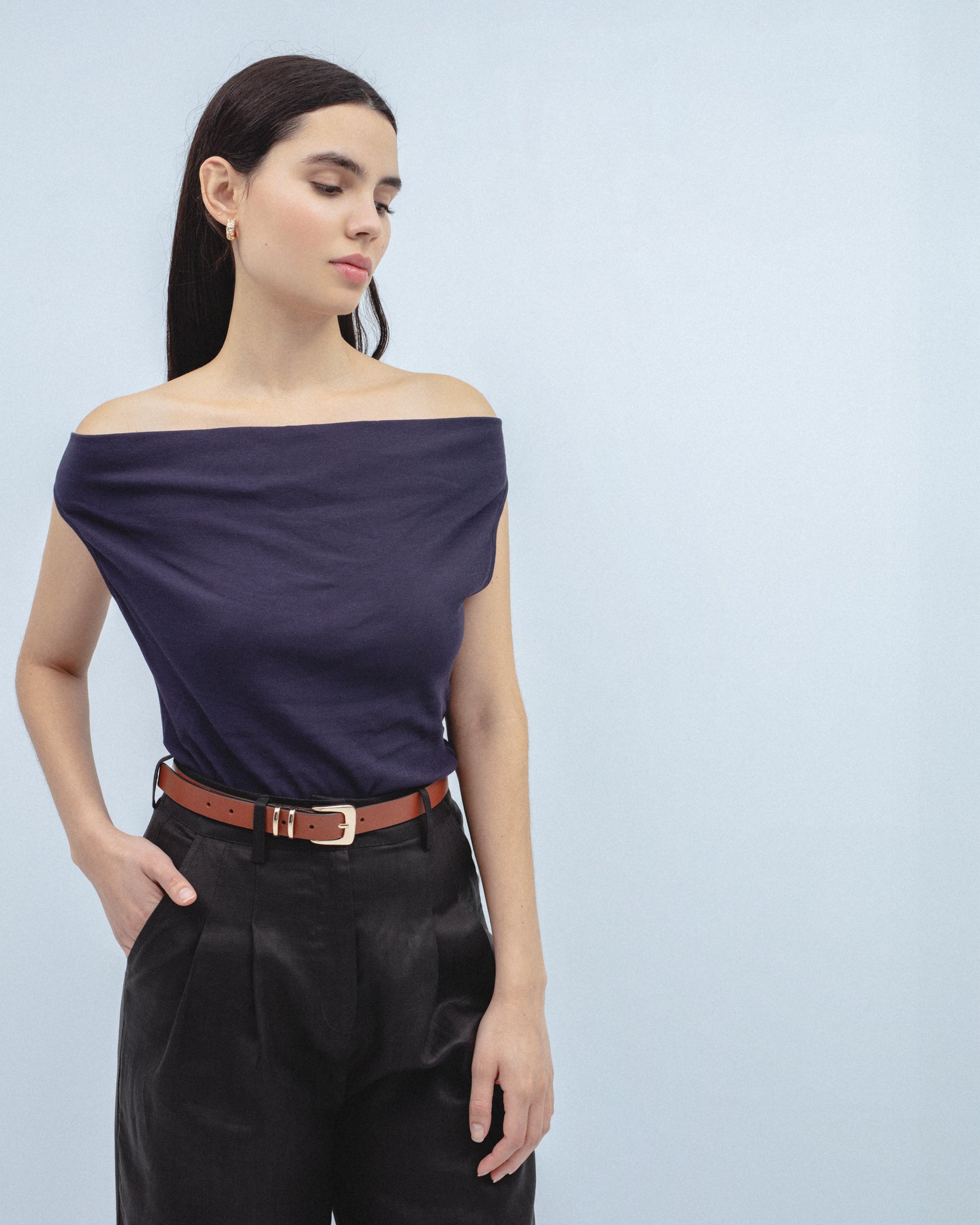 Camiseta de escote fluido desbocado y tirantes anchos. Bajo recto. Confeccionado en tejido de punto ligero con caída.