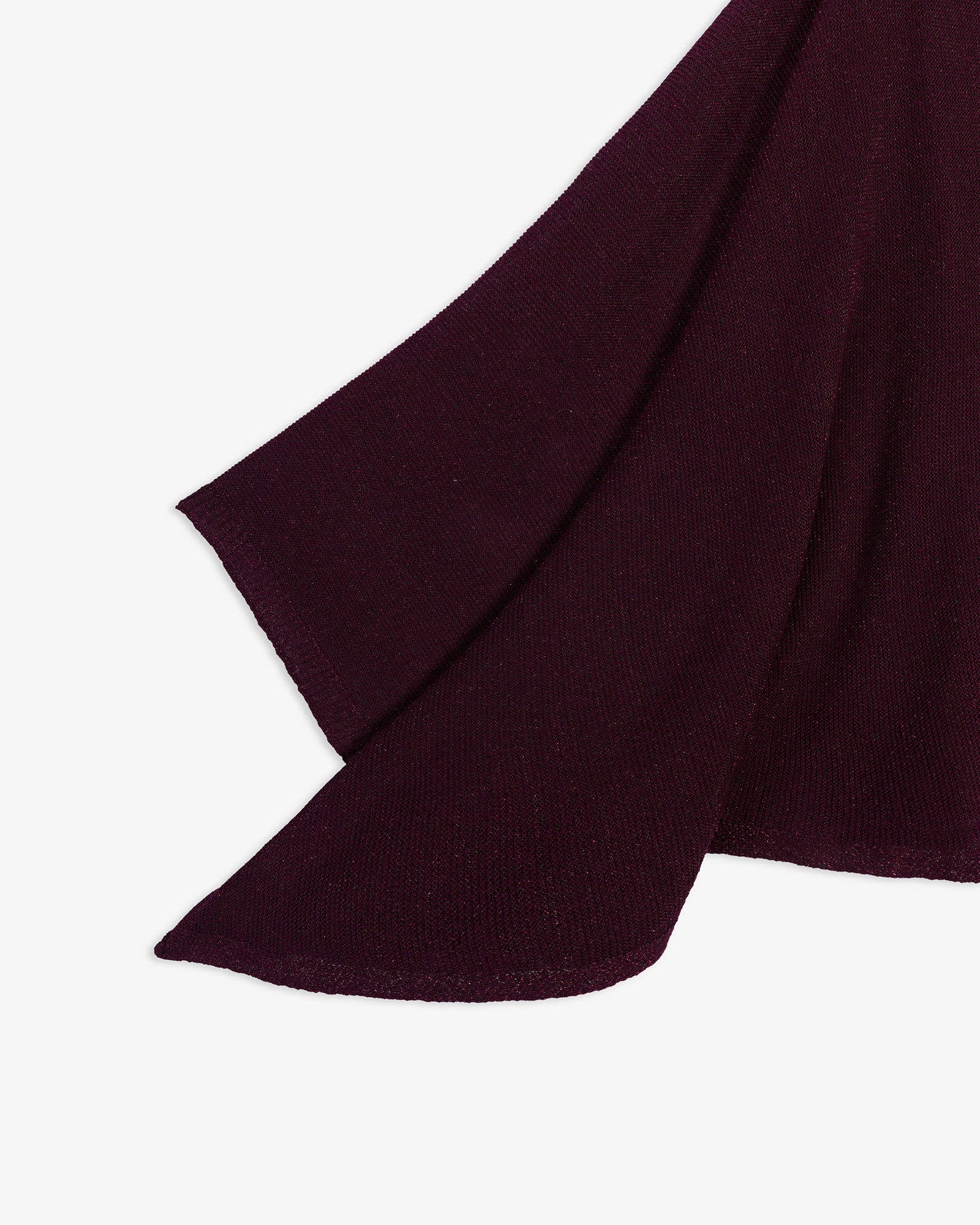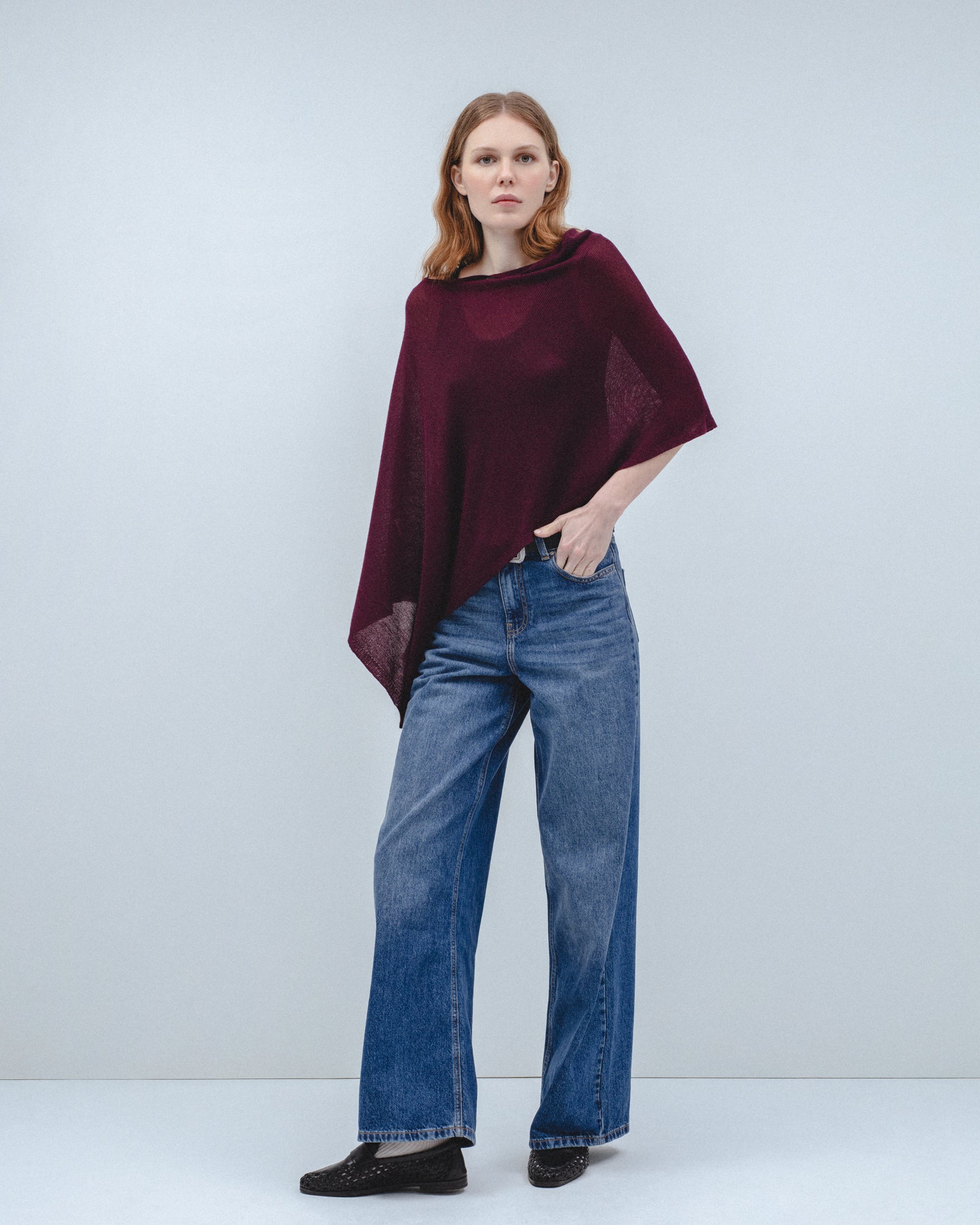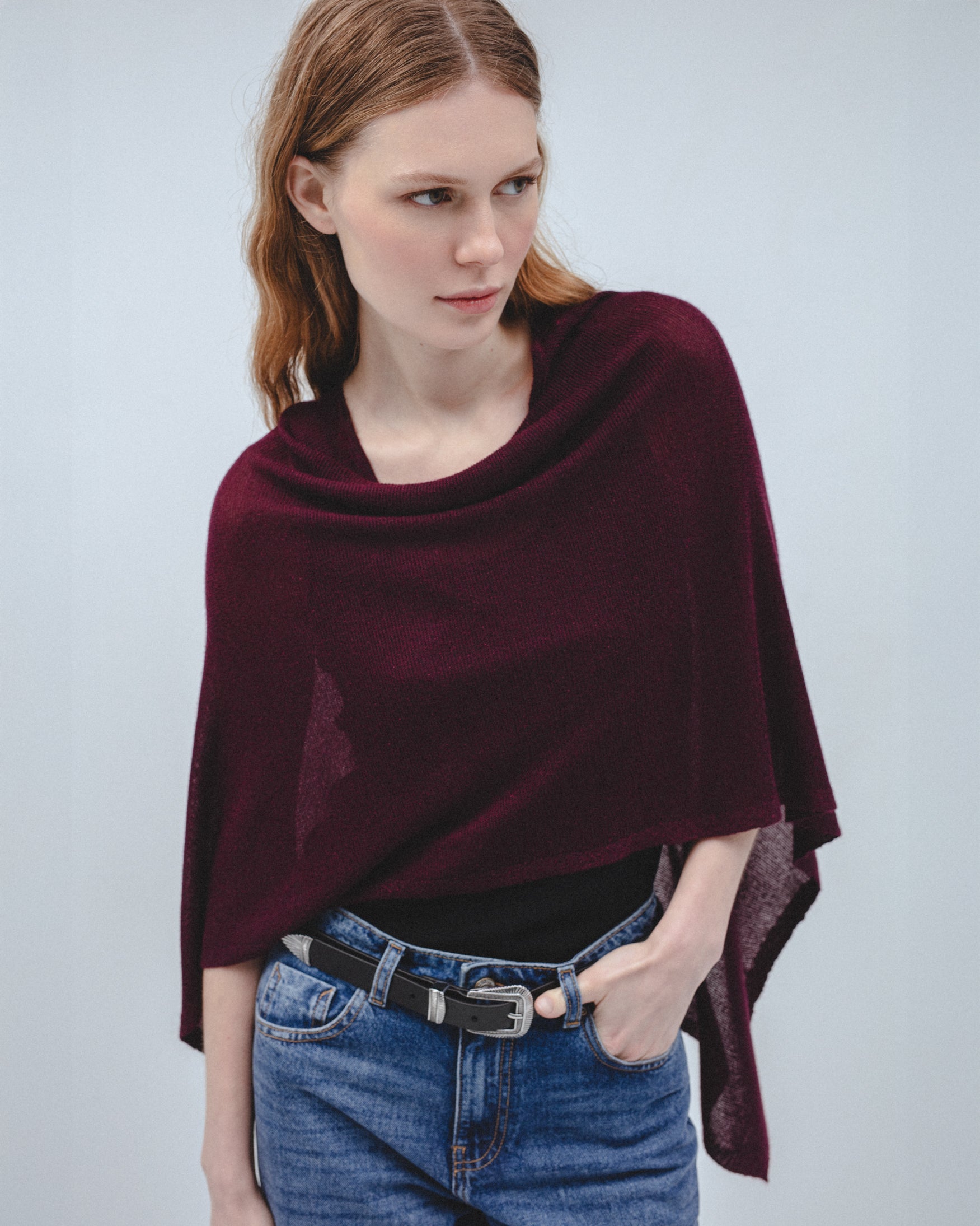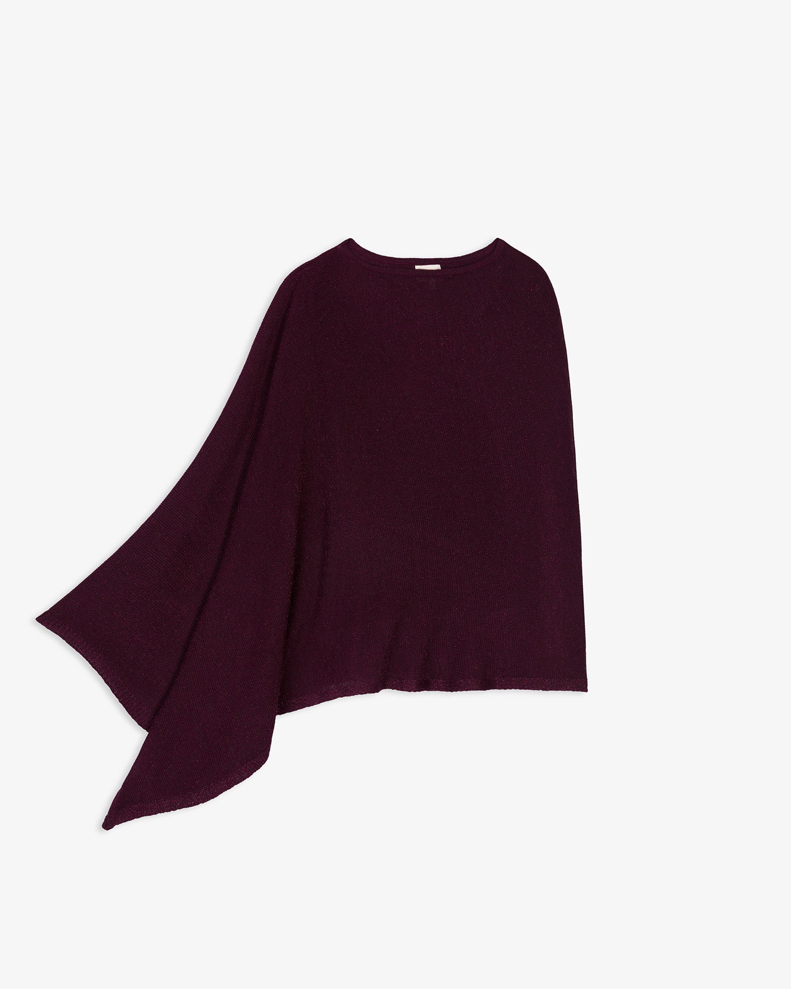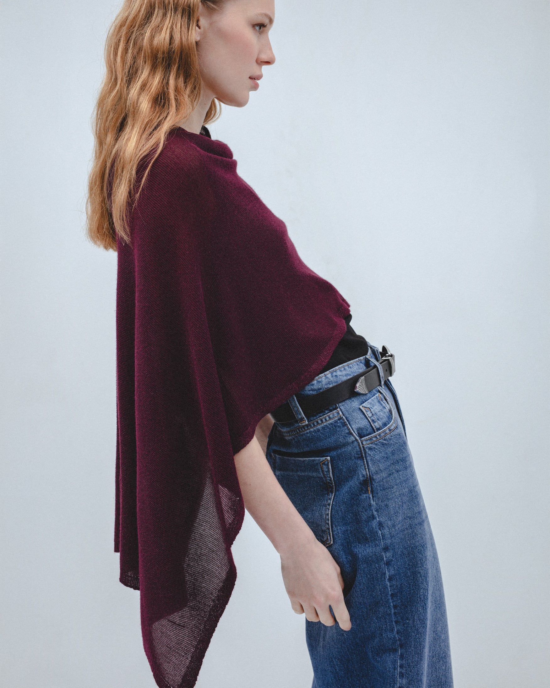 Capa de cuello barco y manga por debajo del codo. Detalle de tejido en punto fino con caída fluida. Acabados en rib.