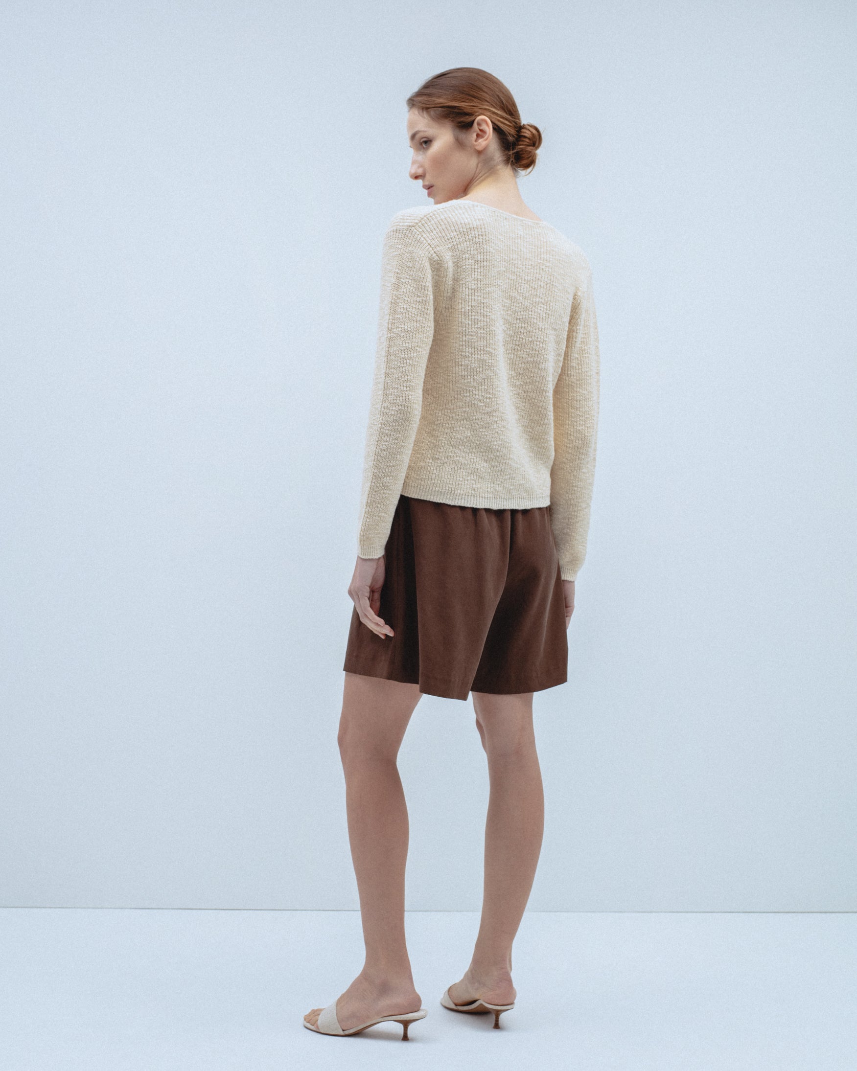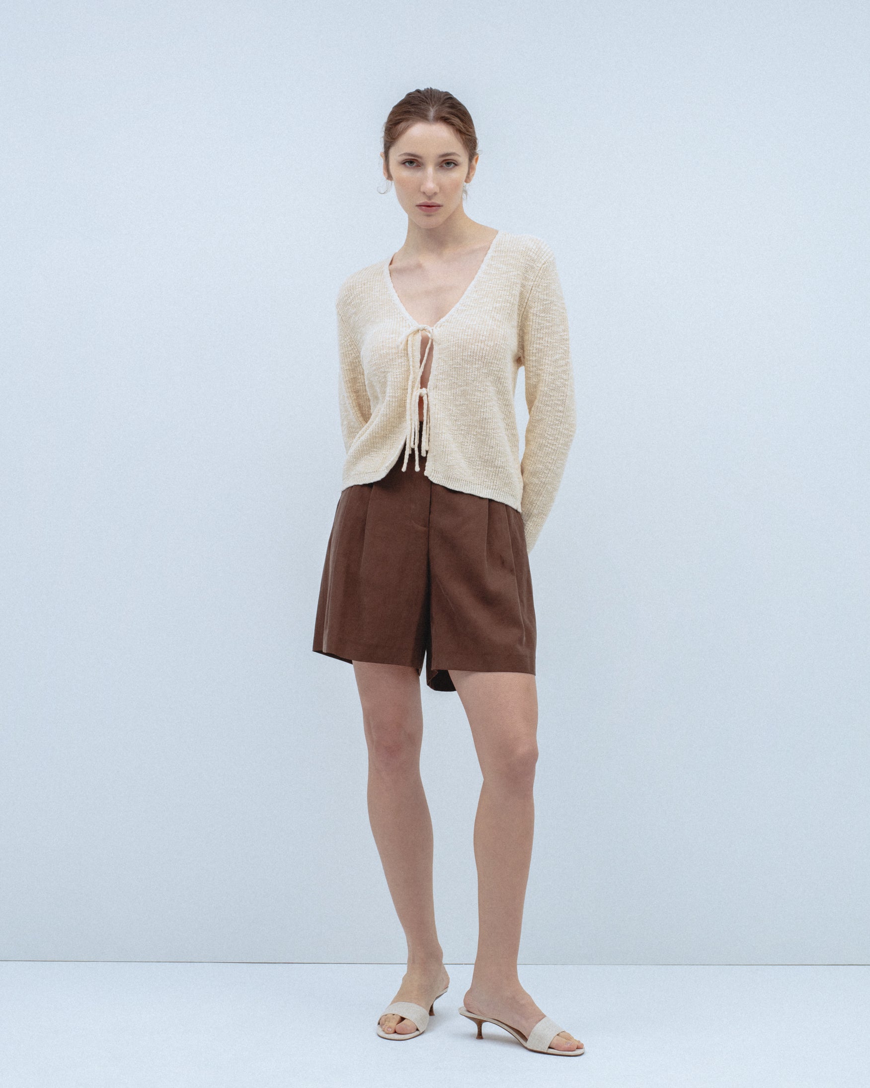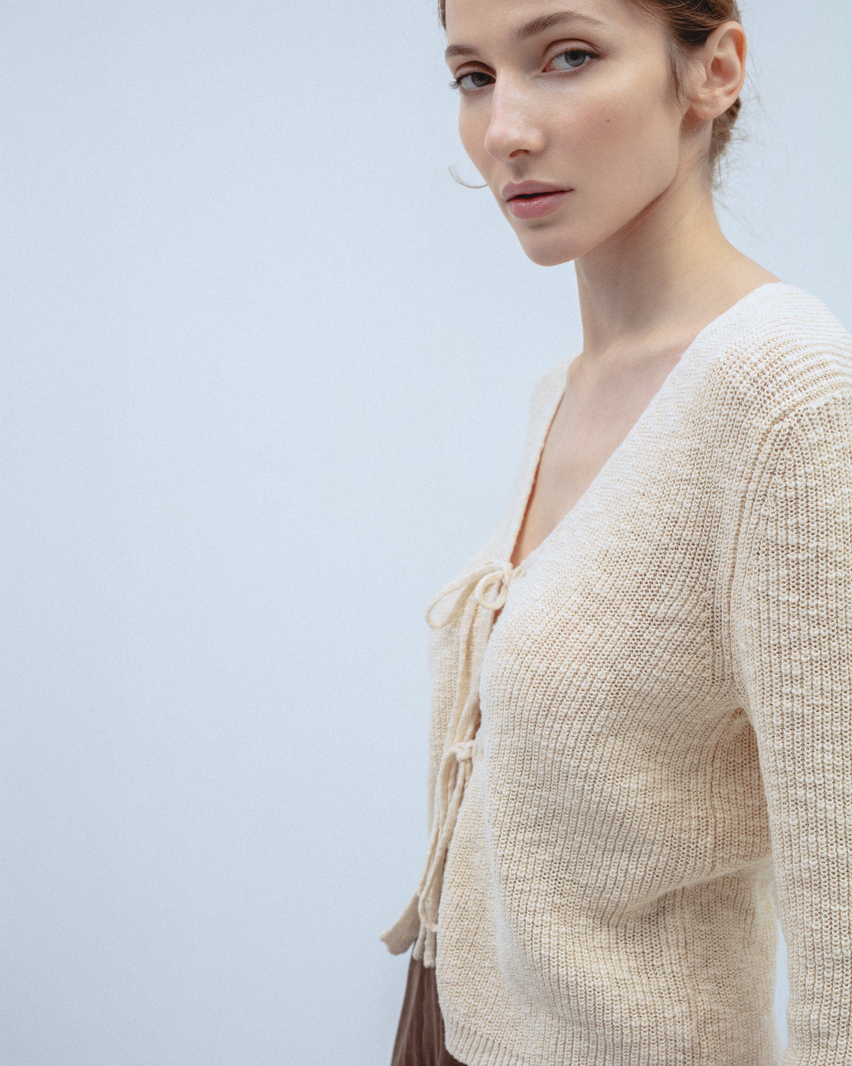Cárdigan de escote en pico y manga larga. Cierre frontal mediante lazada del mismo tejido y tono. Acabados en rib.