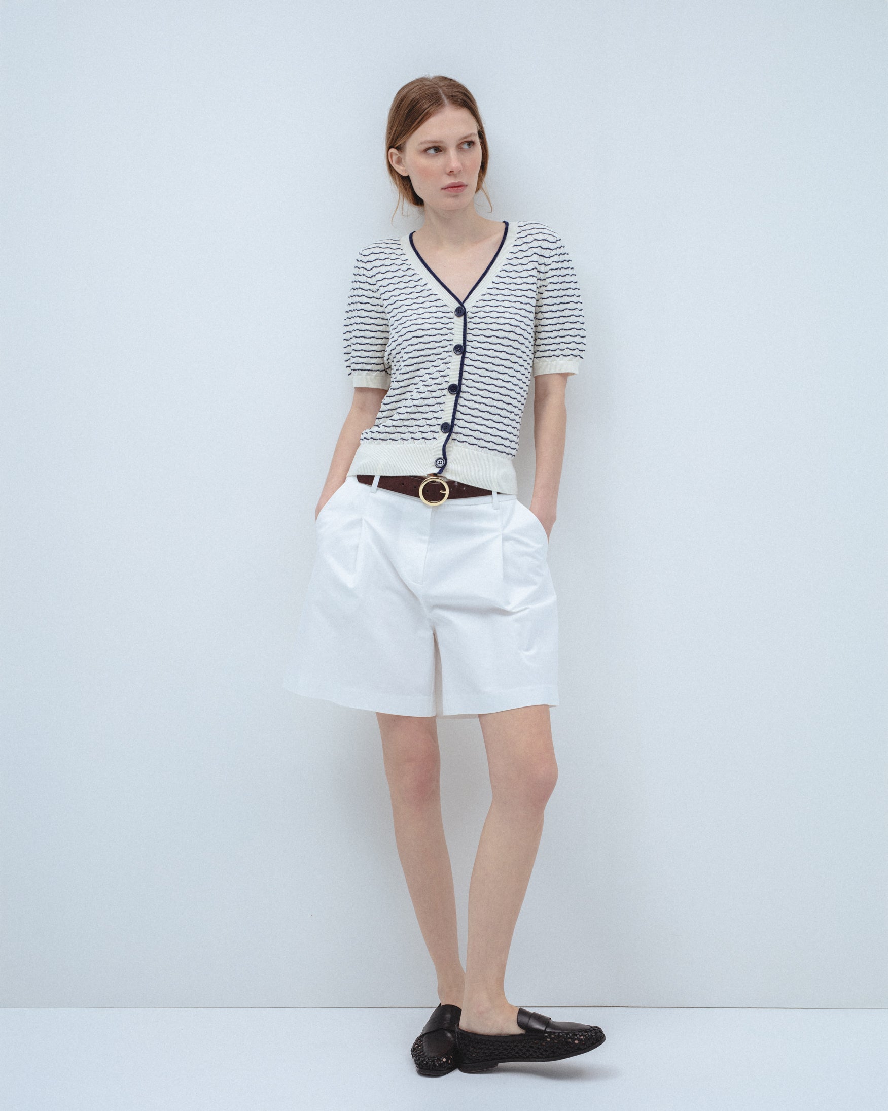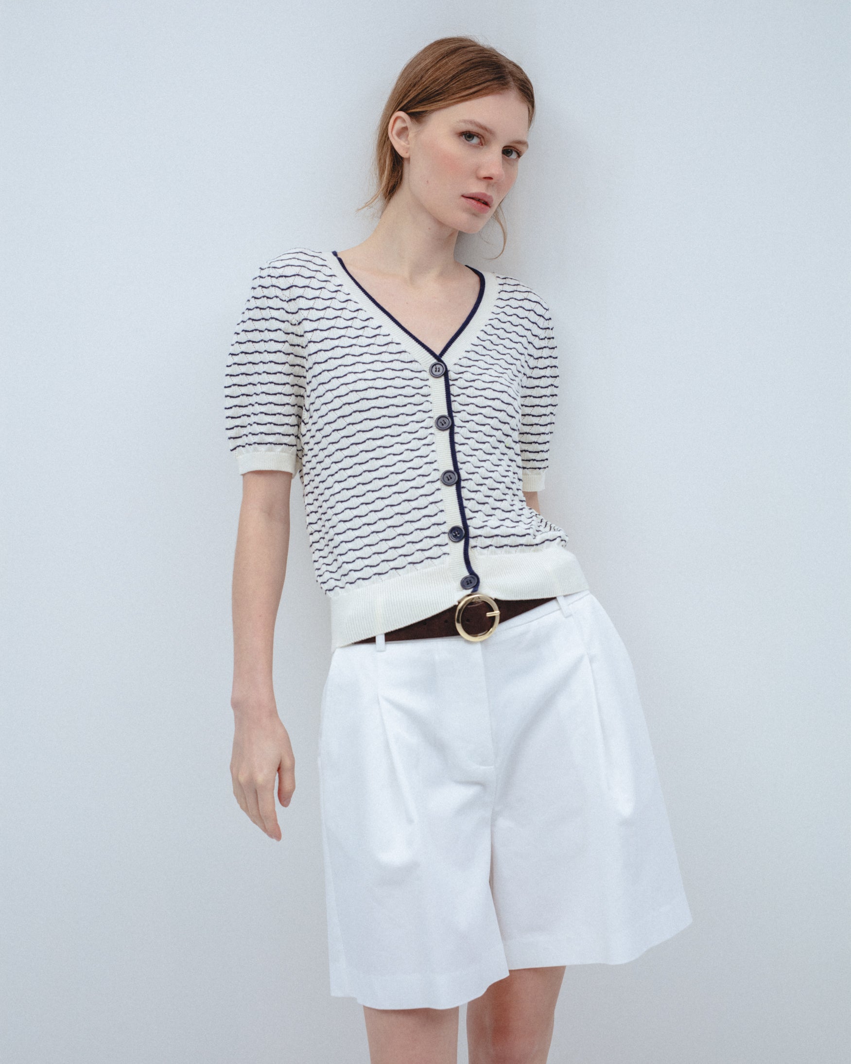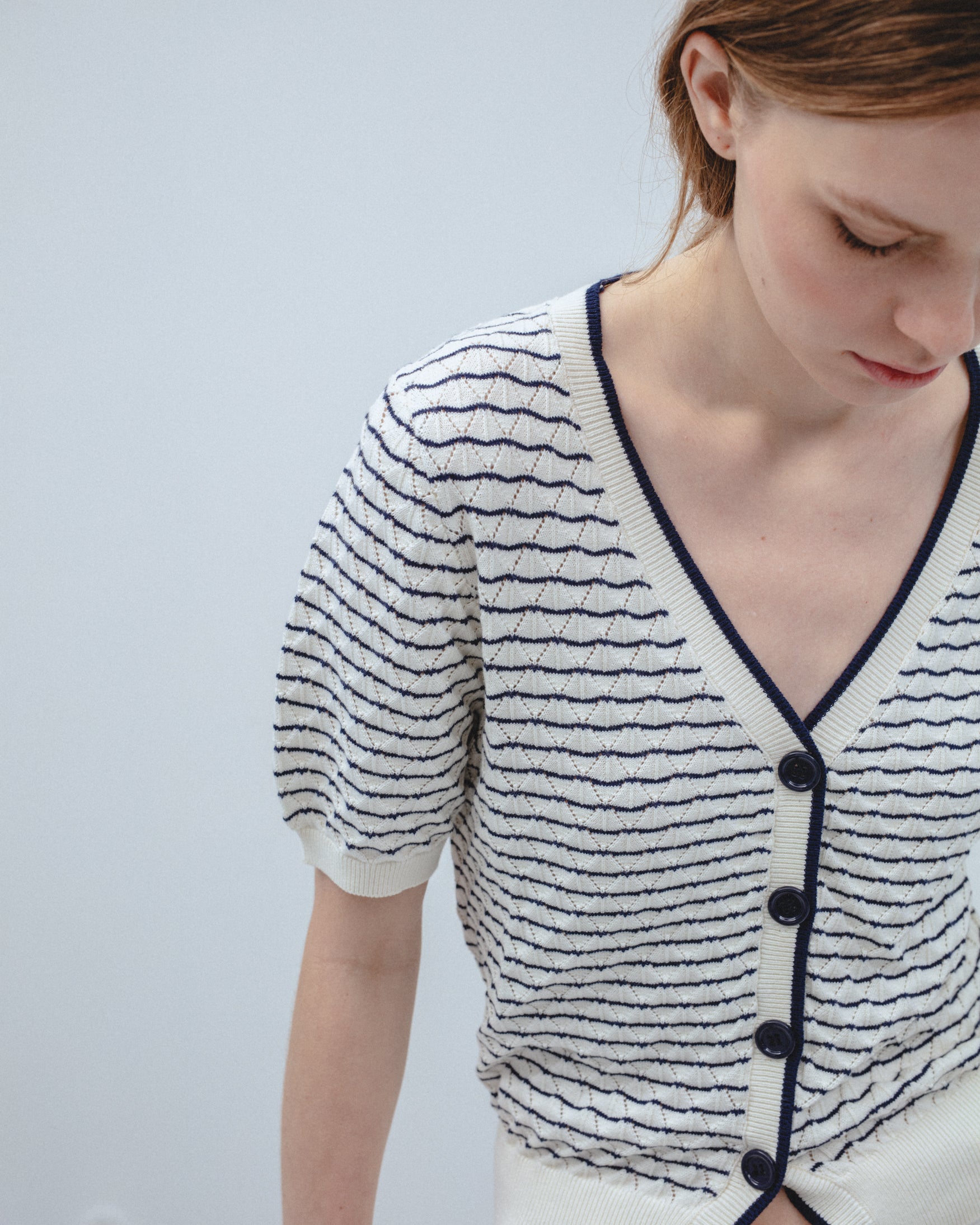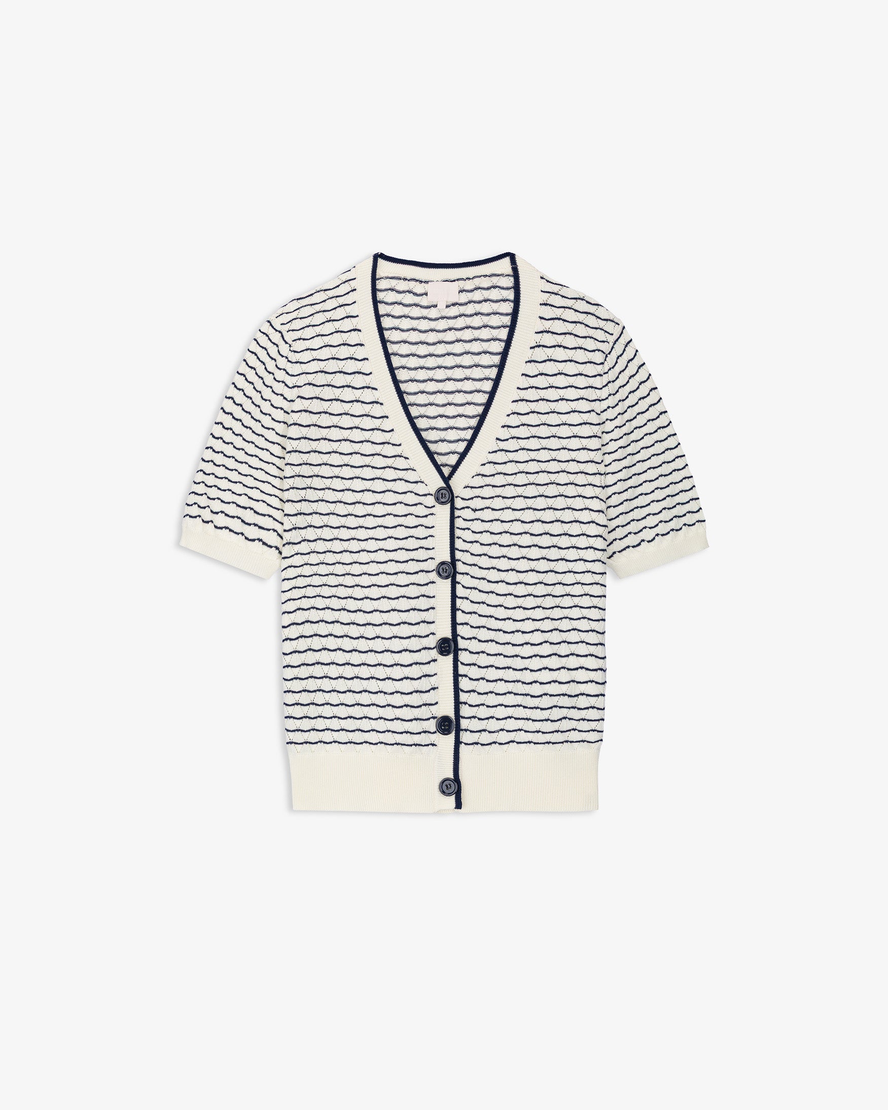 Cárdigan confeccionado en tejido 100% algodón. Cuello en pico y manga corta. Detalle de estampado de rayas a contraste. Cierre frontal con botones metálicos dorados. Acabados en rib.