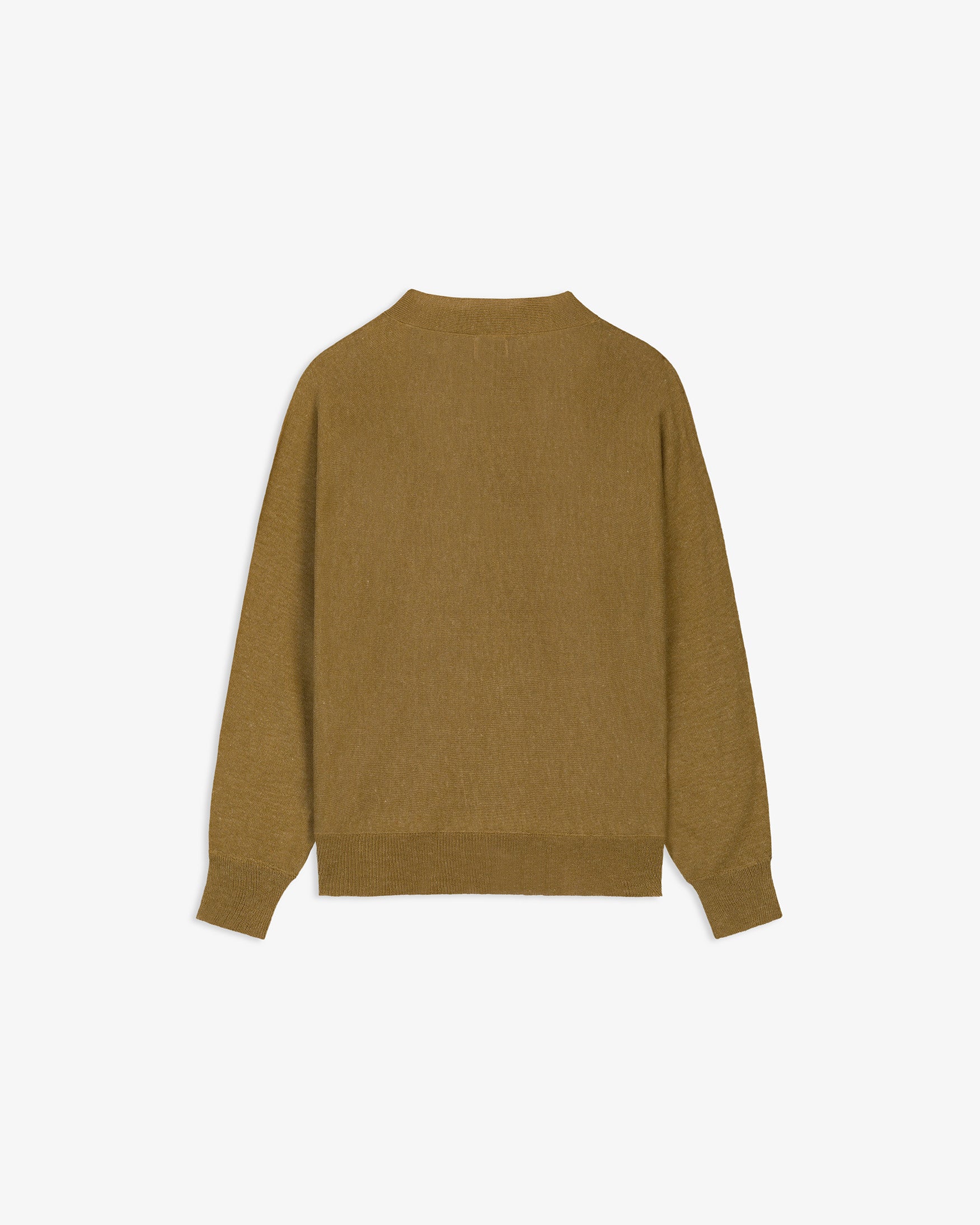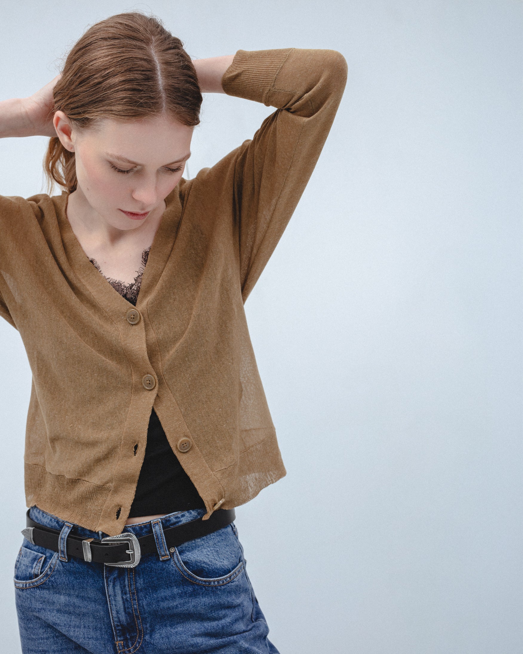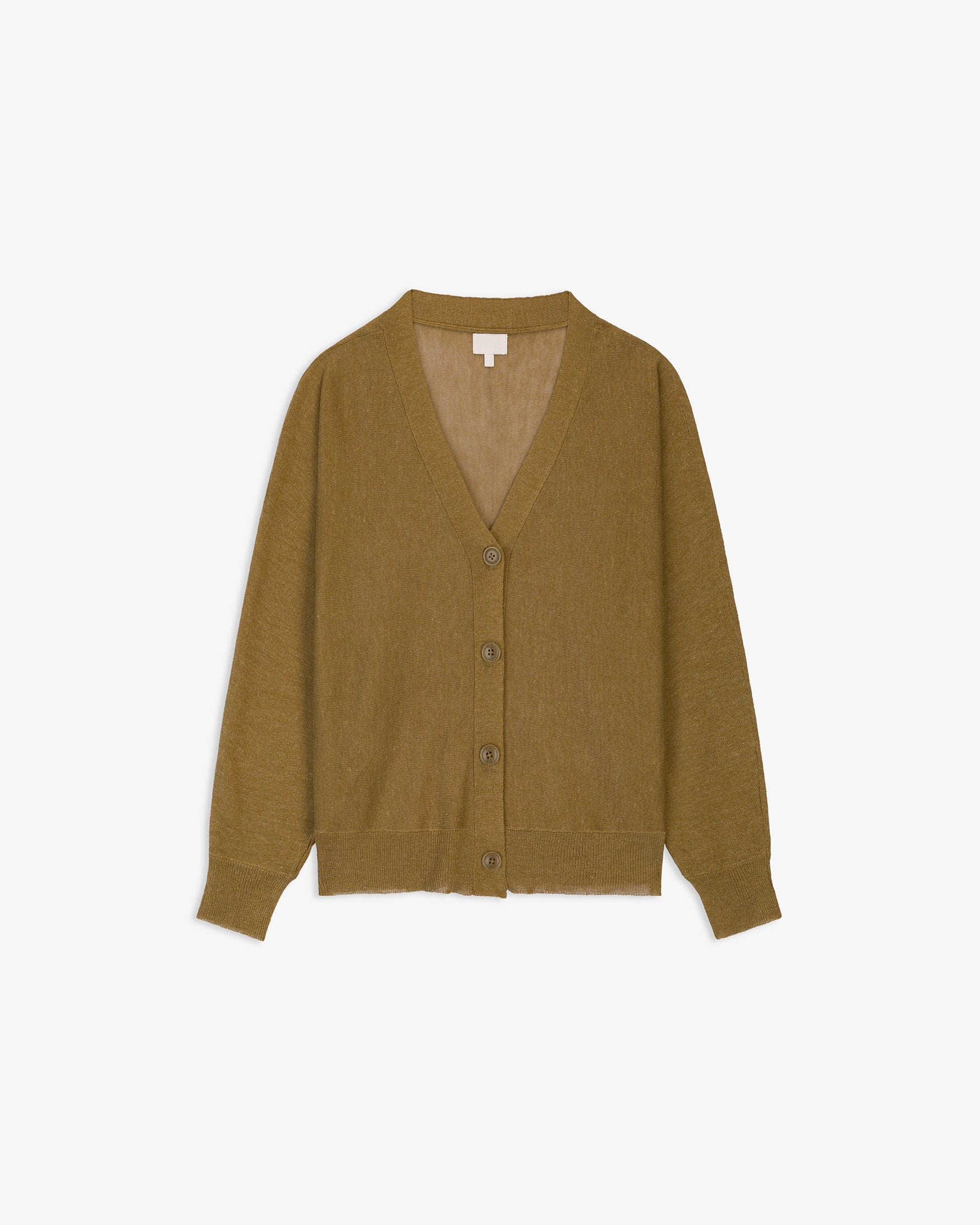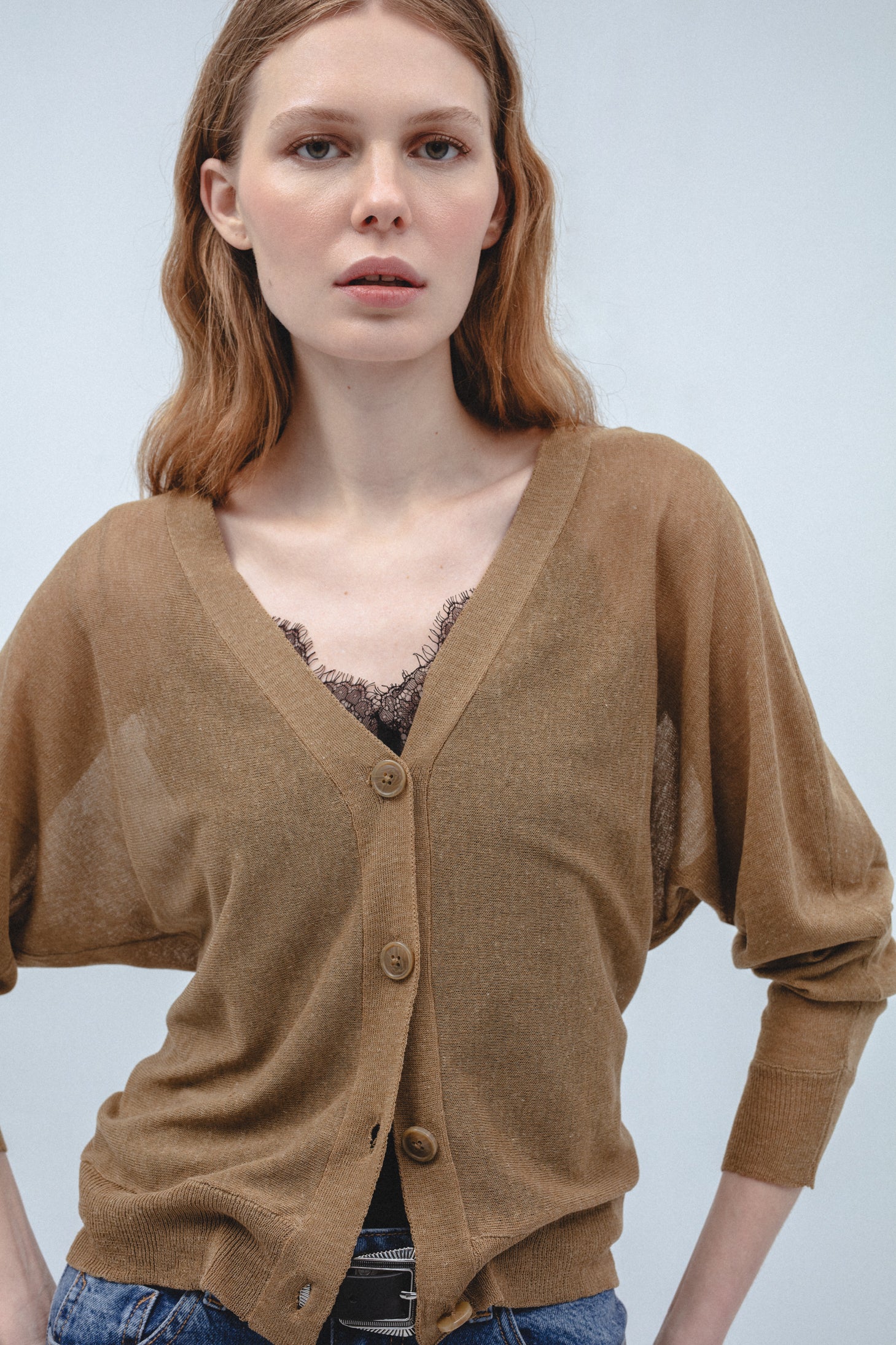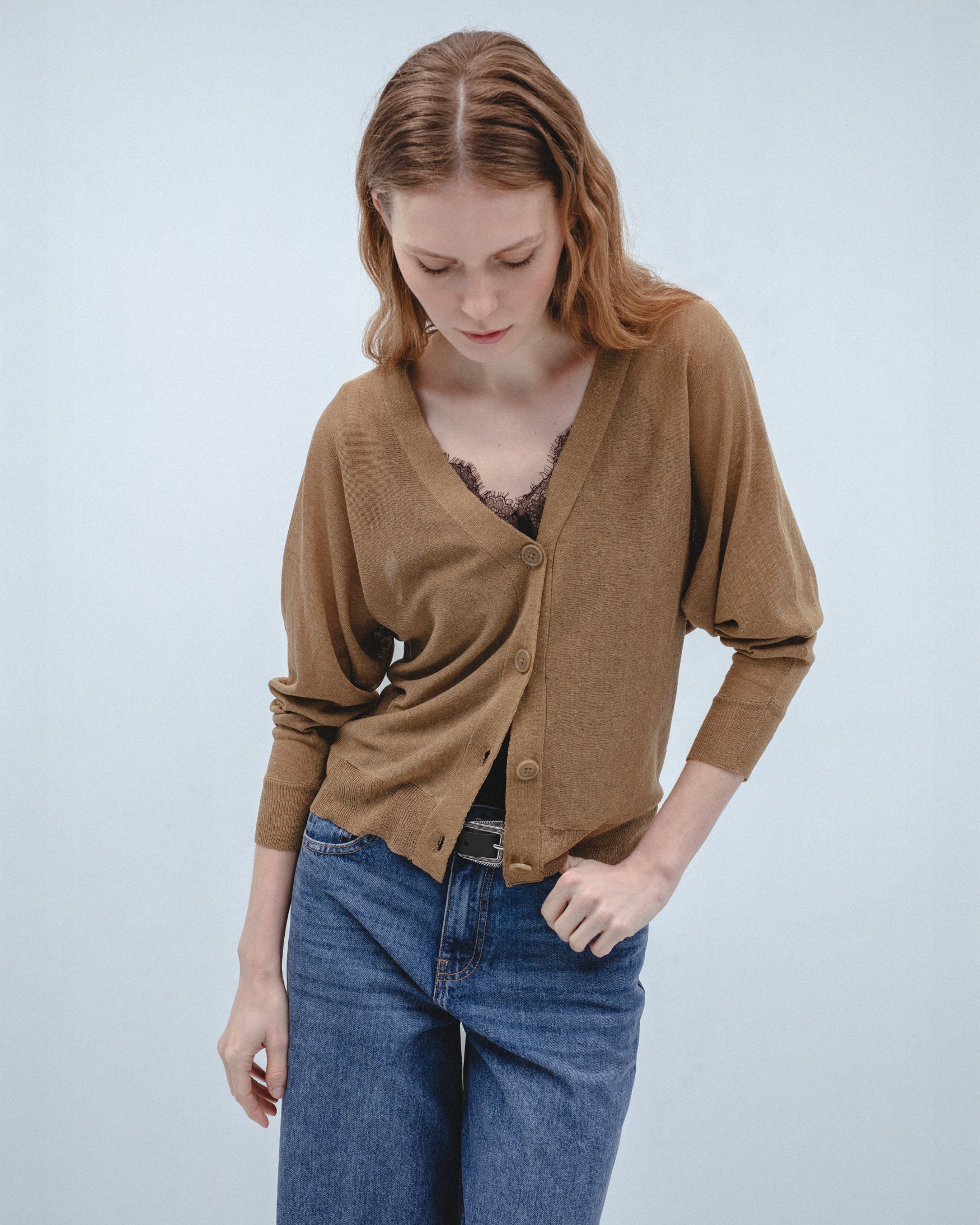 Cárdigan de cuello pico y manga larga. Cierre frontal con botones a contraste y acabados en rib.