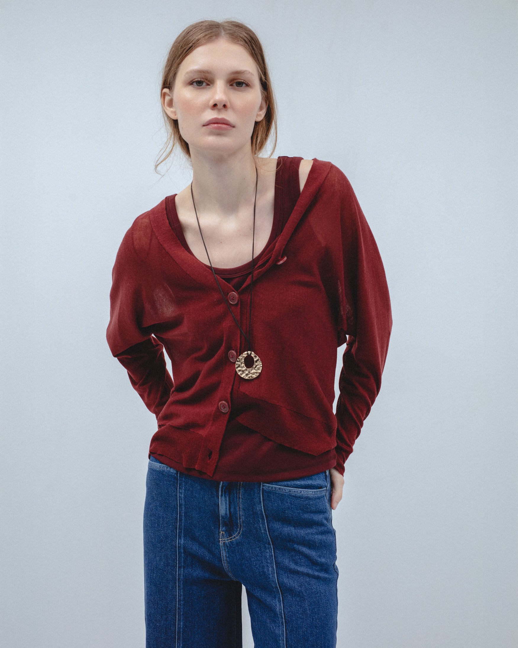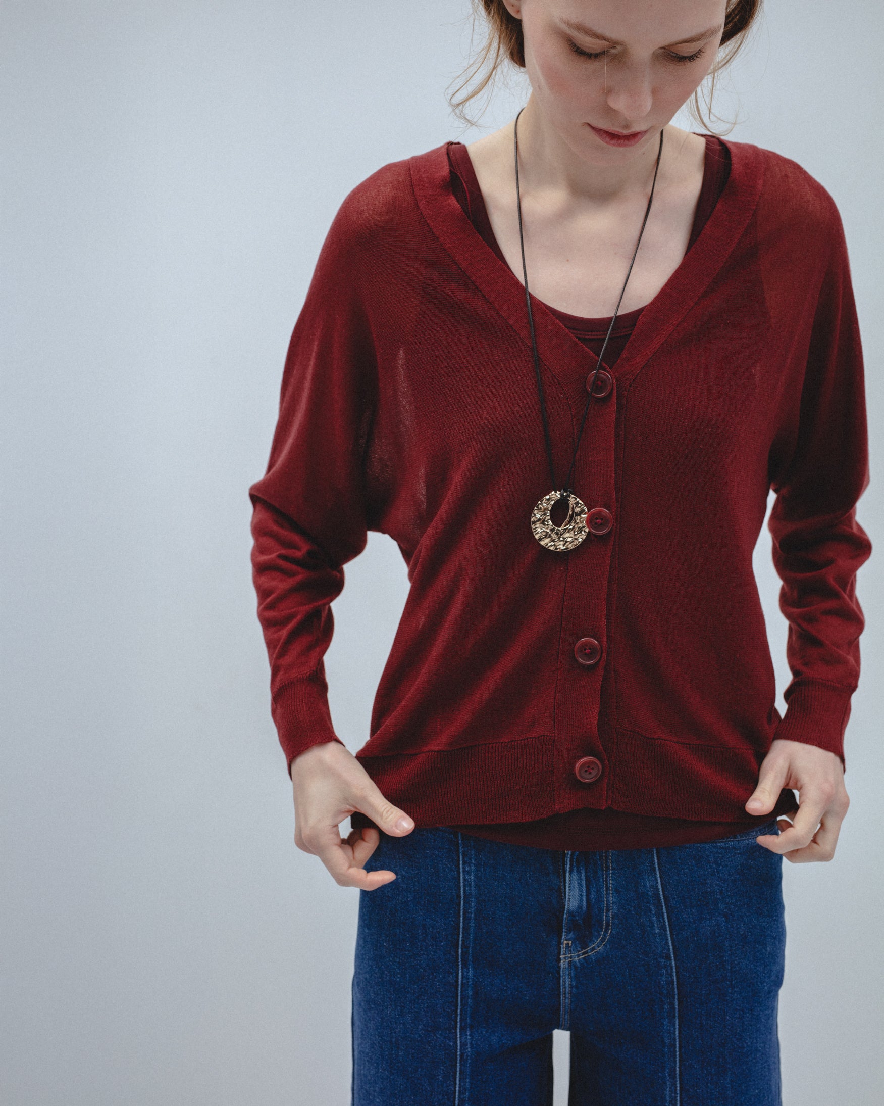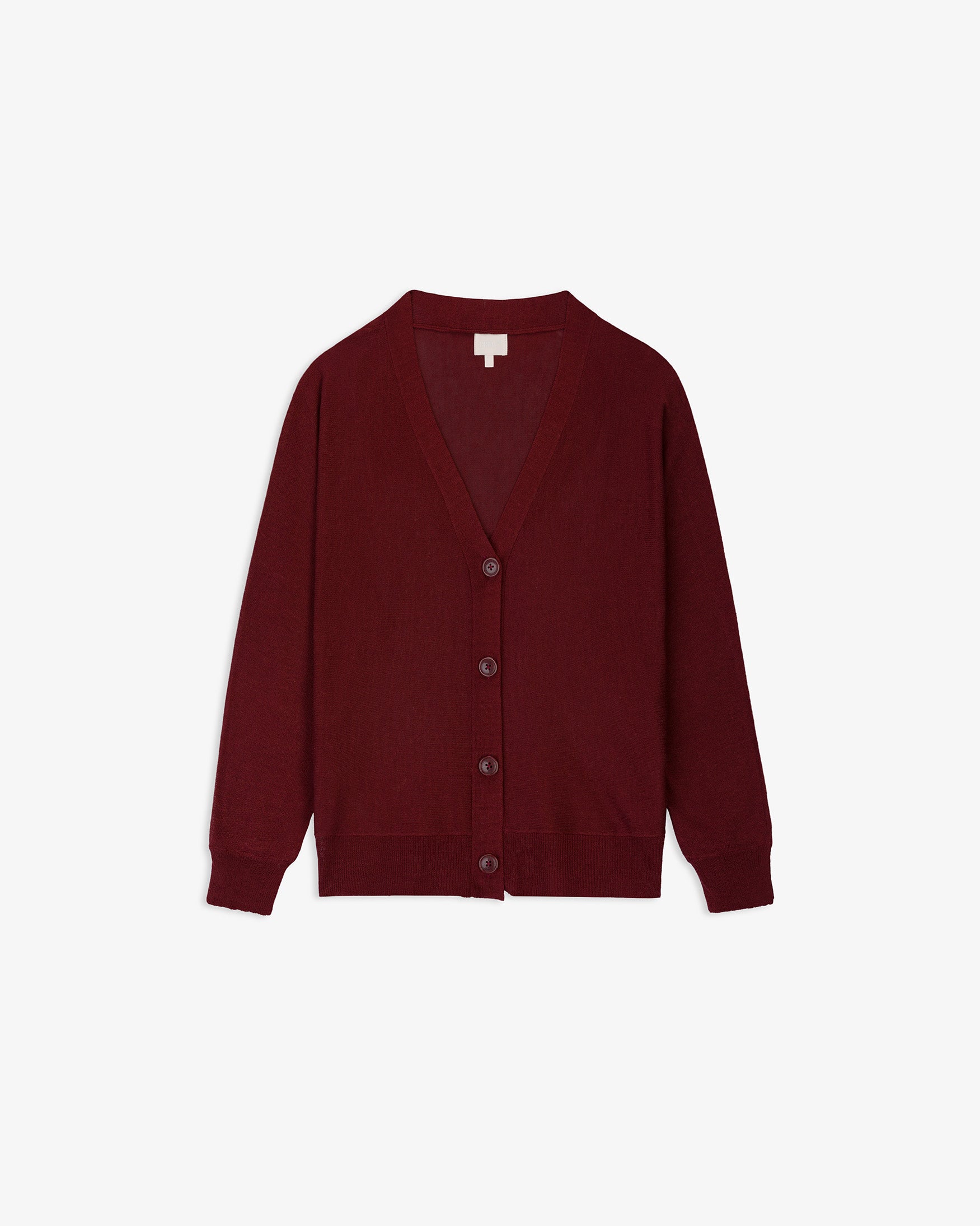 Cárdigan de cuello pico y manga larga. Cierre frontal con botones a contraste y acabados en rib.