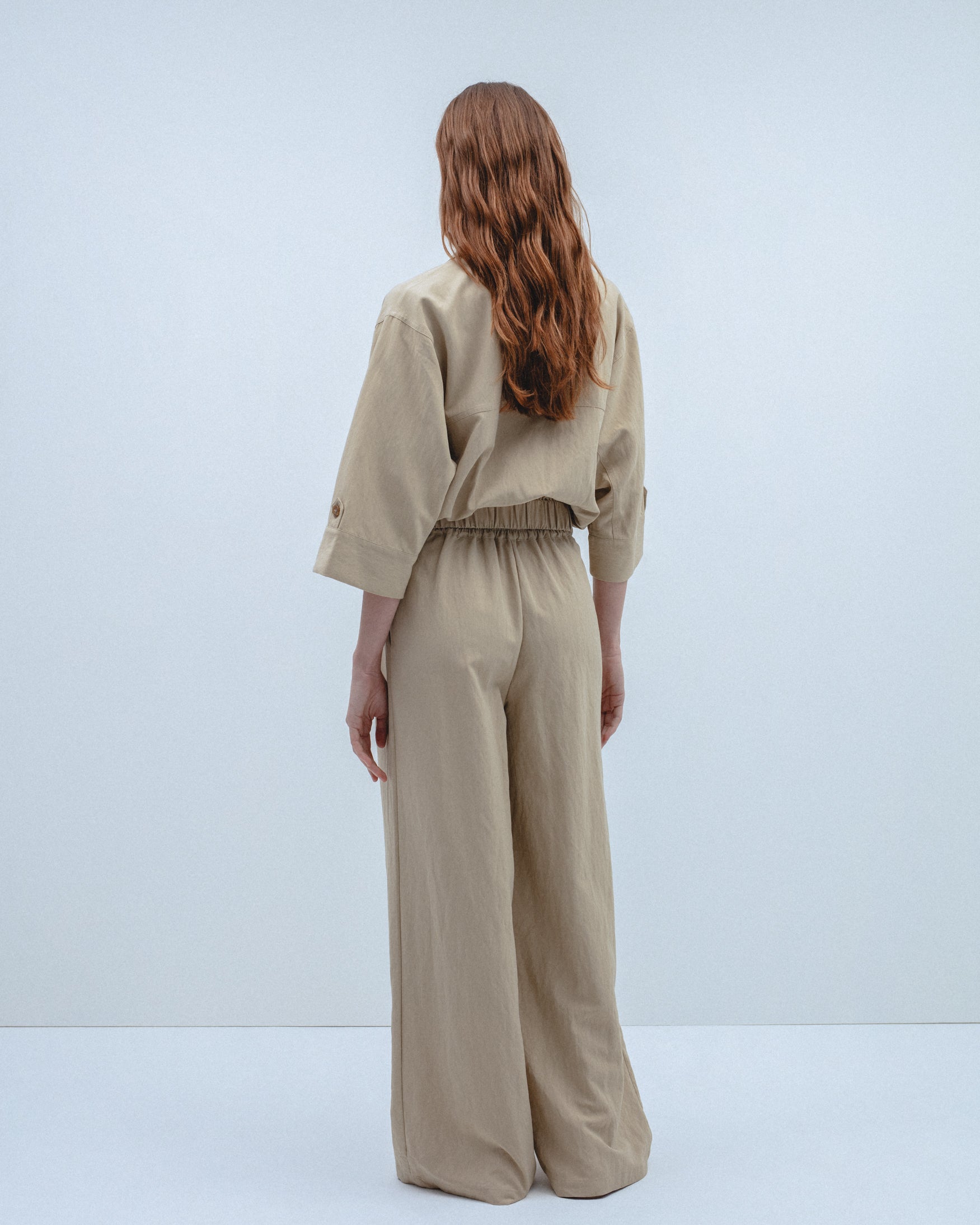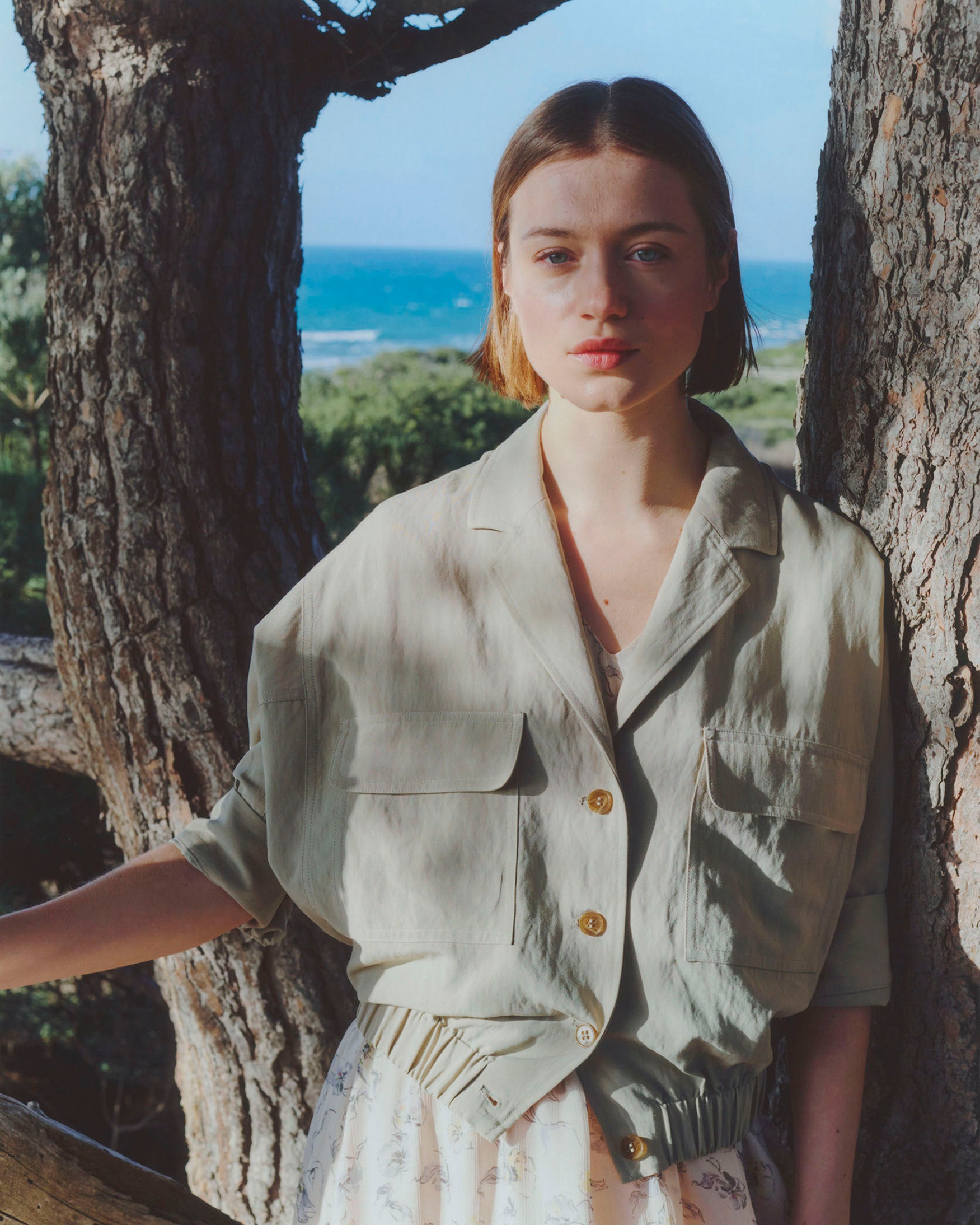 Chaqueta de cuello solapa y manga por debajo del codo acabada en vuelta con trabilla y botón. Bolsillos delanteros de plastrón con solapa. Detalle de costuras marcadas y cierre frontal con botones.