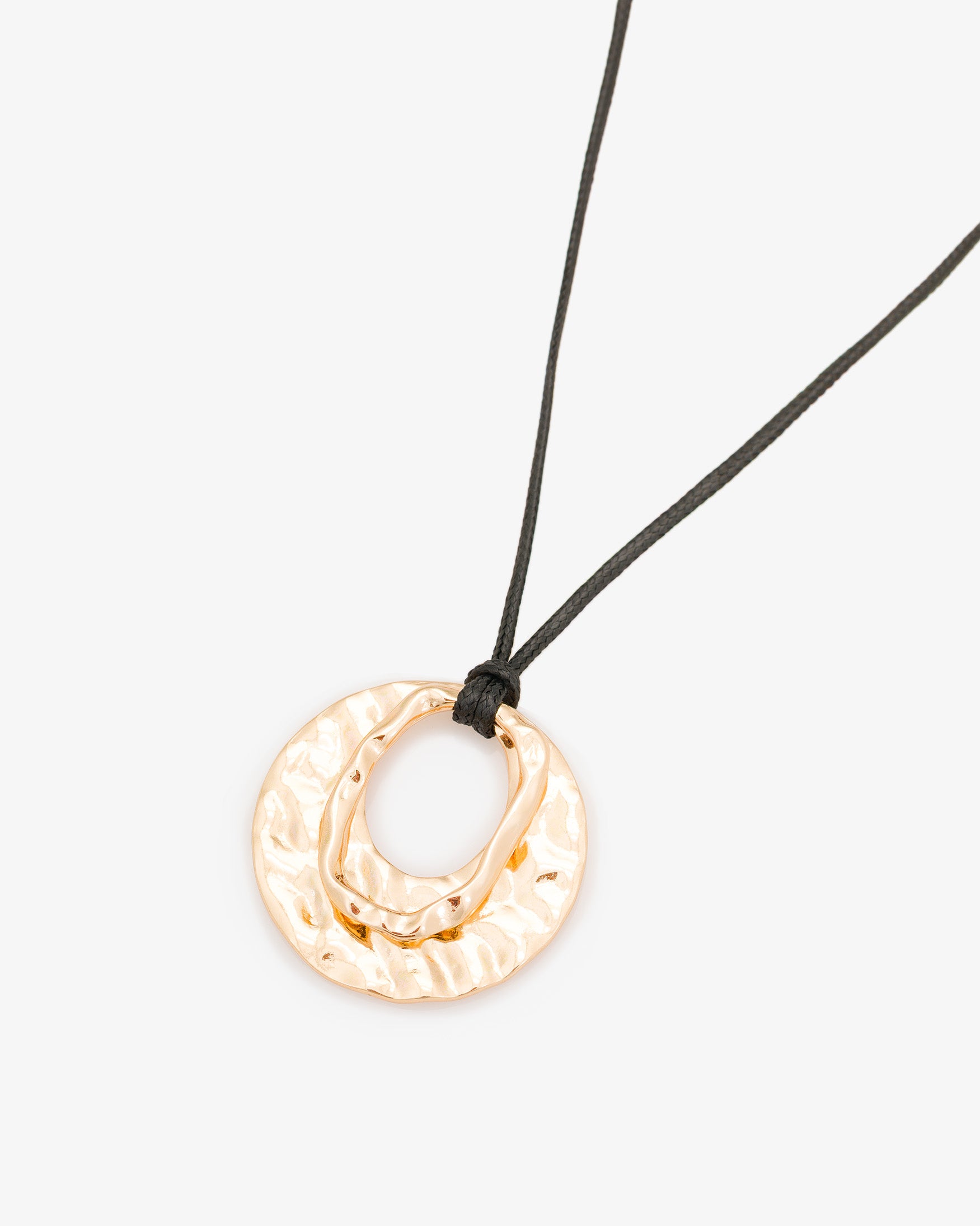 Collar con cordón fino en color contraste. Detalle de aplicación de pieza metálica circular con textura martilleada y diseño irregular. Cierre metálico con mosquetón y cadena ajustable.