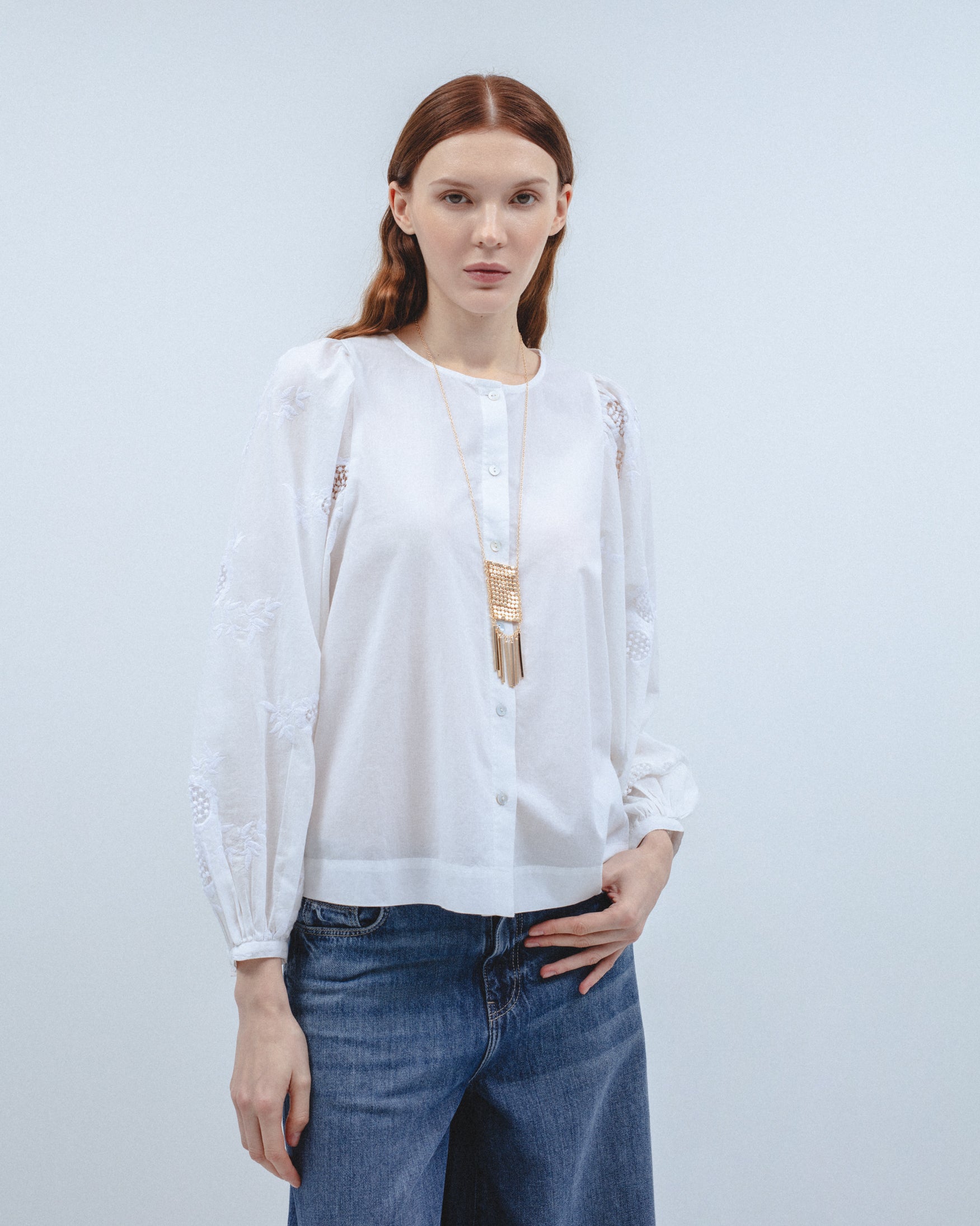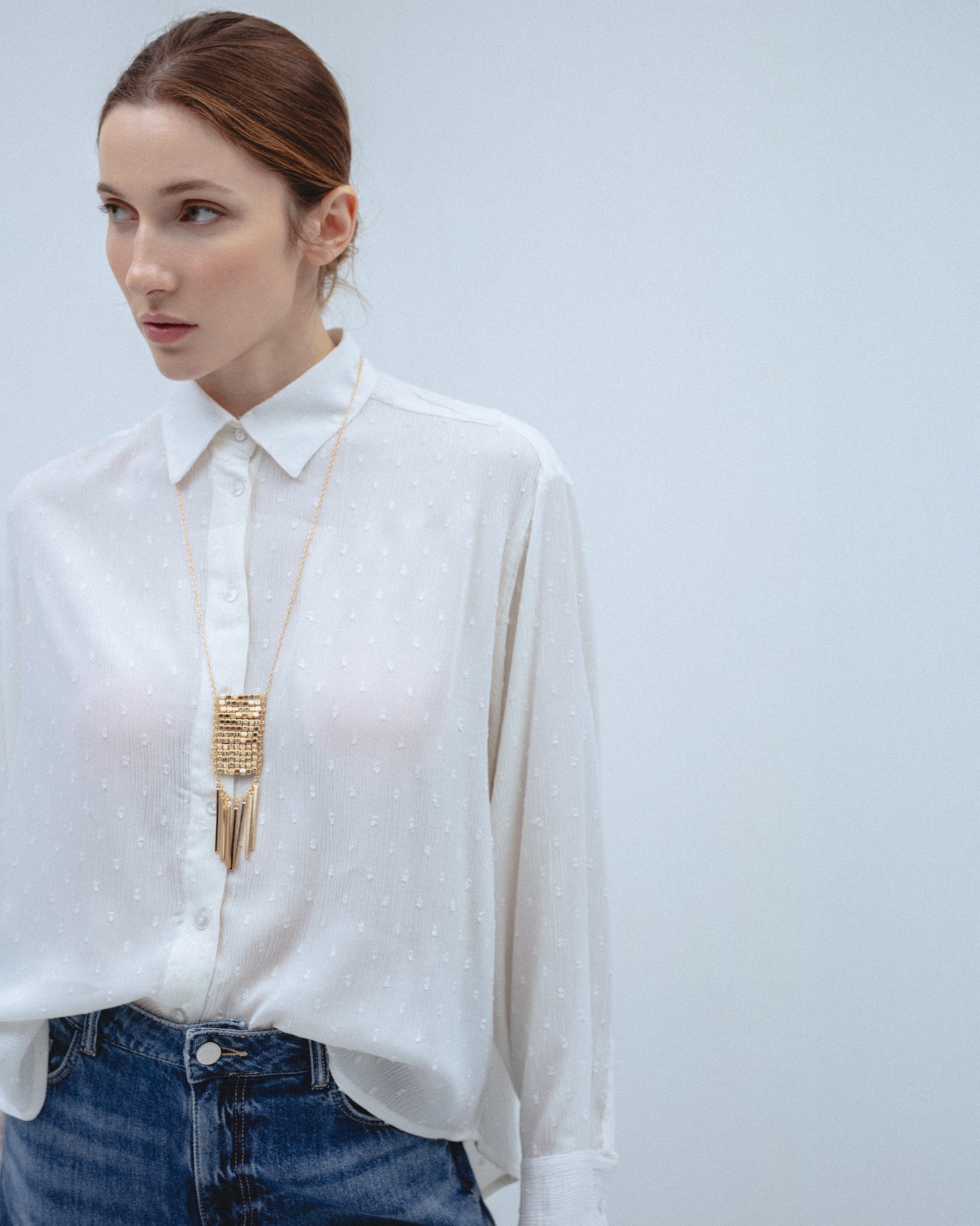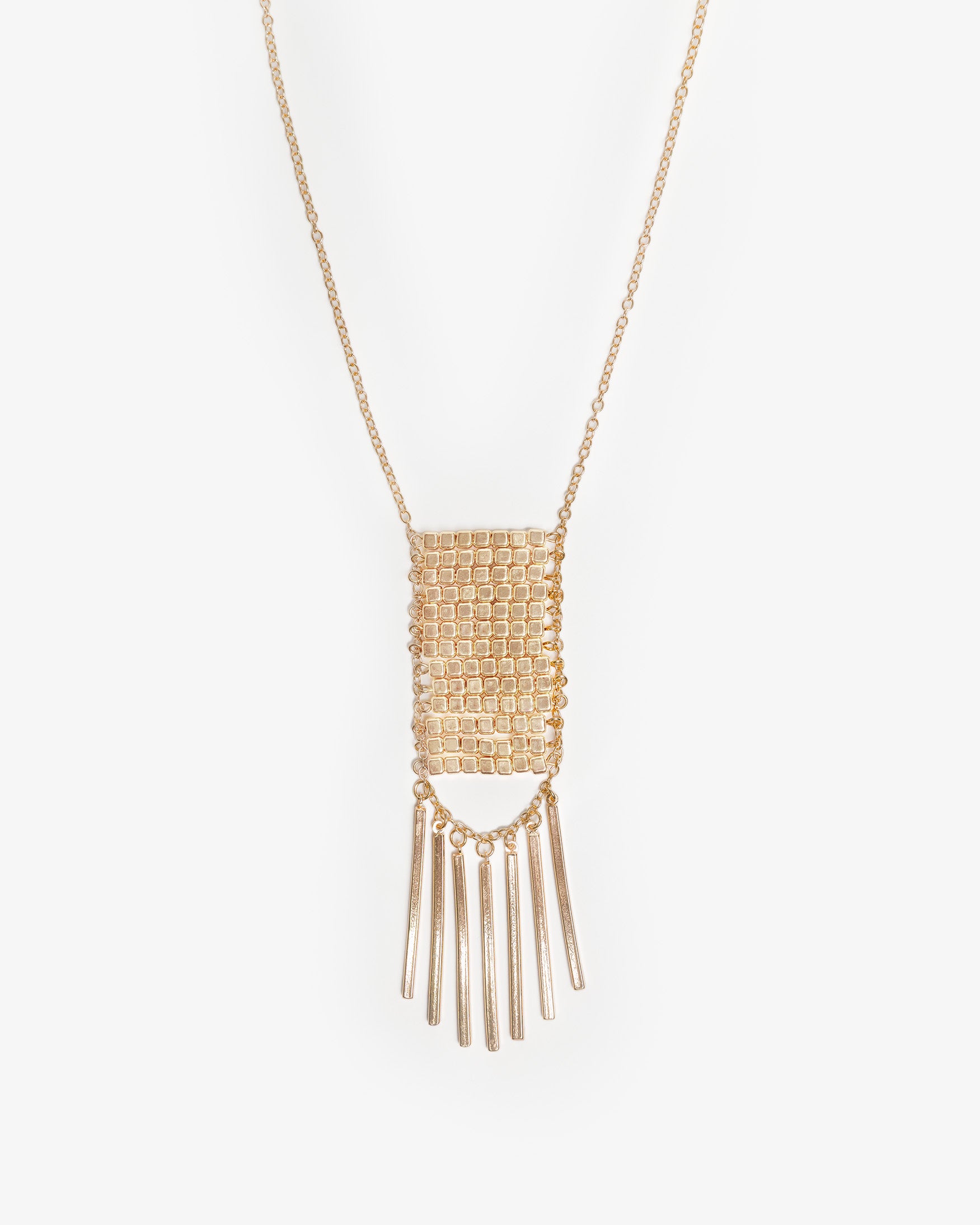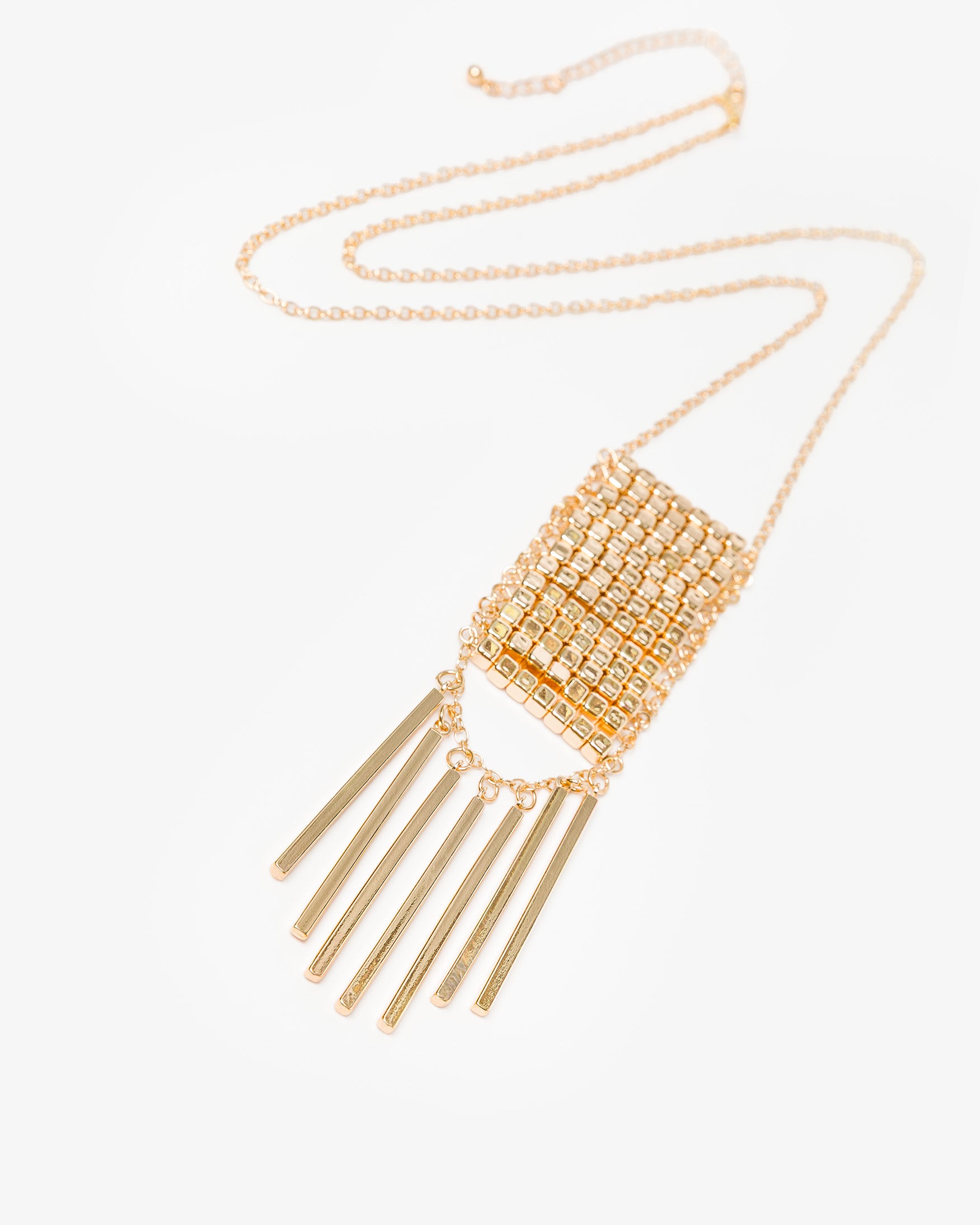 Collar de cadena fina con aplicación central de malla metálica en relieve. Detalle de colgantes rígidos tubulares de diferentes largos. Cierre metálico con mosquetón y cadena ajustable.