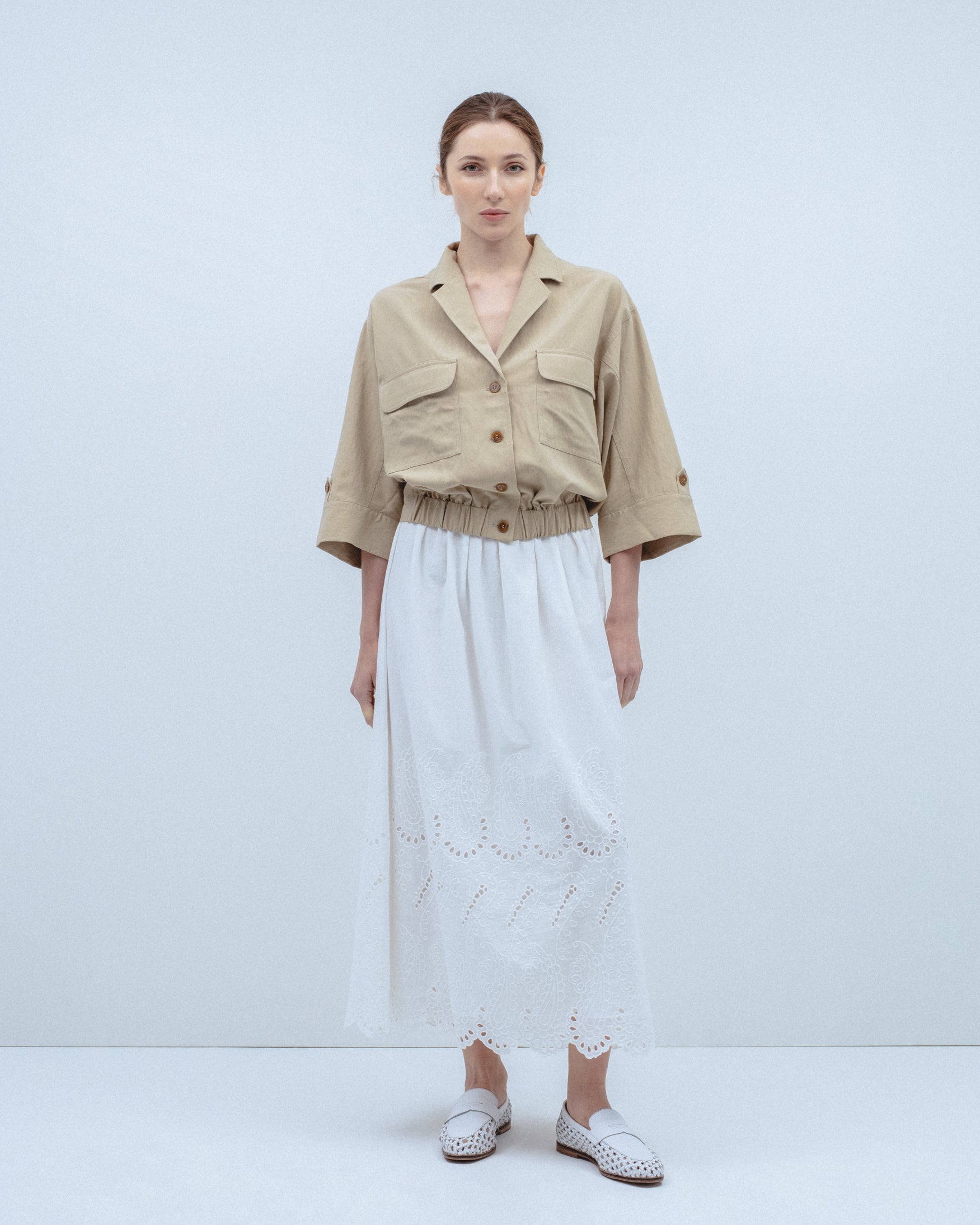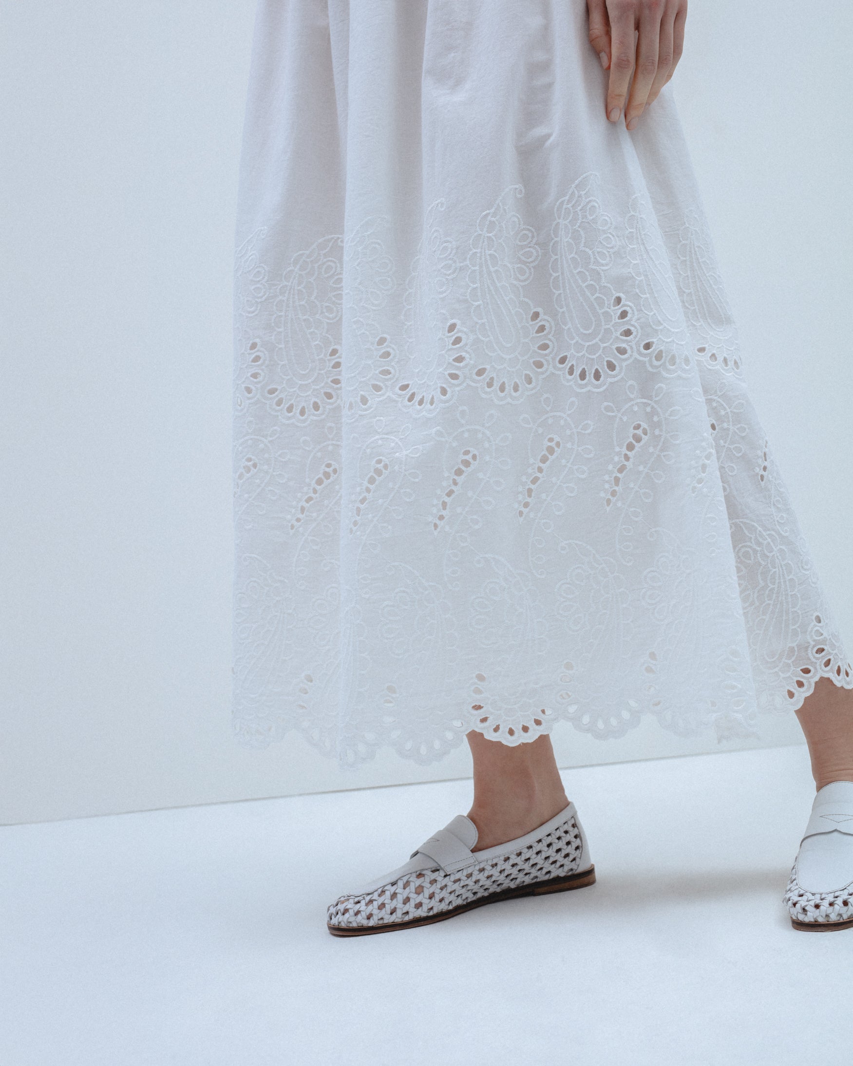 Falda confeccionada en tejido 100% algodón. Tiro alto con cintura elástica. Detalle de bordados perforados combinados a tono en el bajo.