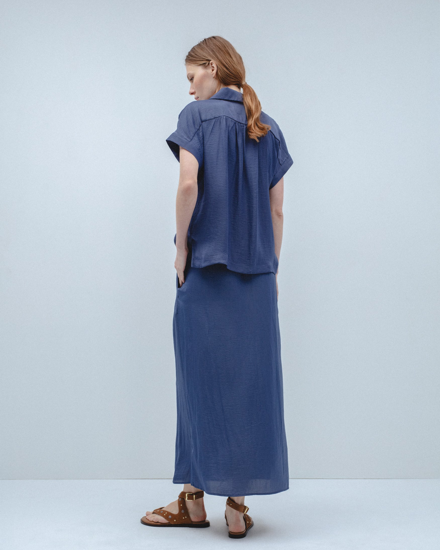 Falda de tiro alto con cintura elástica. Detalle de tejido cruzado con efecto drapeado en la parte delantera. Bajo acabado en línea evasé.