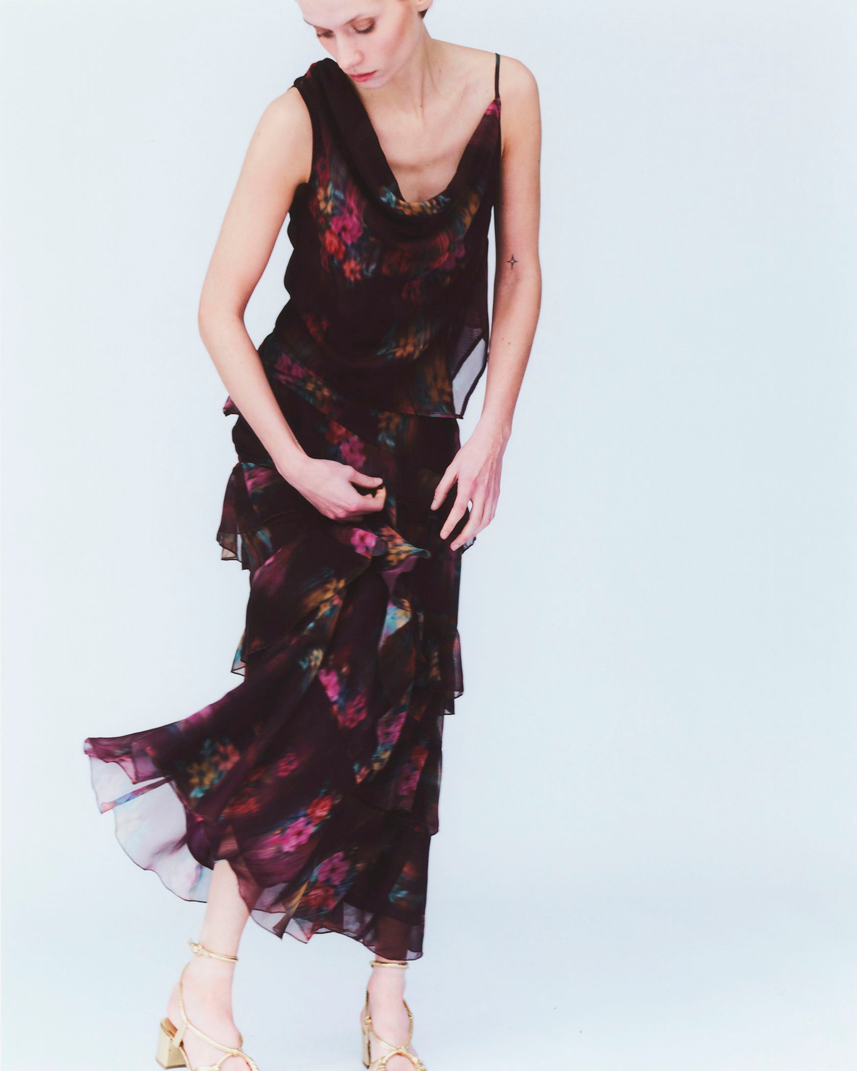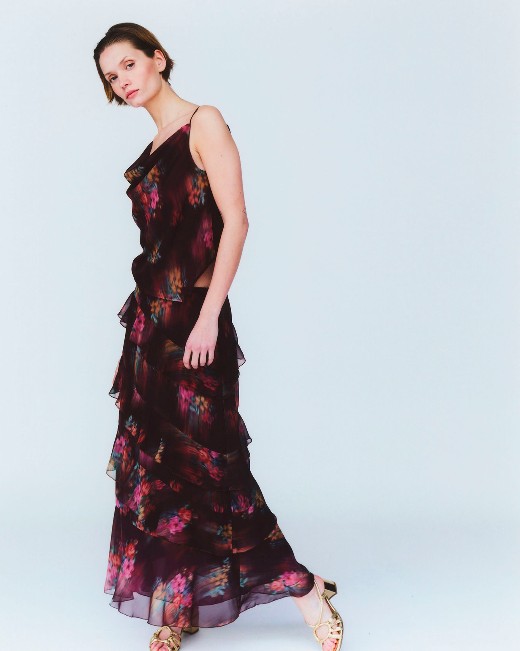 Falda midi de tiro alto confeccionada en tejido fluido. Detalle de volantes superpuestos en mismo tejido que aportan movimiento. Bajo en línea evasé y cierre lateral con cremallera oculta en costura.
