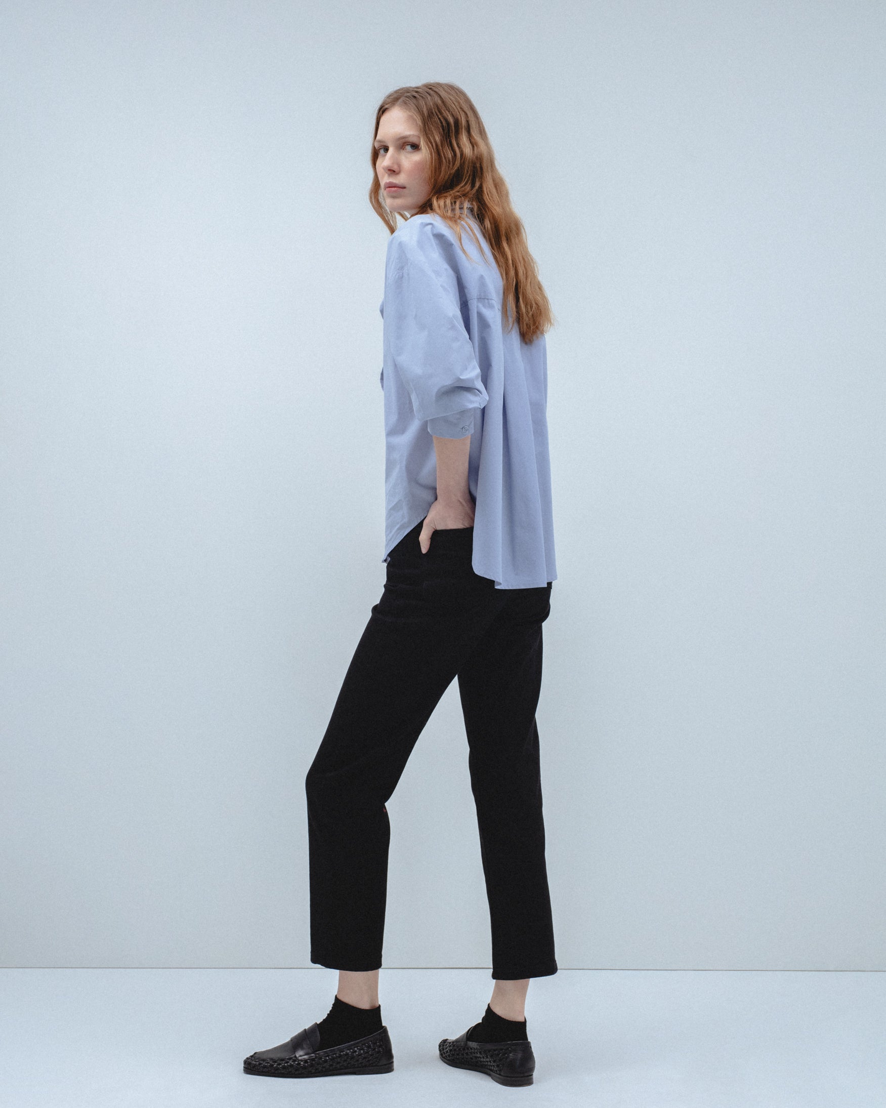 Jeans de tiro alto con cinco bolsillos. Efecto de lavado medio. Pernera recta de largo tobillero. Cierre frontal con cremallera y botón metálico.