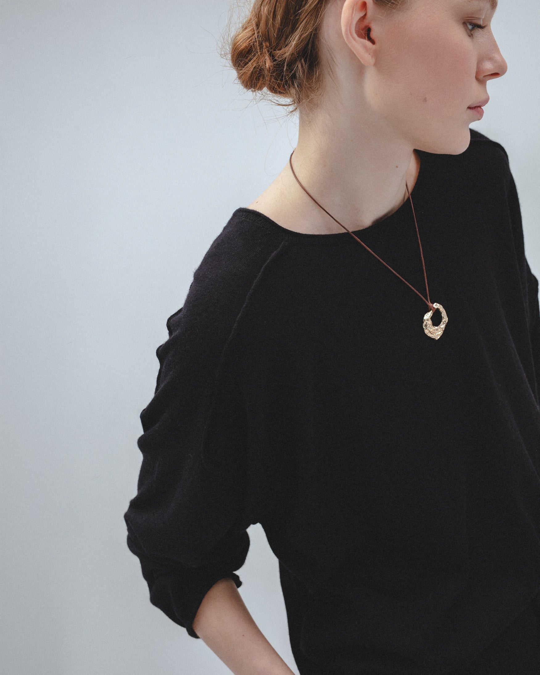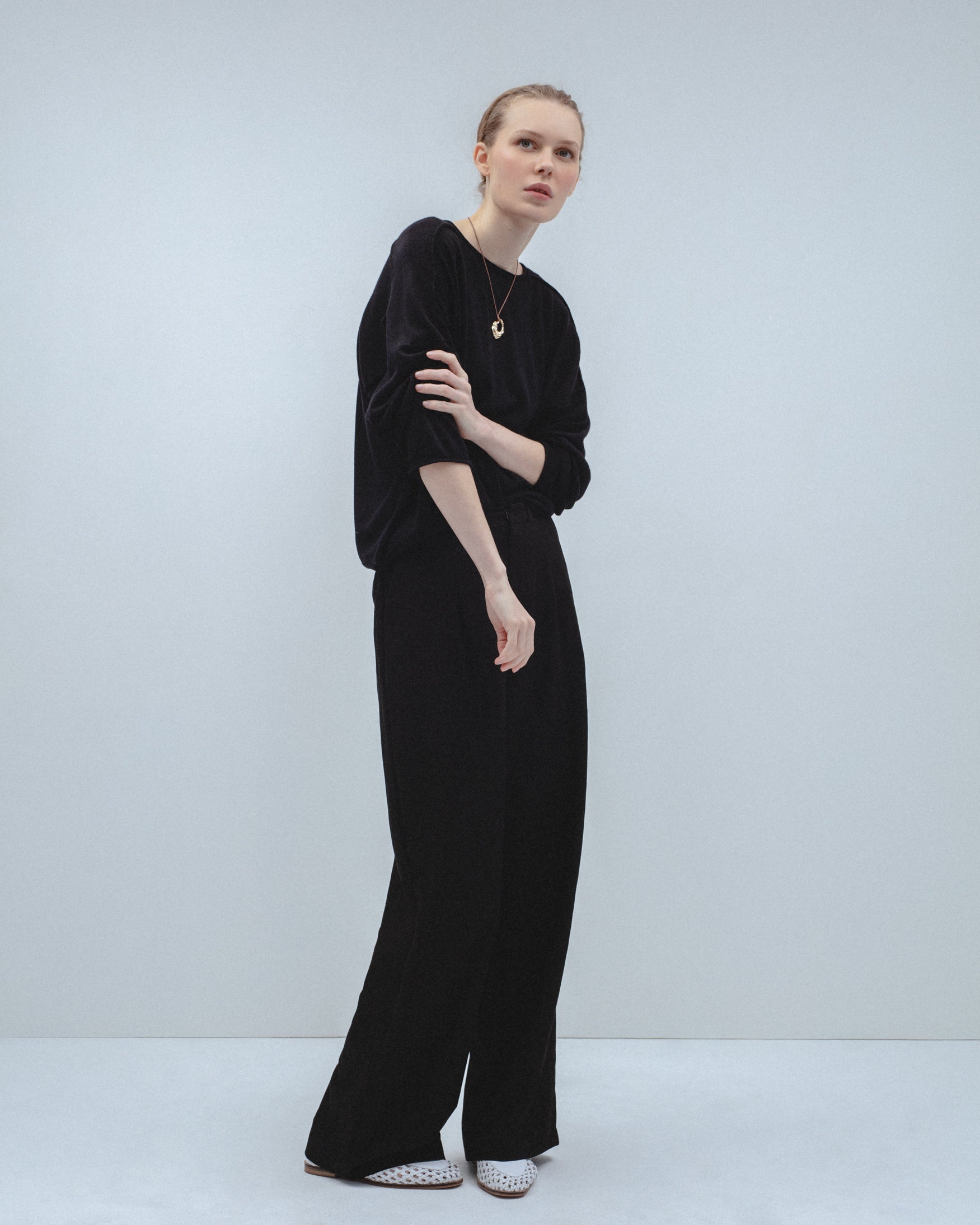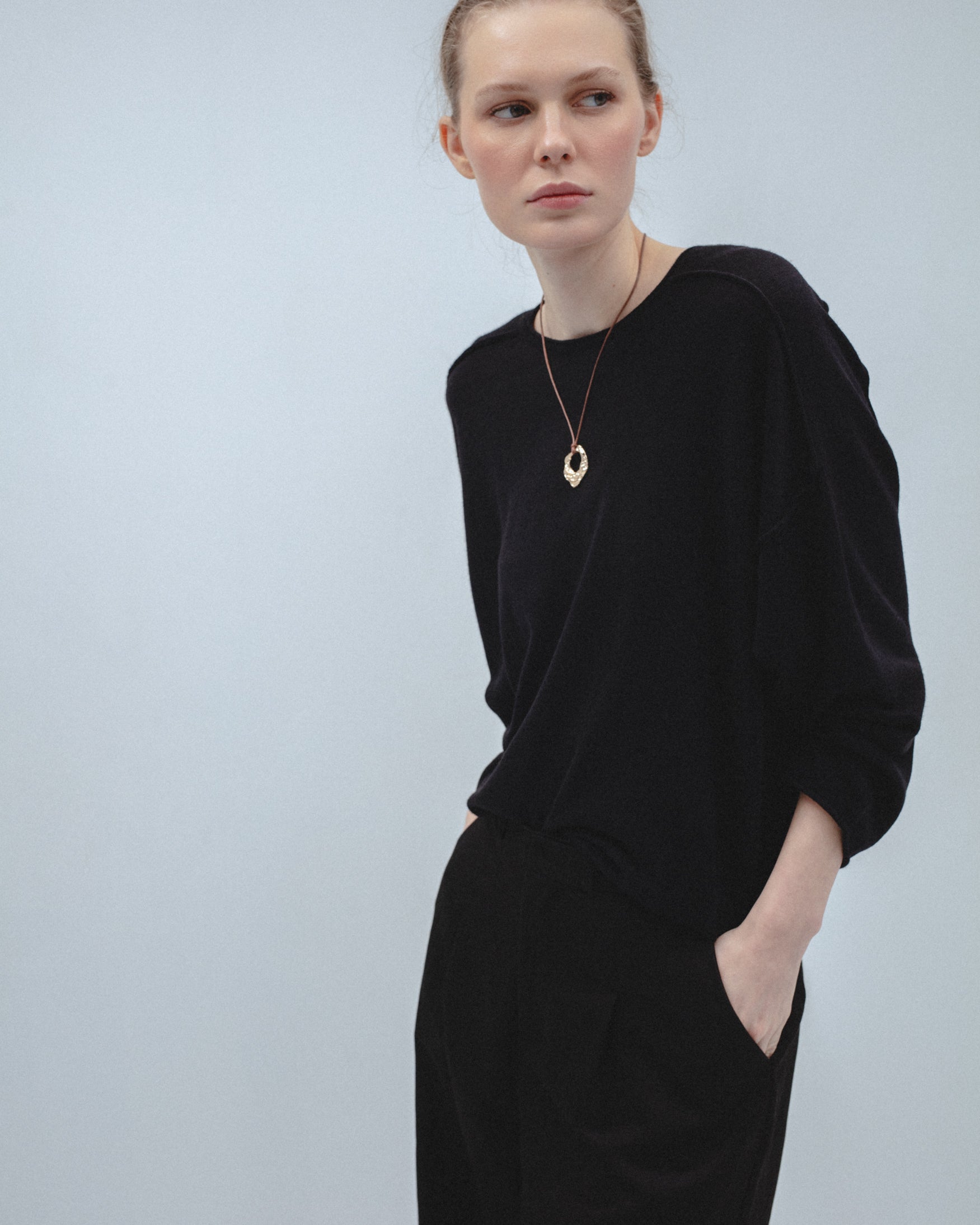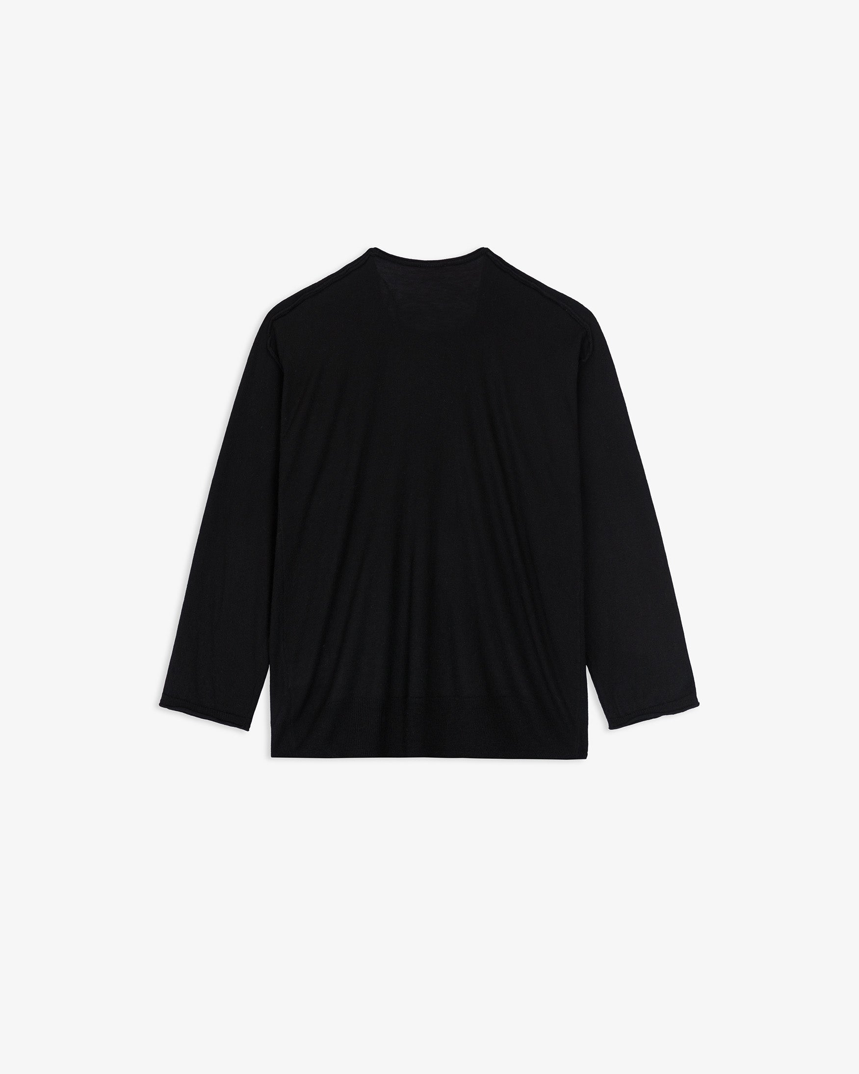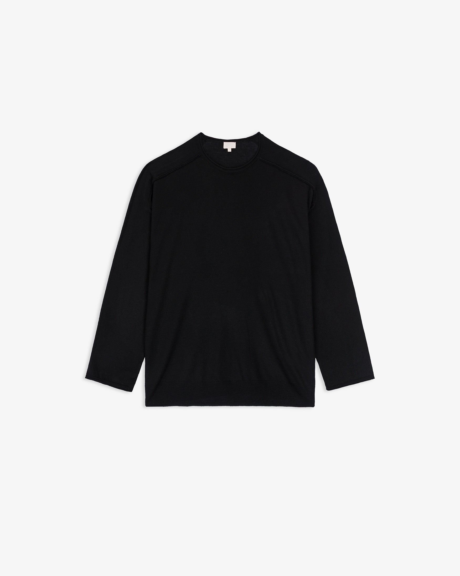 Jersey confeccionado en mezcla de tejido de lana. De cuello redondo y manga larga tipo ranglán. Detalle de costuras caídas en hombros y acabados en roll-up. Tejido de punto fino con efecto vigoré. Corte holgado.