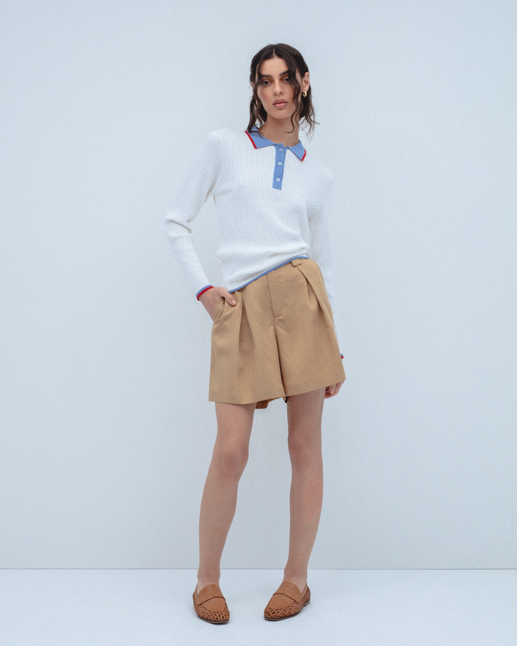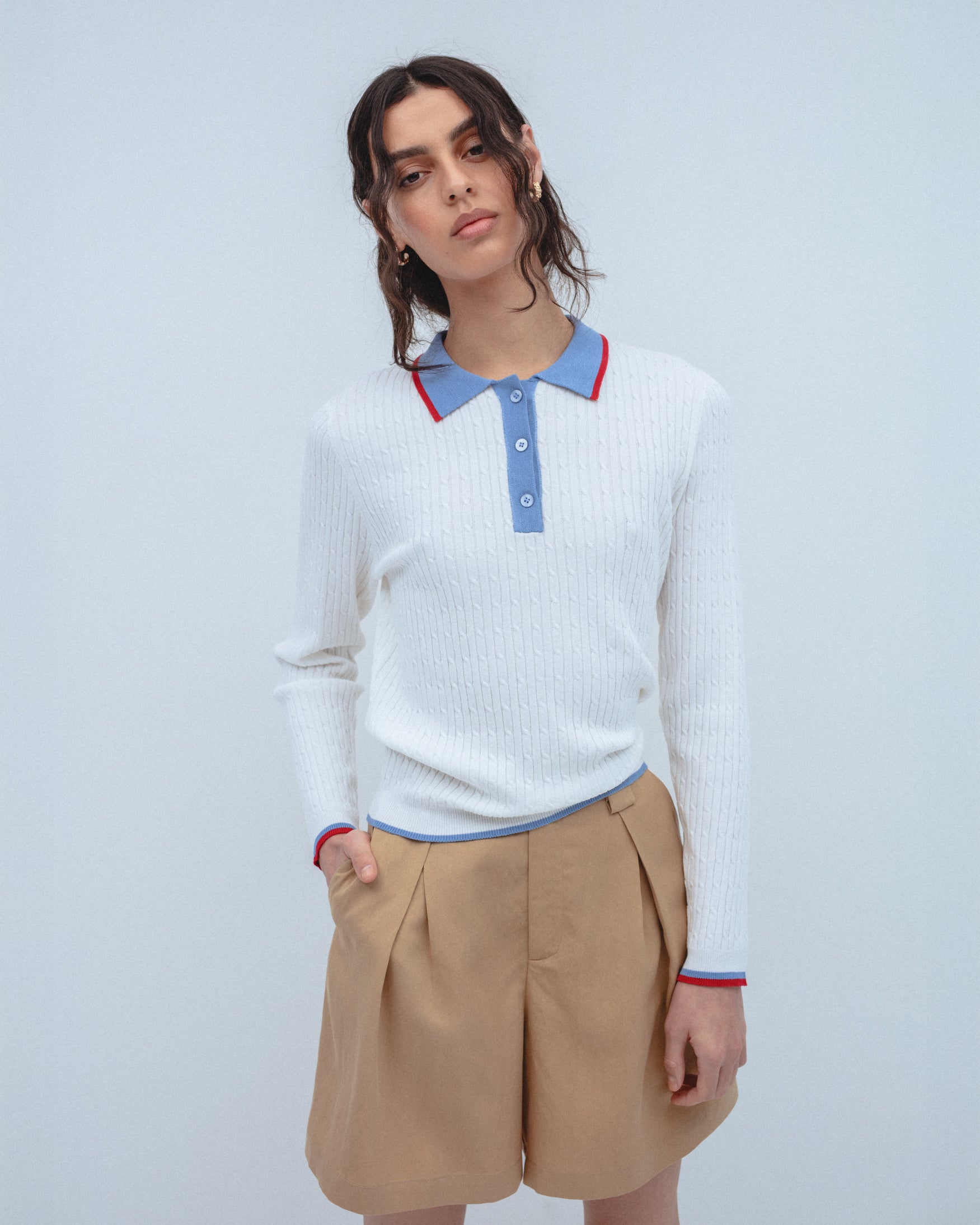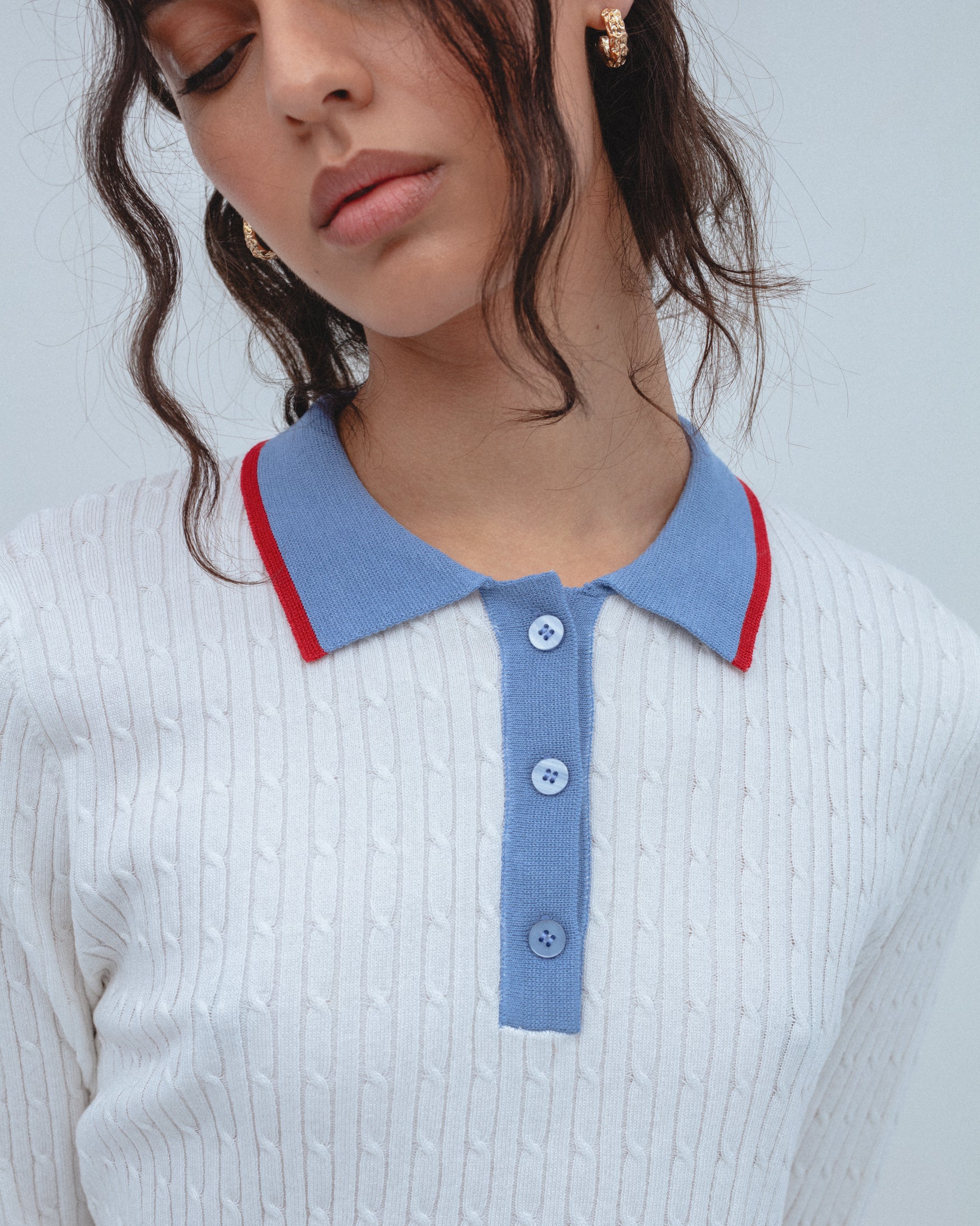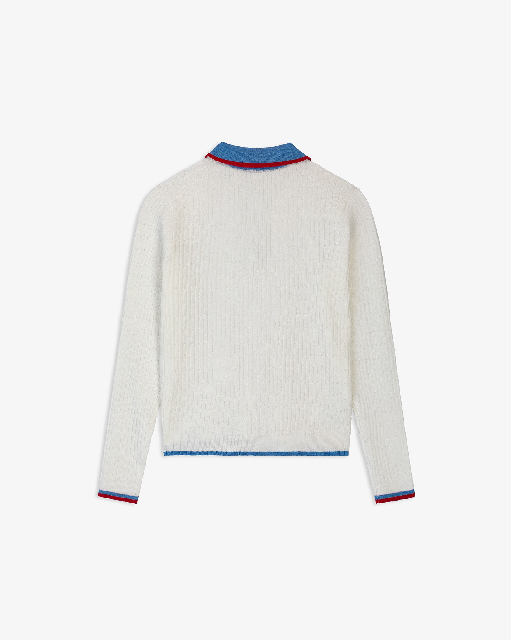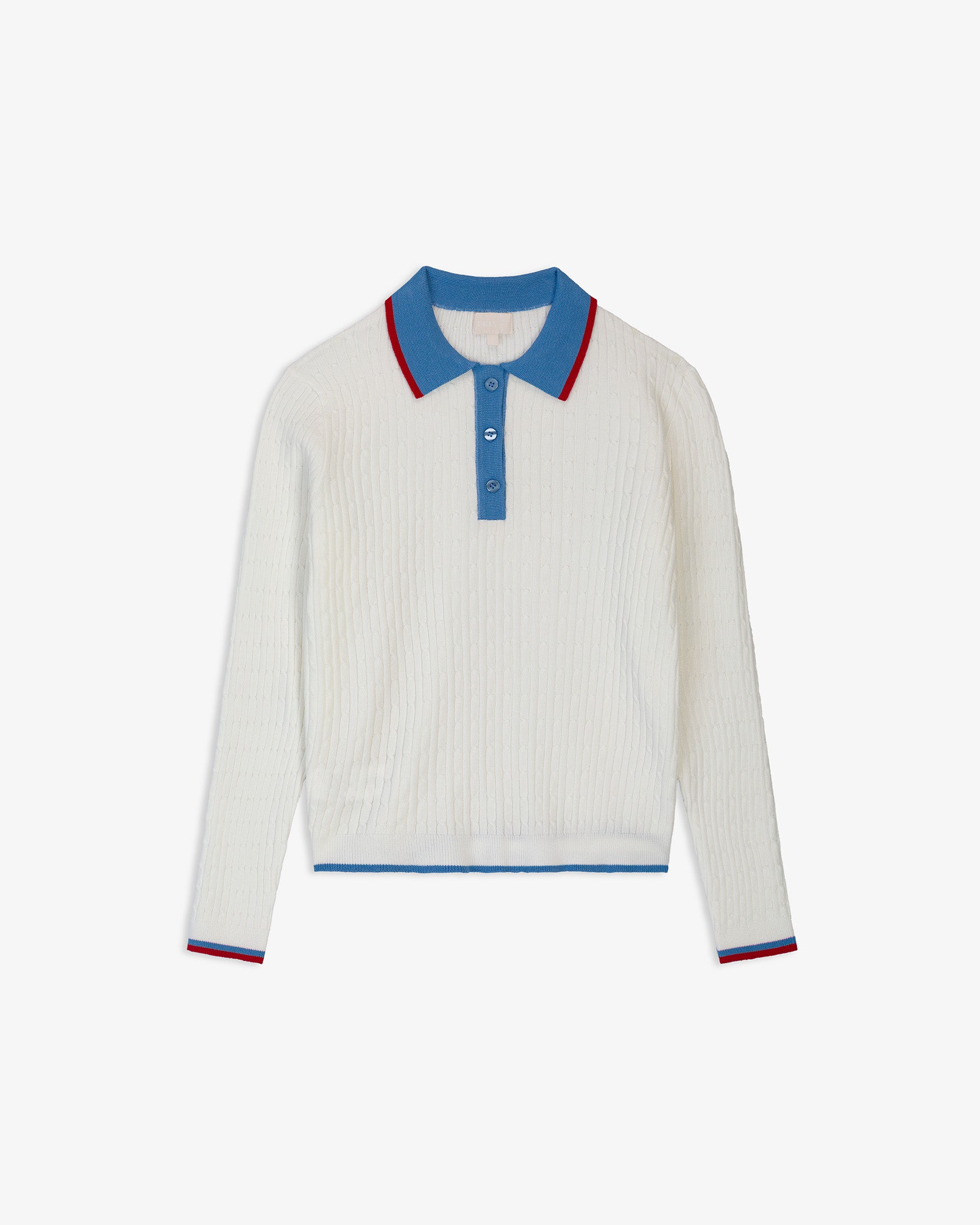 Polo de cuello solapa y manga larga con acabados en rib. Detalle de tejido con estructura de ochos. Cuello, abotonadura frontal y vivos a contraste.