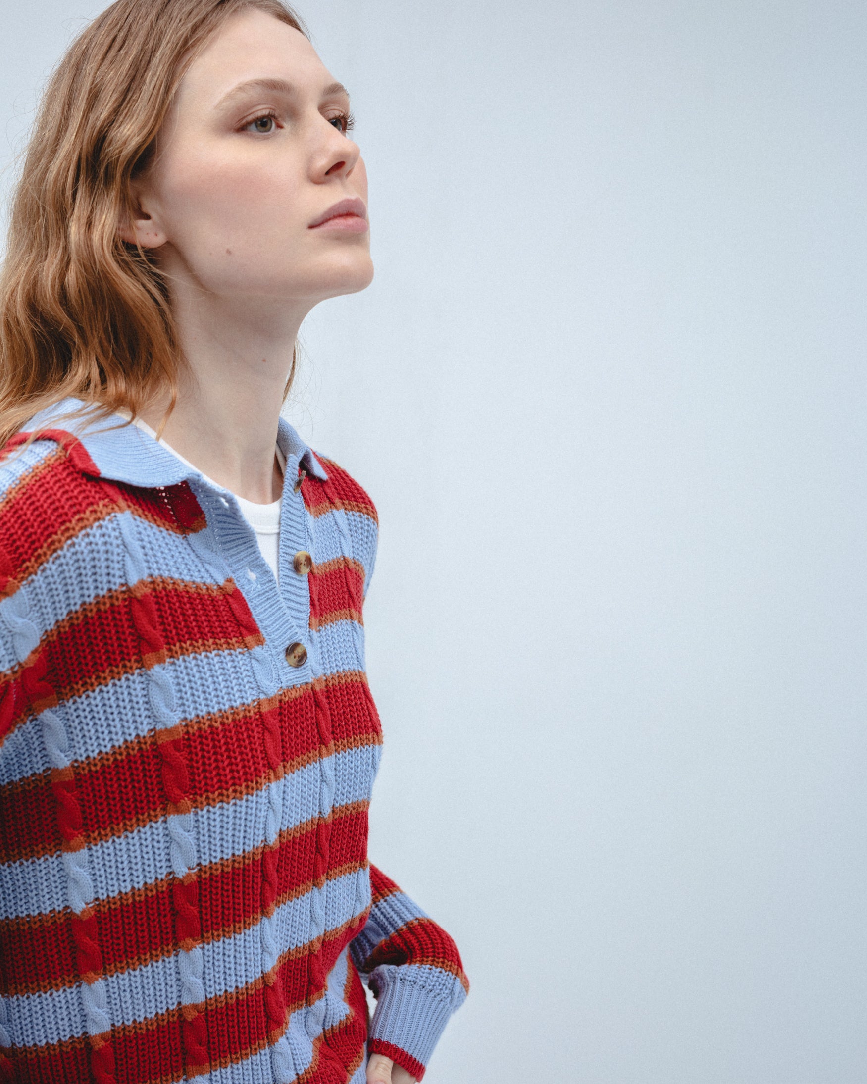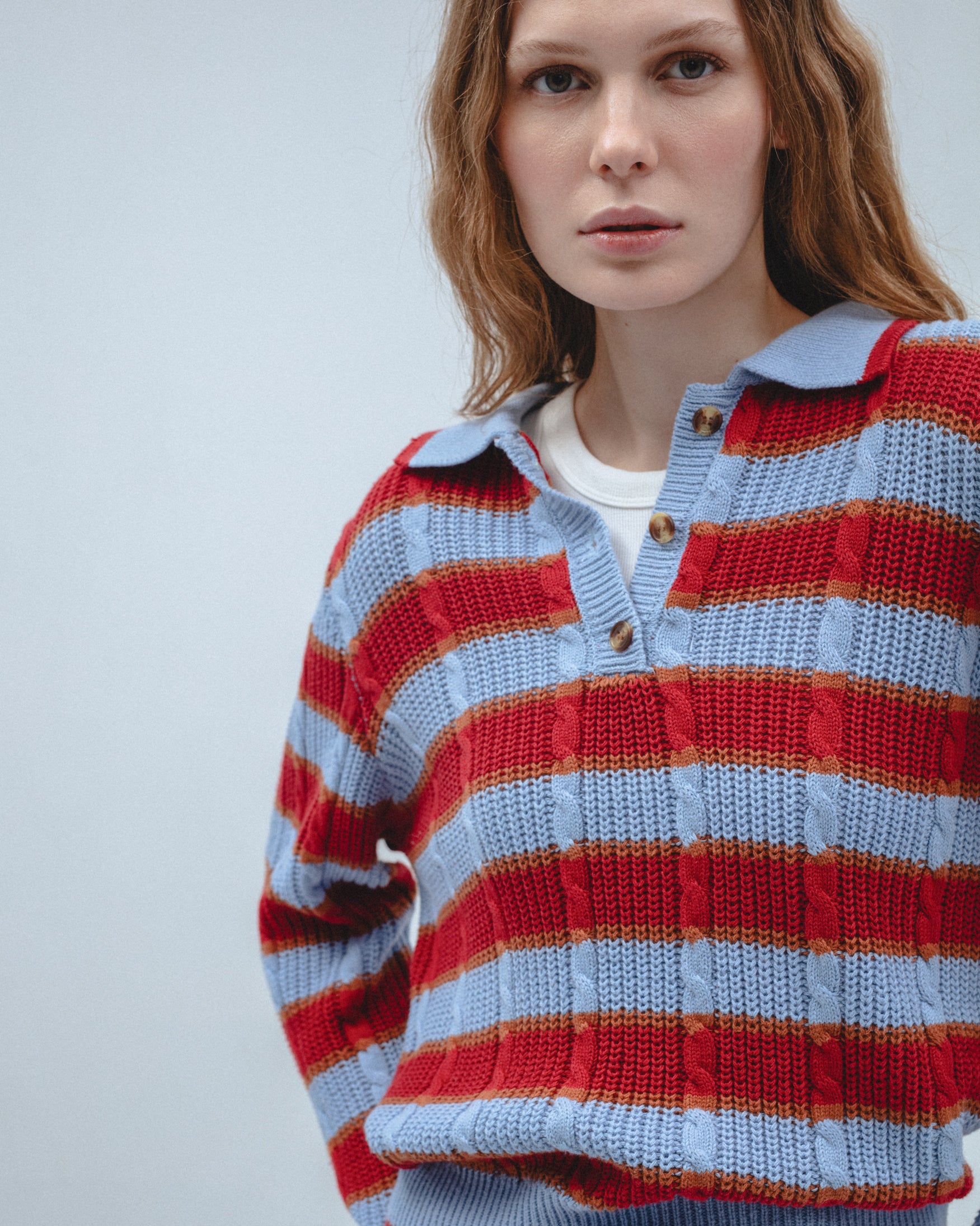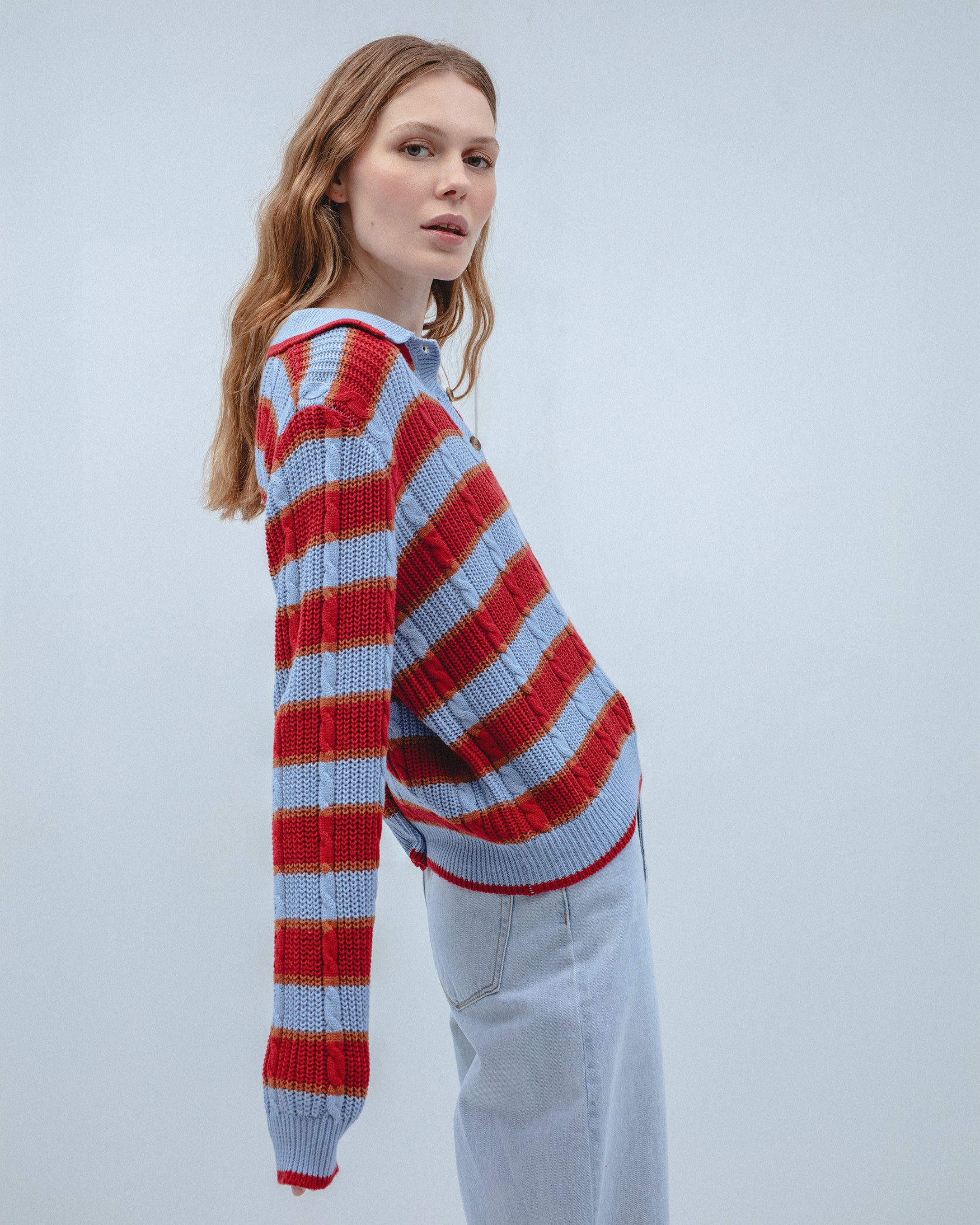 Jersey de cuello polo y manga larga confeccionado en punto con textura de ochos. Diseño con estampado de rayas horizontales multicolores y cierre frontal con botones efecto carey.