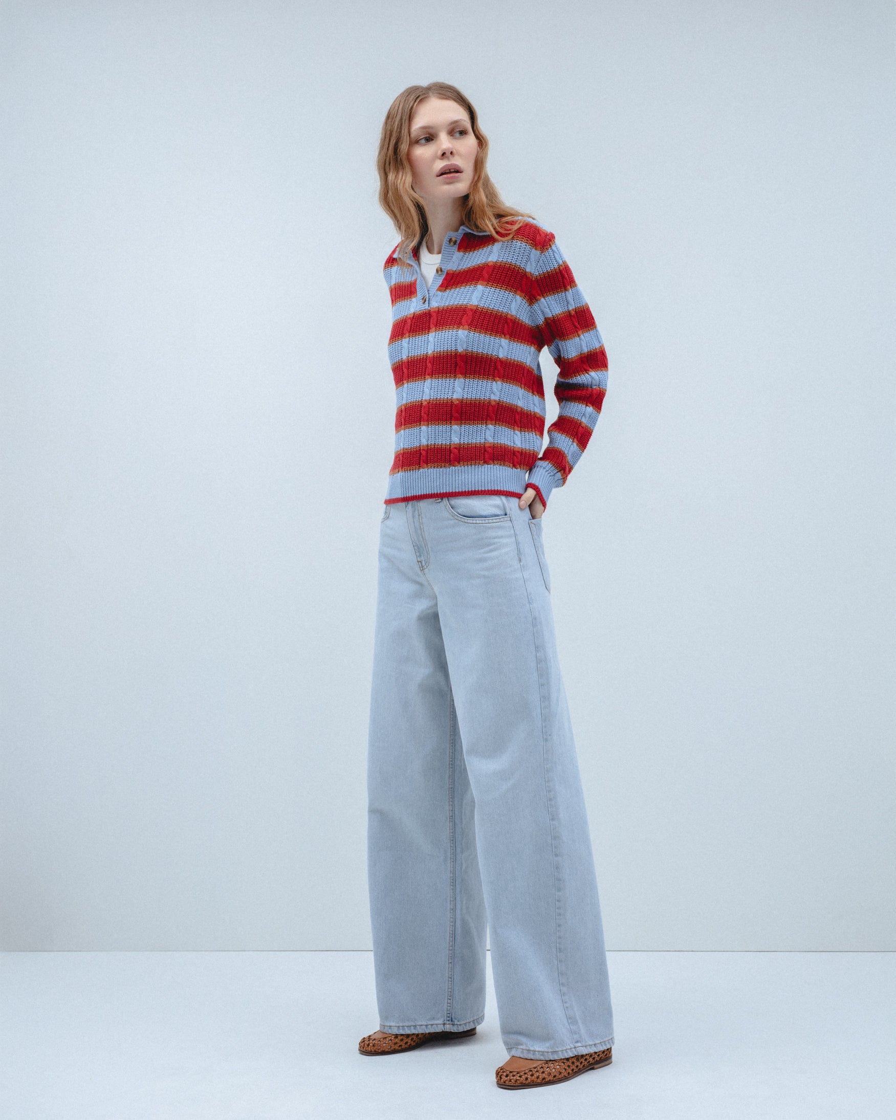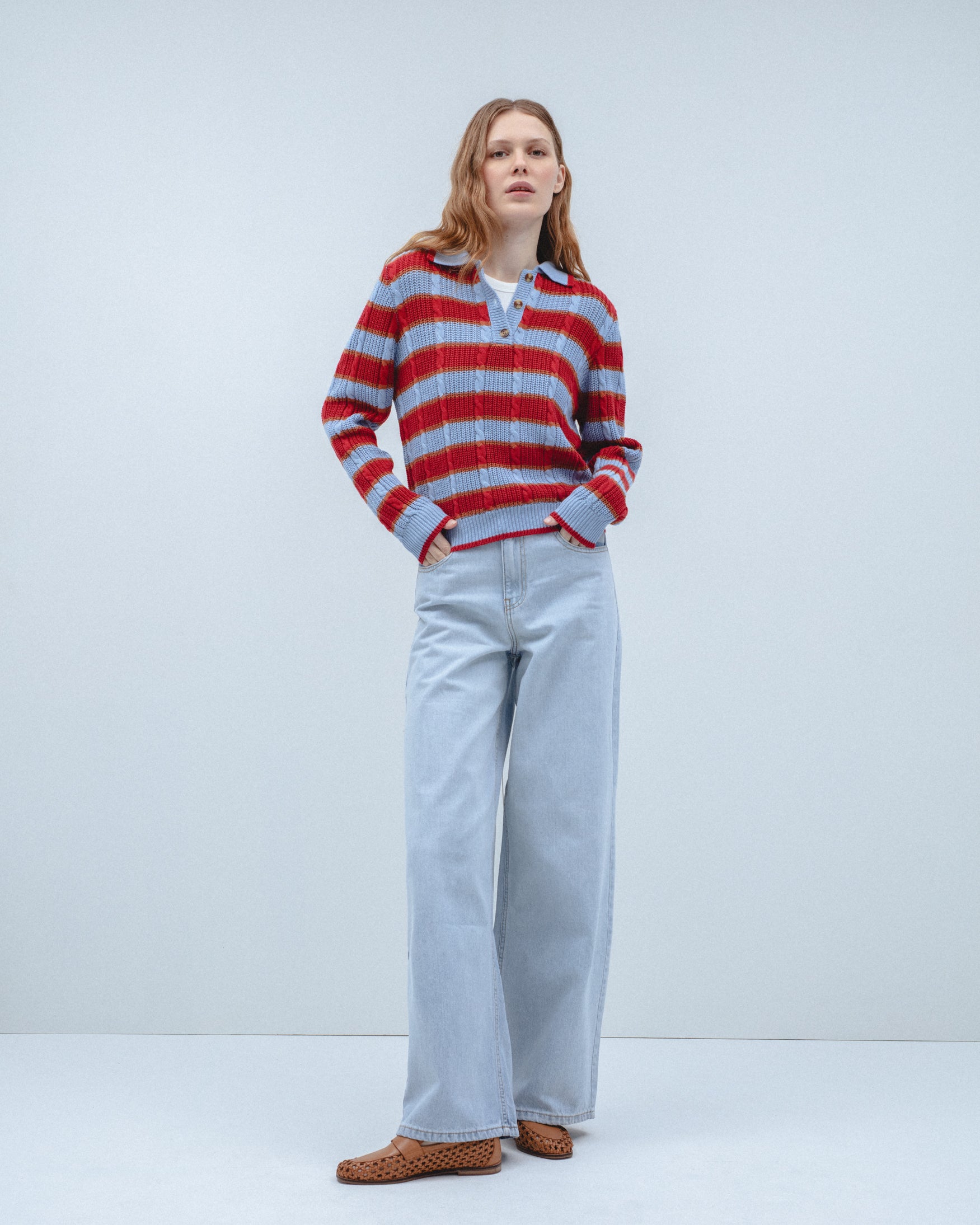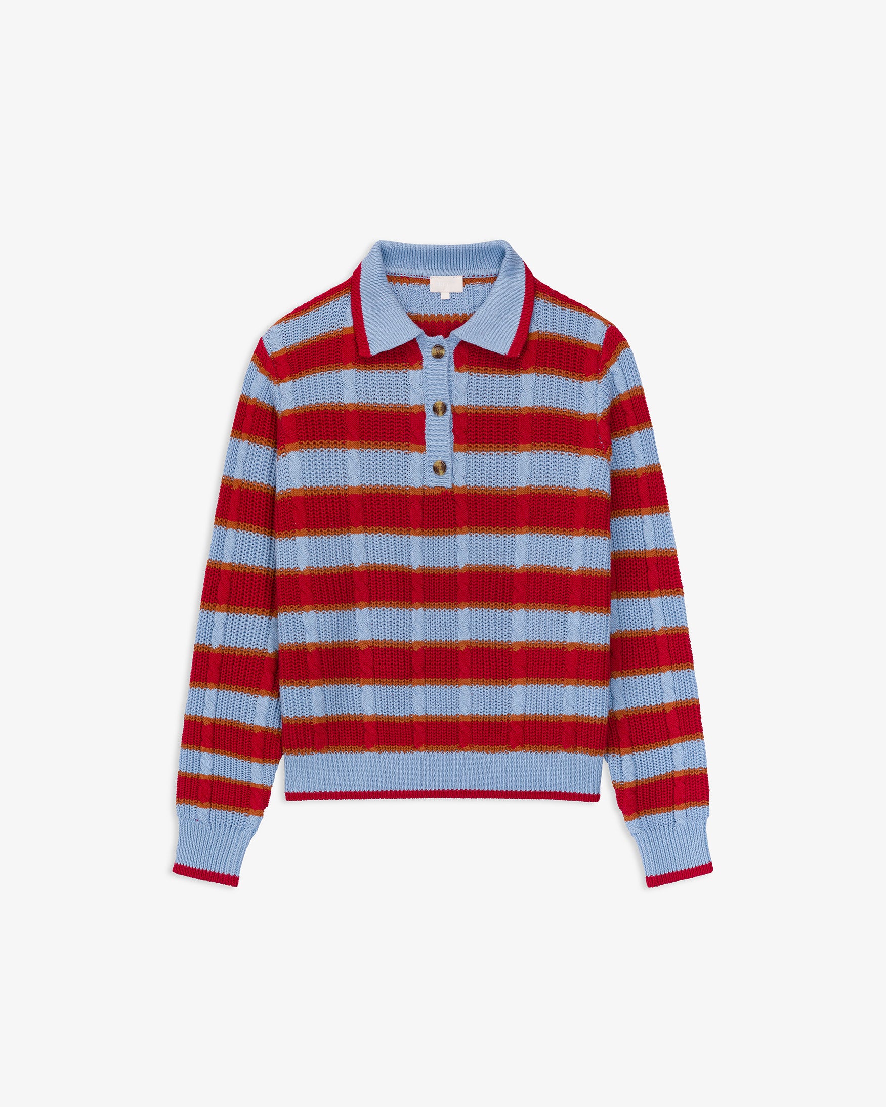 Jersey de cuello polo y manga larga confeccionado en punto con textura de ochos. Diseño con estampado de rayas horizontales multicolores y cierre frontal con botones efecto carey.