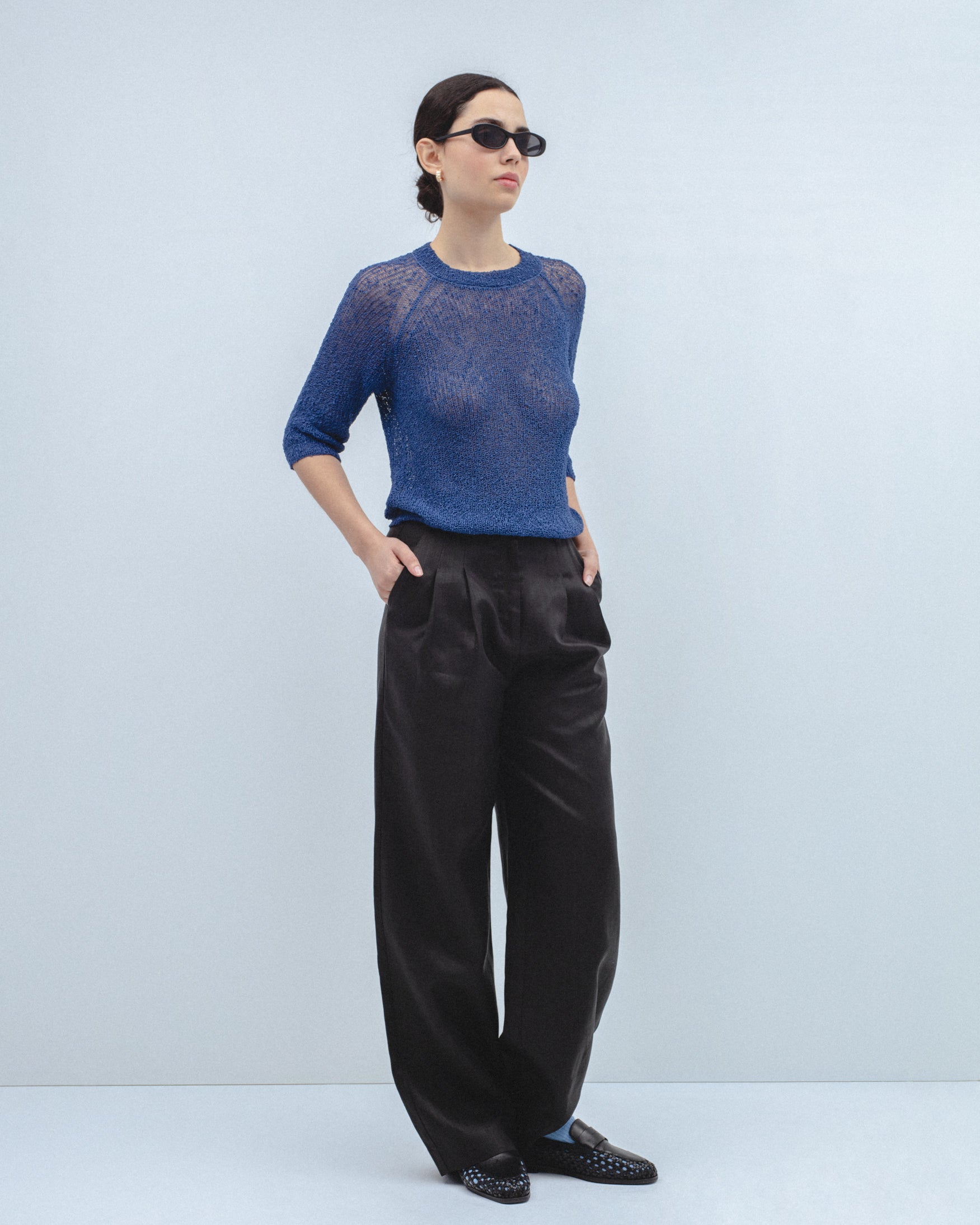 Jersey de cuello redondo y manga por debajo del codo tipo raglán. Detalle de tejido en punto calado con ligeras transparencias. Acabados en rib.