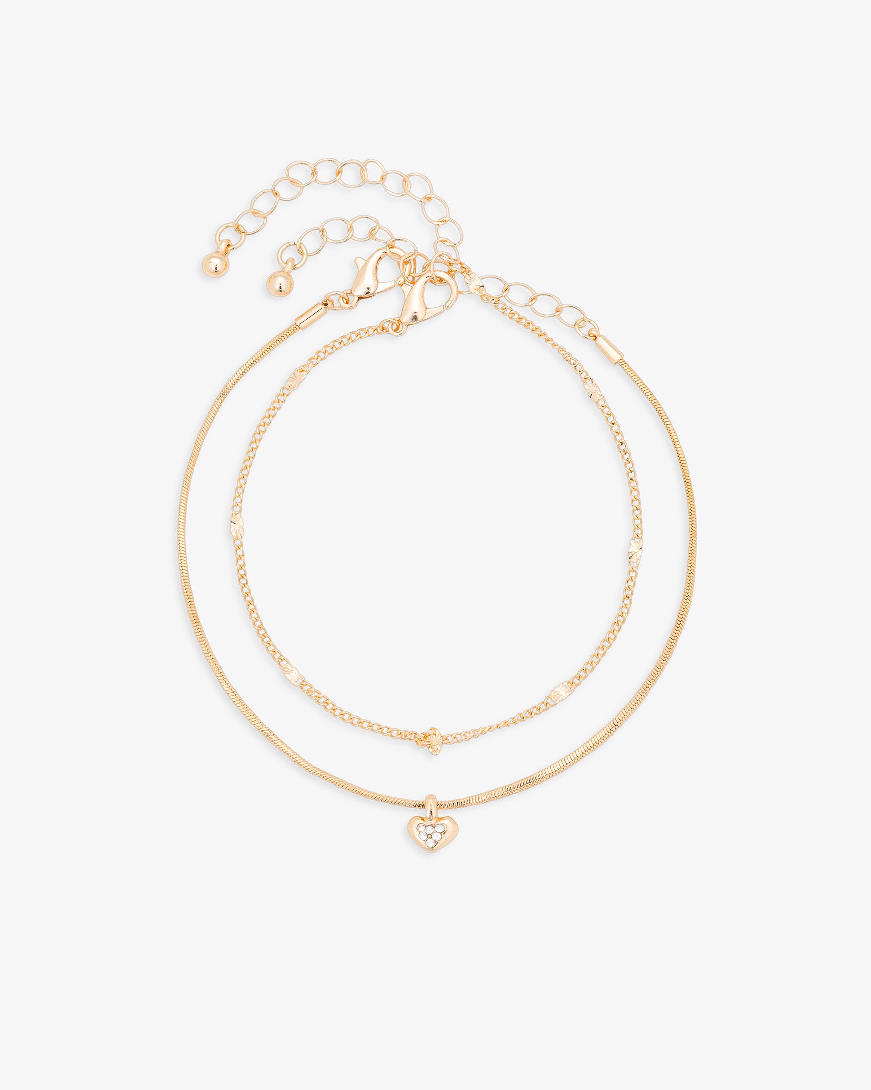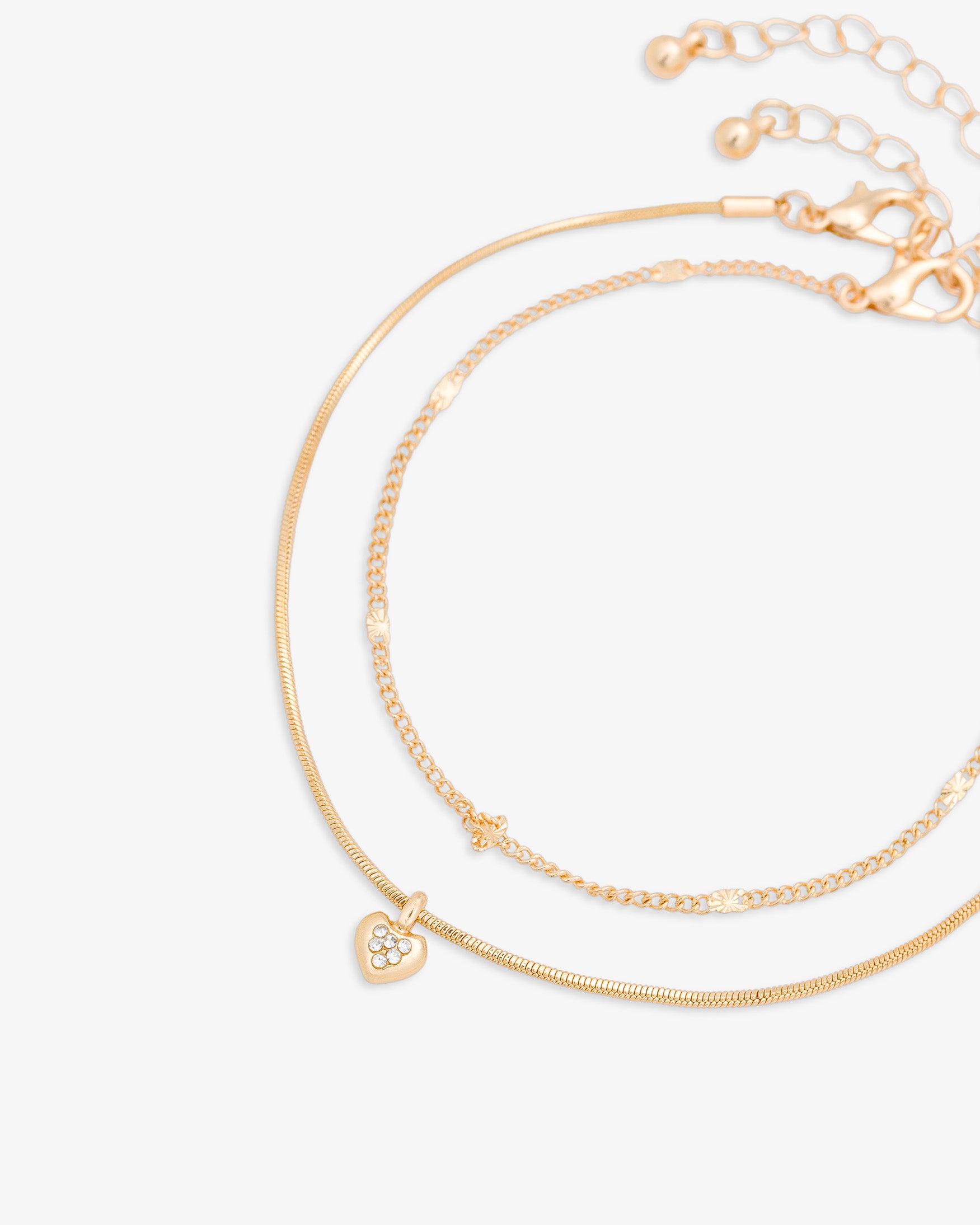 Set de dos pulseras de cadena metálica fina con diferentes texturas. Un diseño de cordón rígido con aplicación de colgante en forma de corazón y detalle de cristales brillantes, y otro de eslabones con pequeñas piezas circulares. Cierre mediante mosquetón y cadena ajustable.