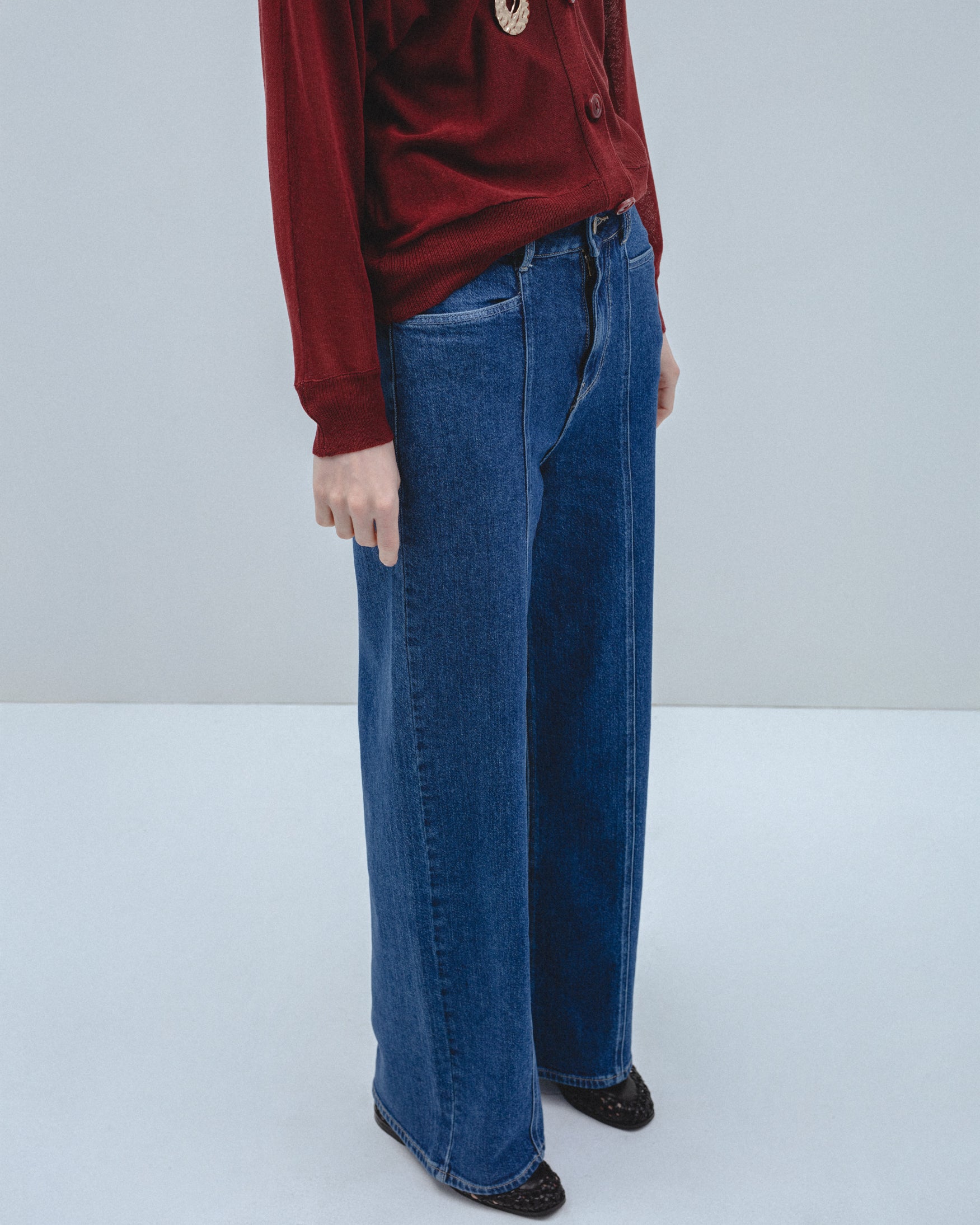 Jeans de tiro alto con cinco bolsillos. Detalle de costuras marcadas en el delantero y espalda. Pernera ancha. Cierre frontal con cremallera y botón metálico.