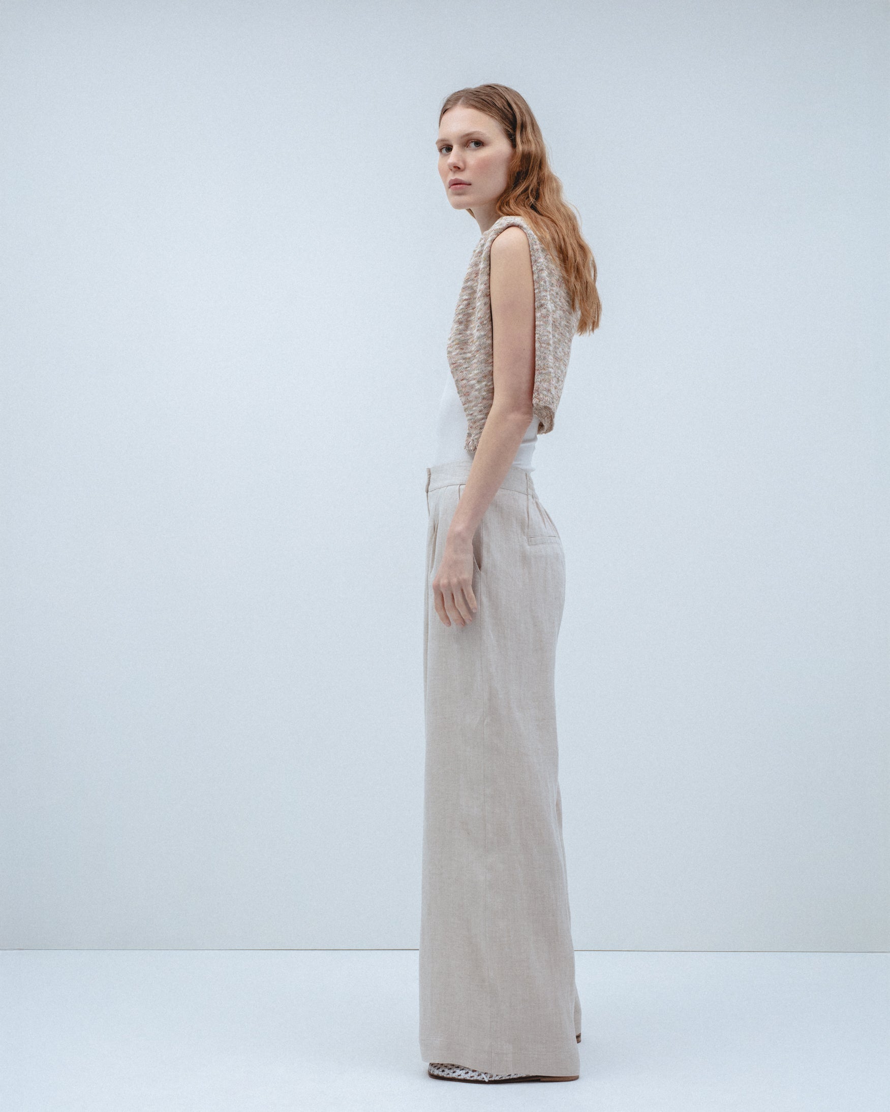 Pantalón confeccionado en mezcla de tejido de lino. De tiro alto con cintura elástica en espalda. Bolsillos laterales y detalle de pinzas delanteras. Bolsillos de vivo en espalda. Pernera ancha. Cierre frontal con cremallera y botón.