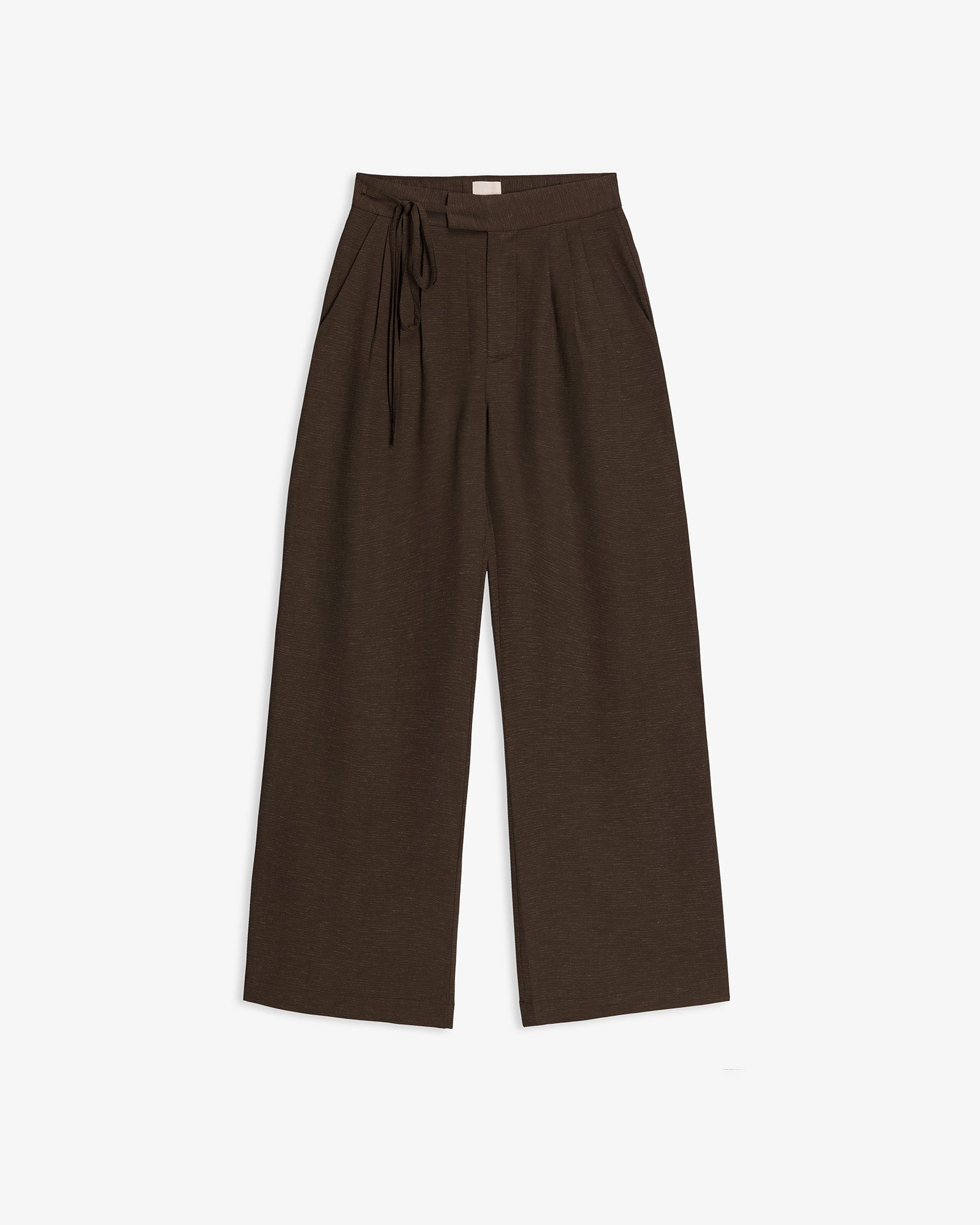 Pantalón de tiro alto confeccionado en tejido con mezcla de lino. Bolsillos laterales y detalle de falsos bolsillos de vivo en espalda. Pernera ancha. Cierre frontal mediante cremallera, botón interior y cinturón tipo cordón en mismo tejido con lazada.