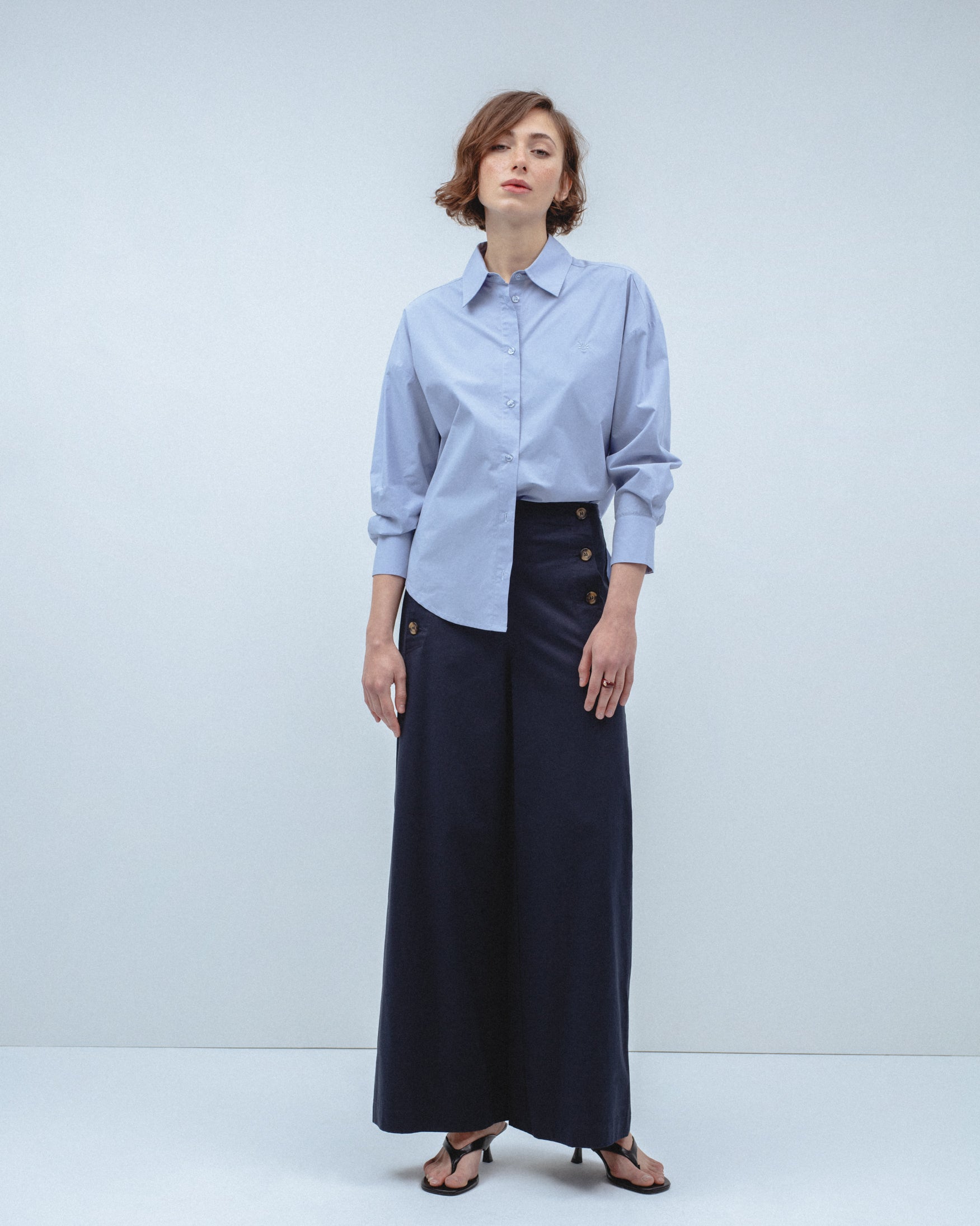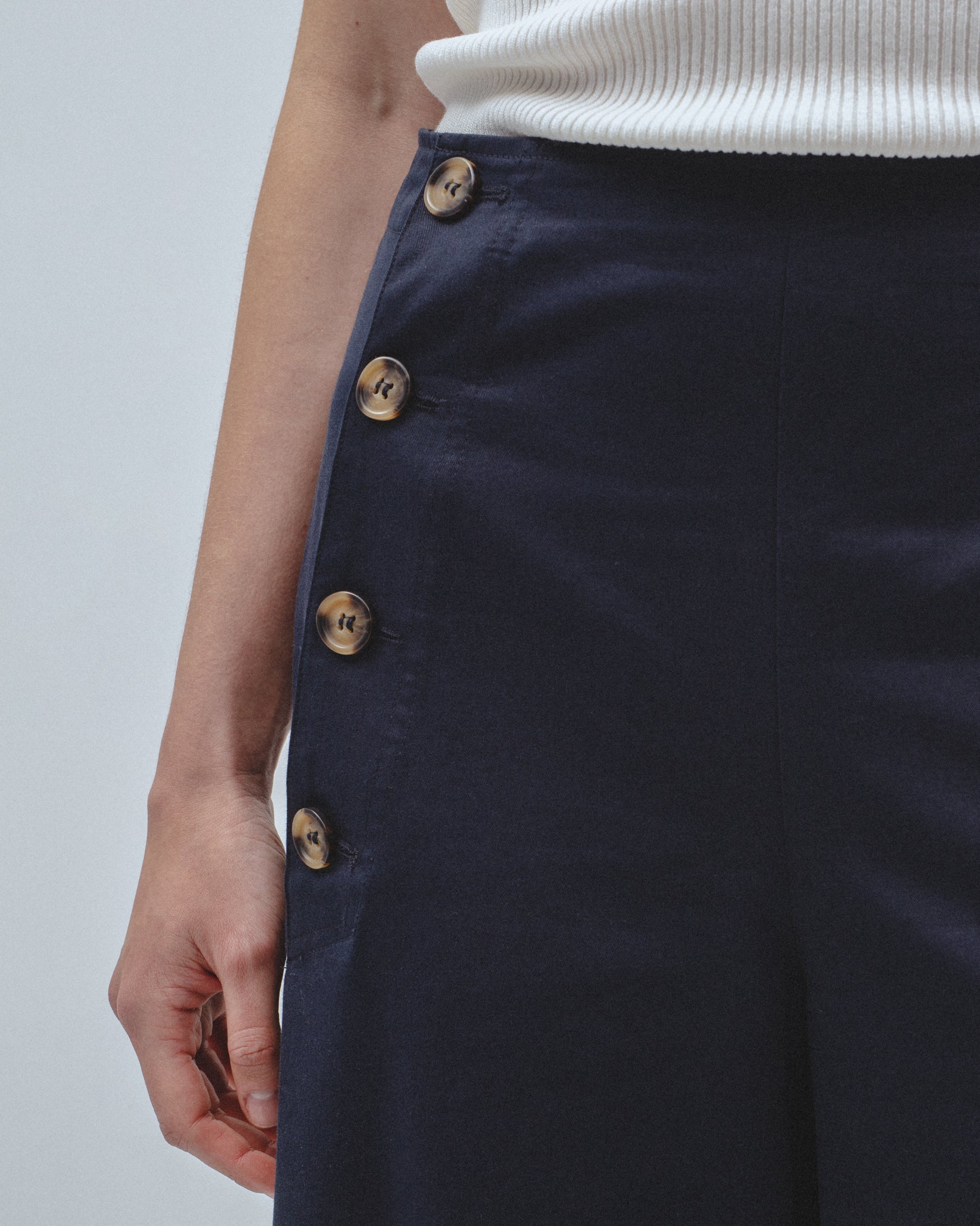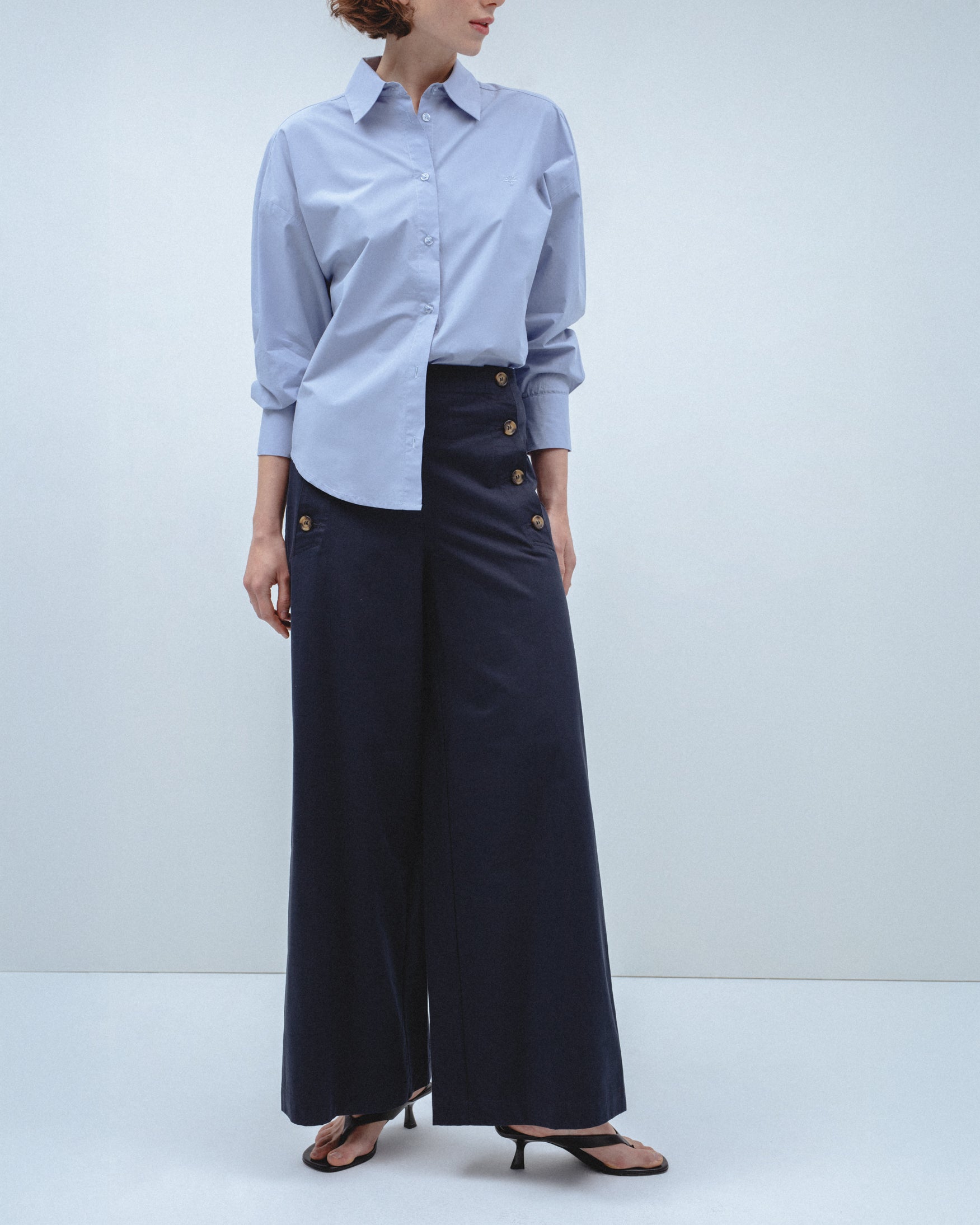 Pantalón de tiro alto confeccionado en tejido con mezcla de algodón. Detalle de botones metálicos dorados en delantero. Bolsillos laterales de vivo y falsos bolsillos de vivo en espalda. Pernera ancha. Cierre lateral con cremallera oculta en costura.