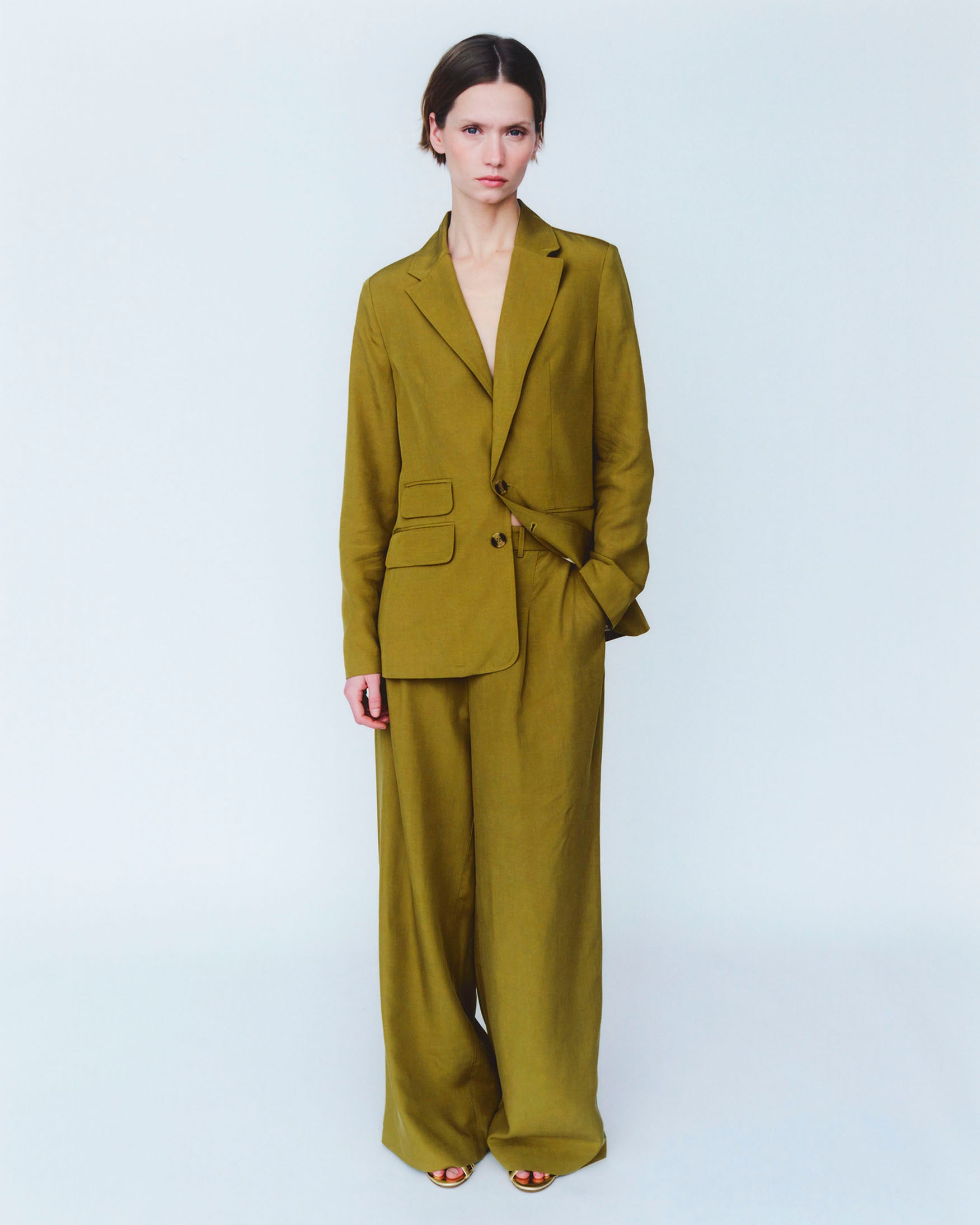 Pantalón de tiro medio con pinzas en delantero. Bolsillos laterales y de vivo en espalda. Pernera ancha. Cierre frontal con cremallera, botón interior y gancho metálico.