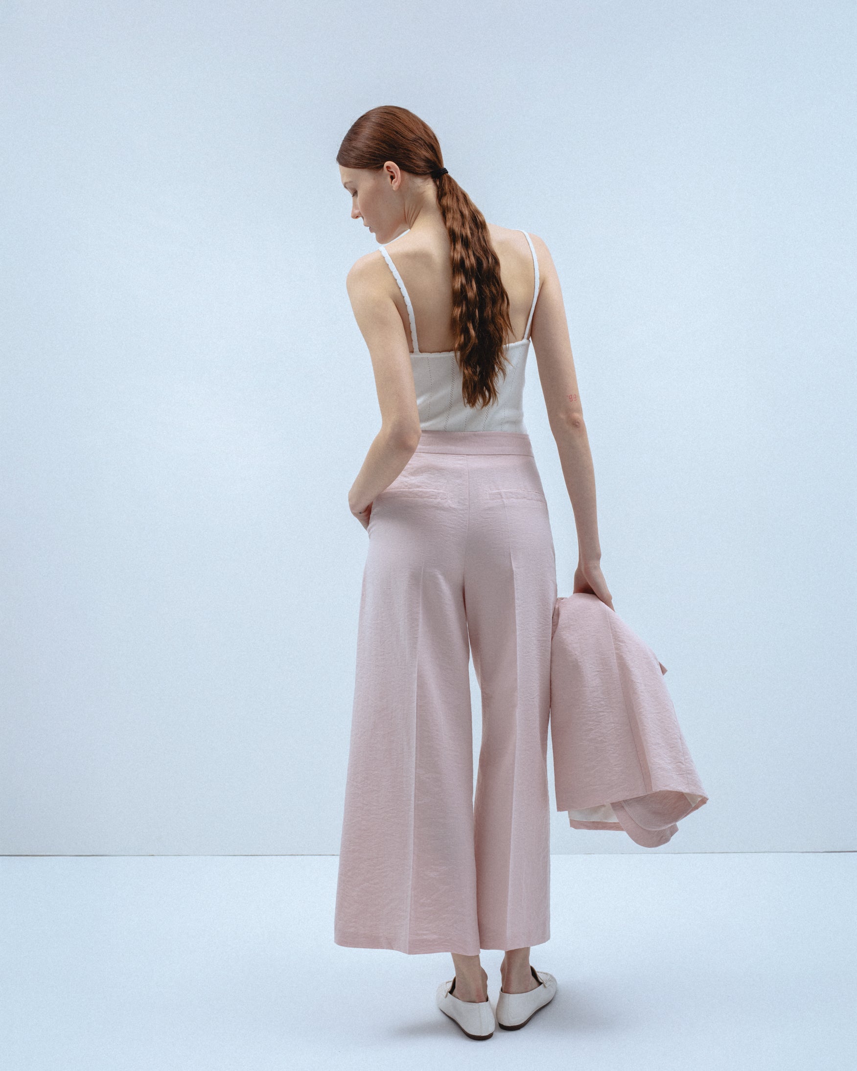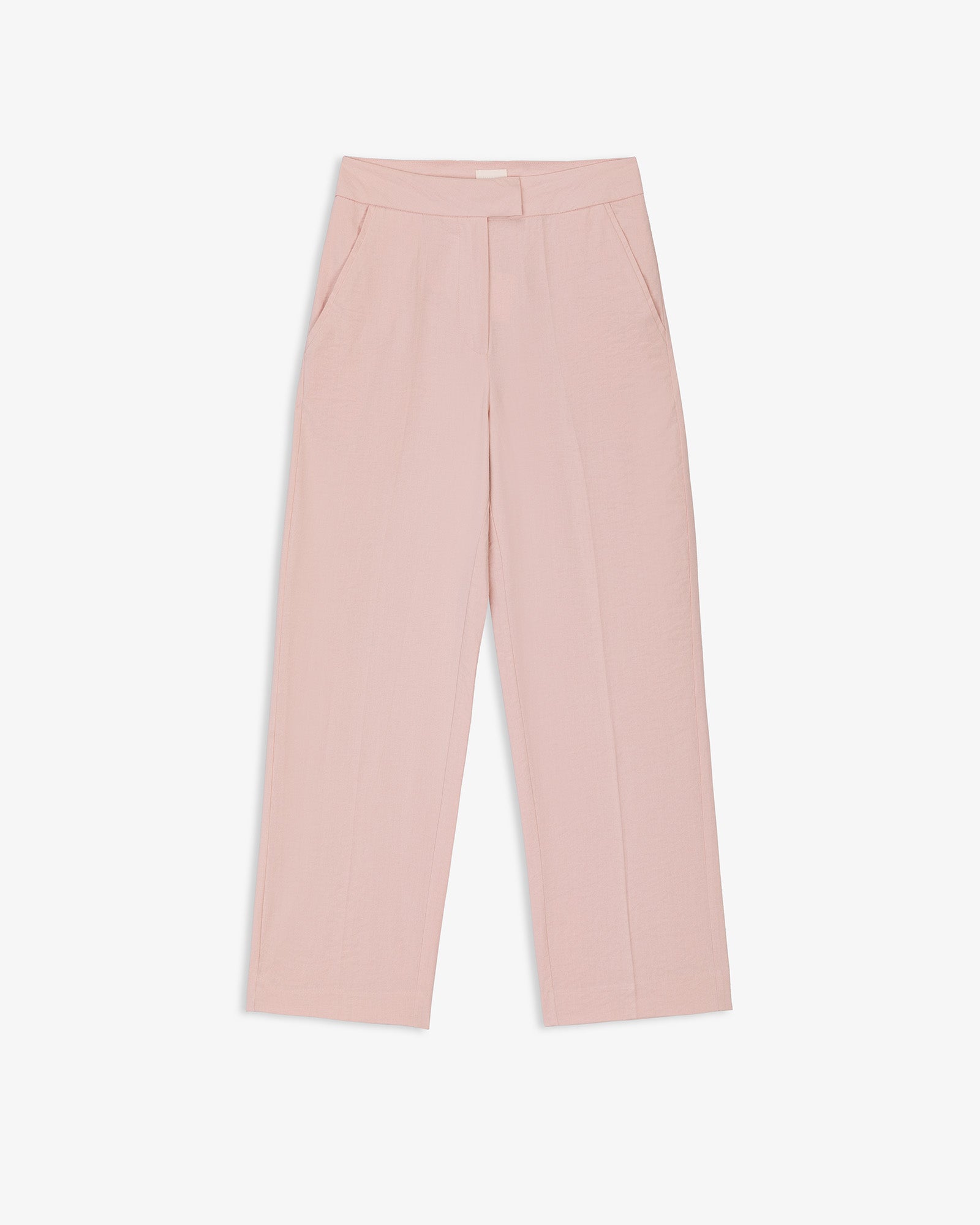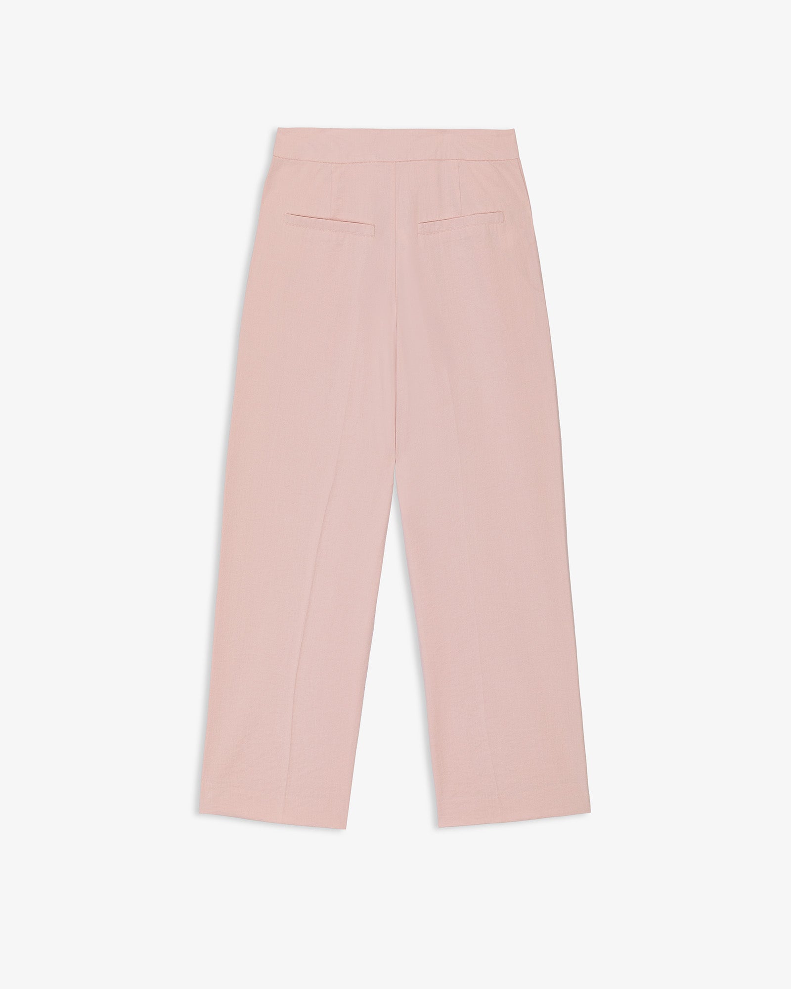 Pantalón de tiro alto confeccionado en tejido con mezcla de algodón. Pernera ancha con detalle de costura marcada en el delantero. Bolsillos laterales de vivo y cierre frontal con cremallera, botón interior y gancho metálico.