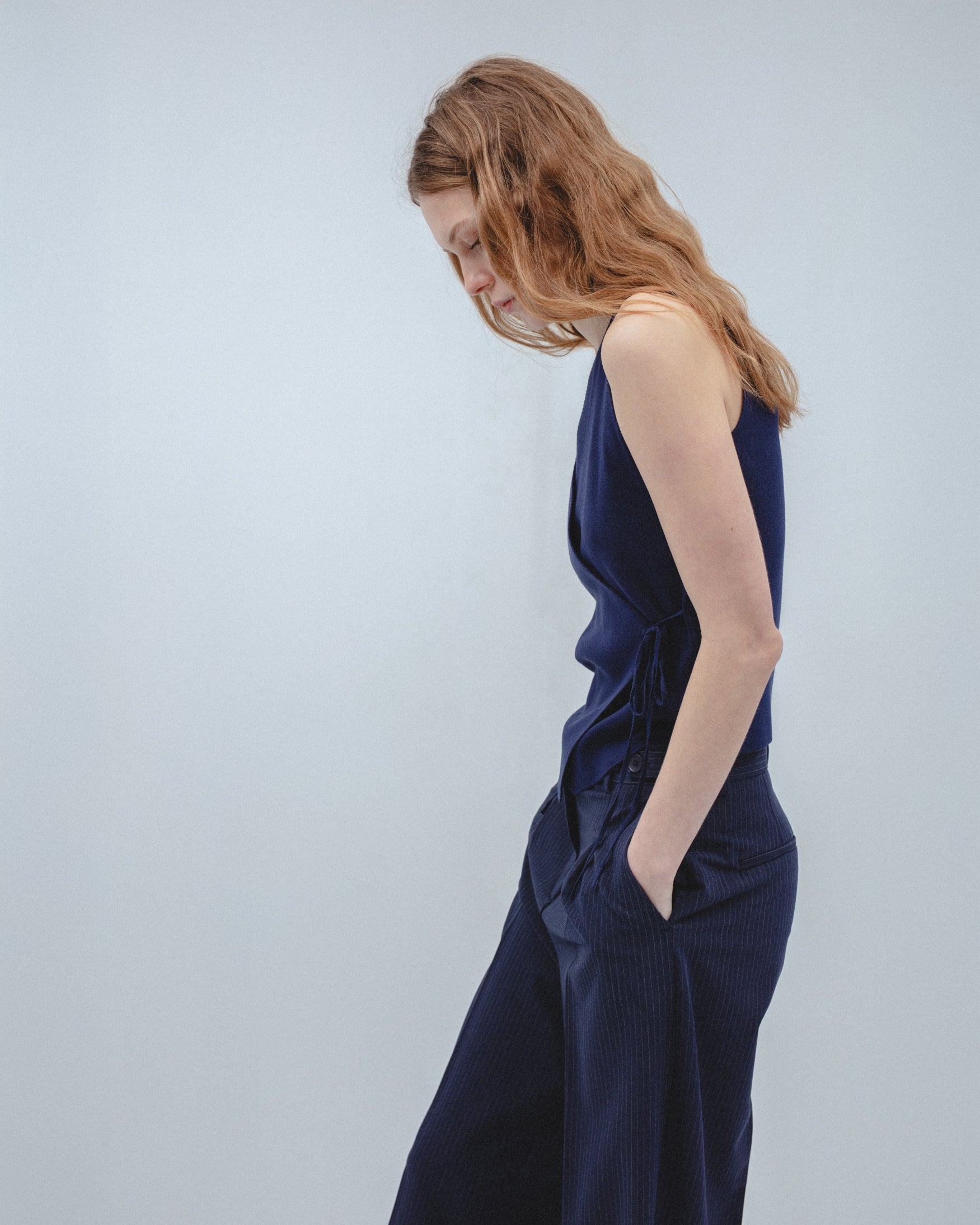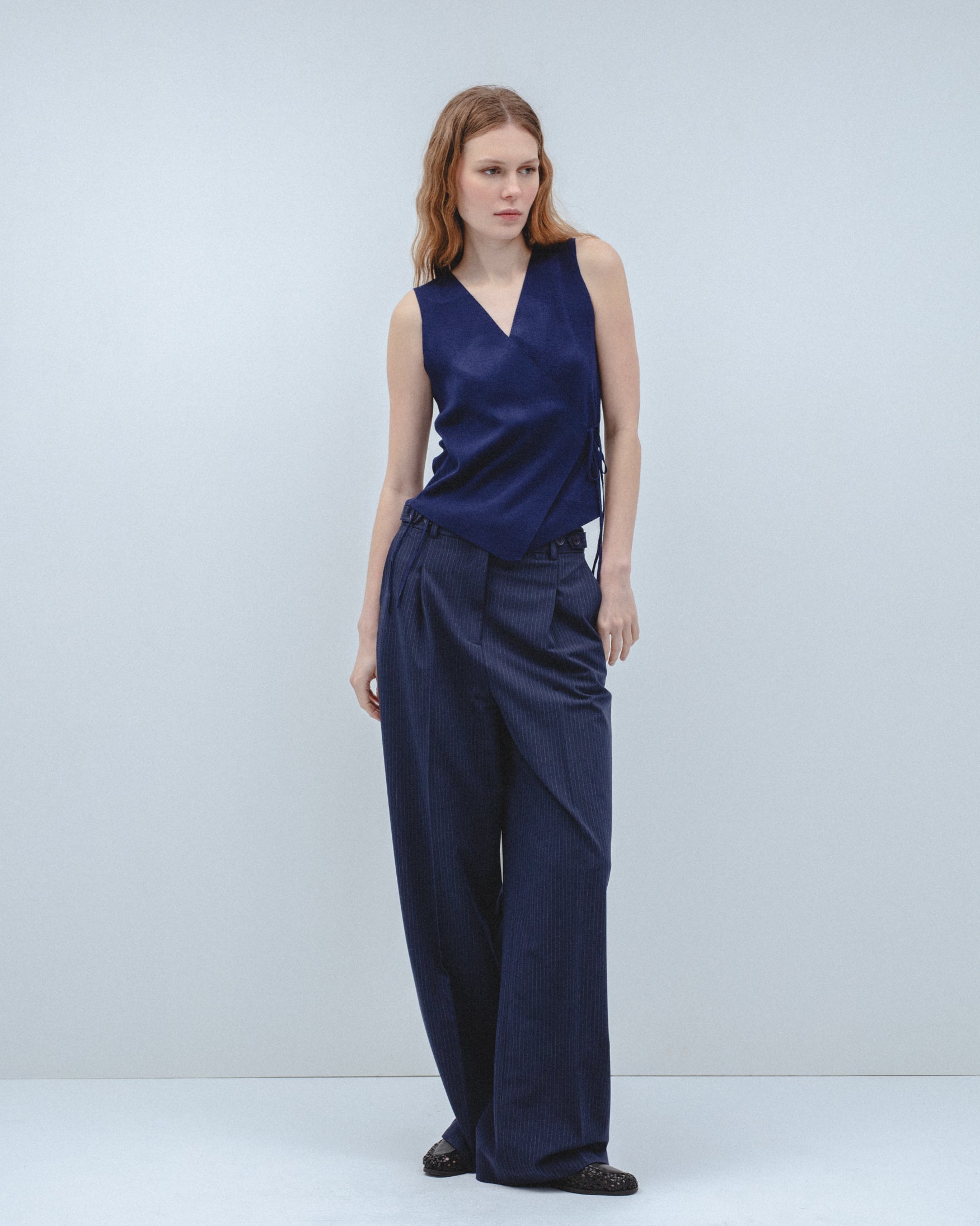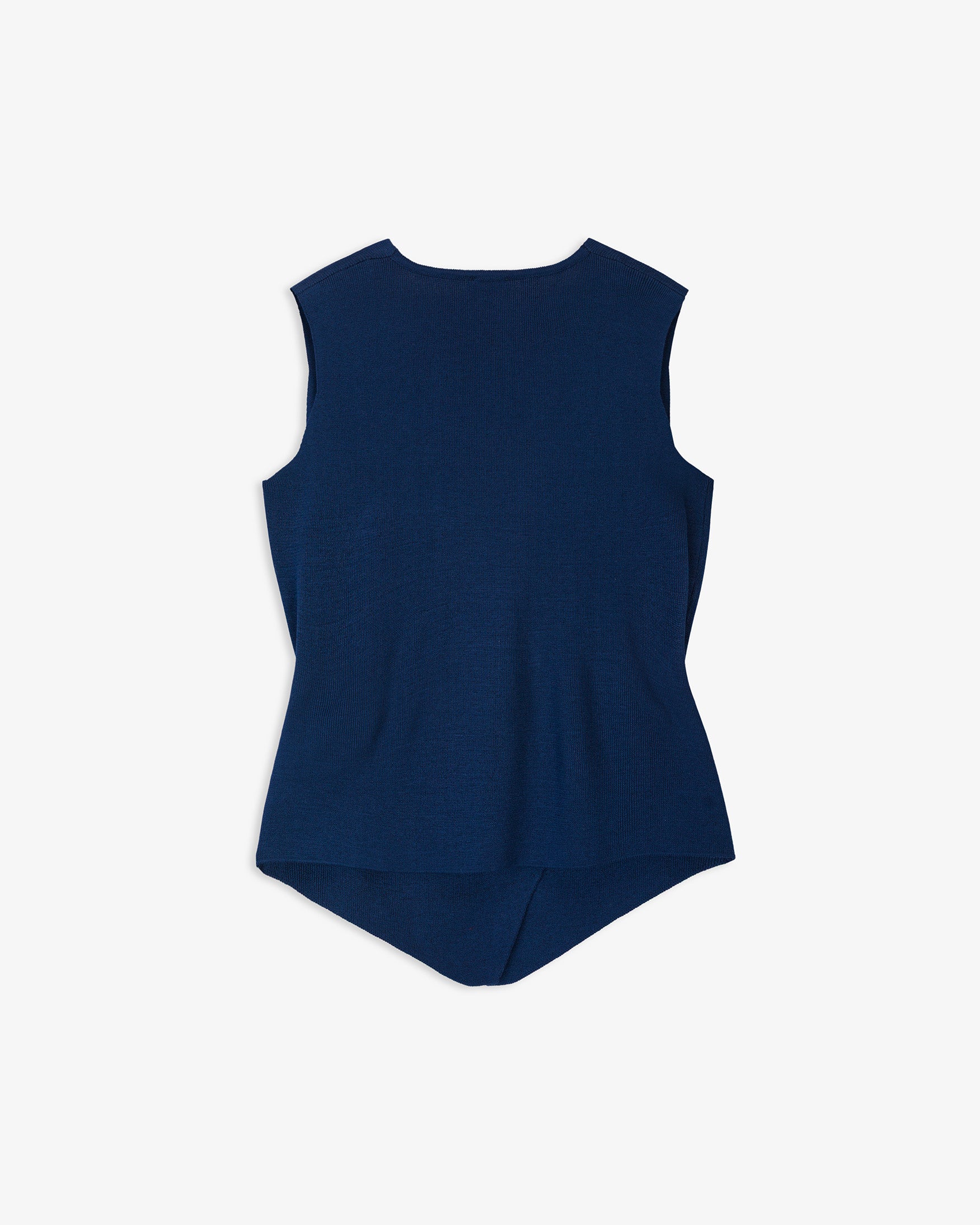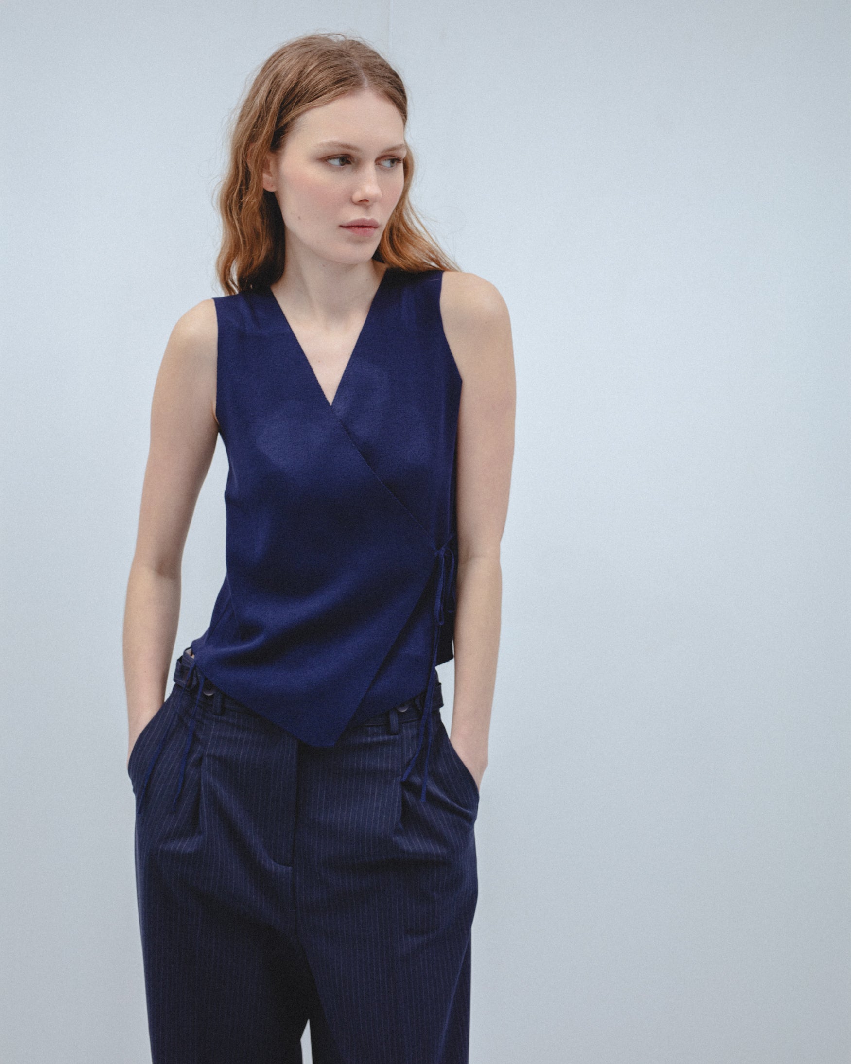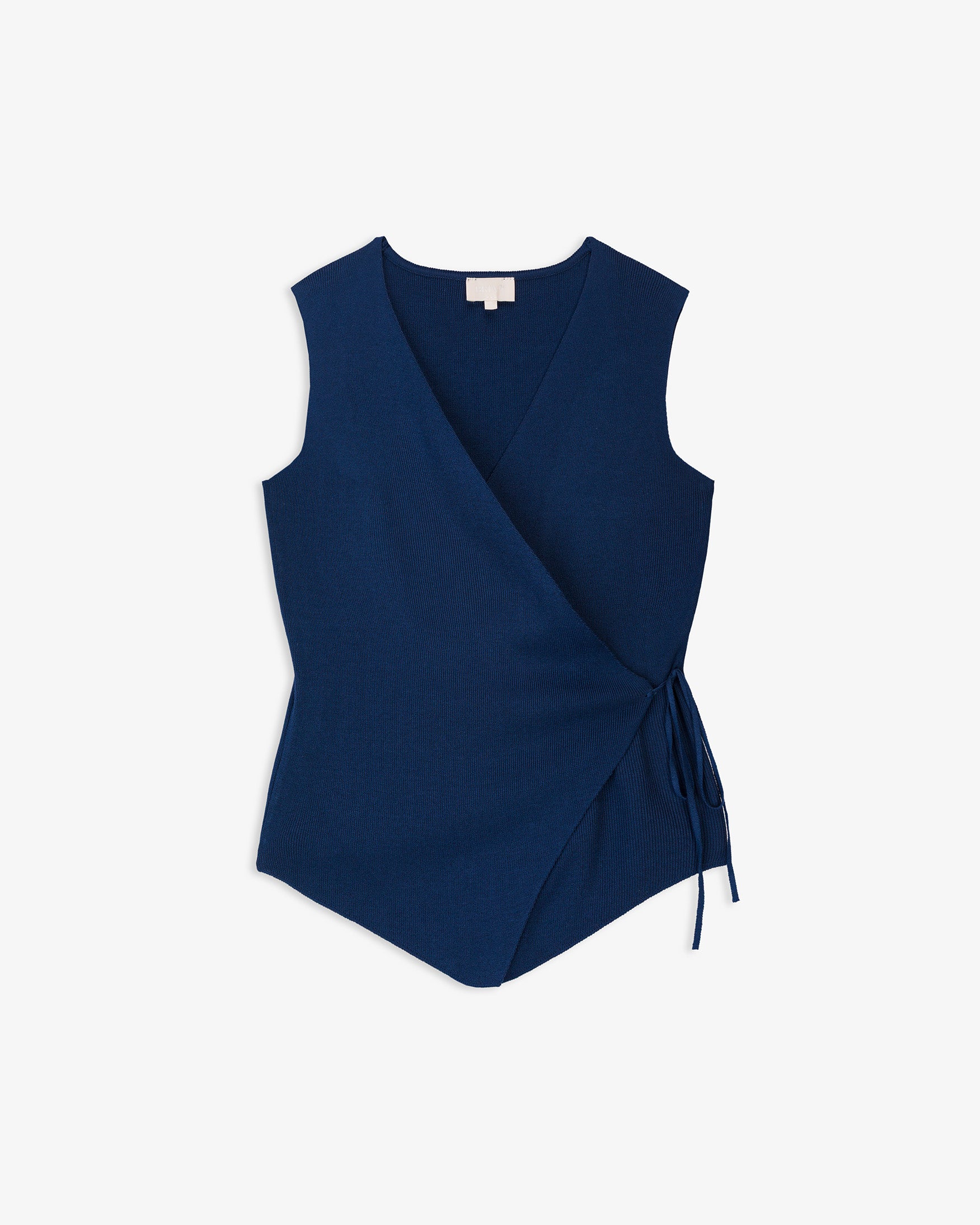 Top de escote pico y manga sisa. Detalle de tejido cruzado en delantero con cierre mediante lazadas laterales. Bajo con acabado en pico.