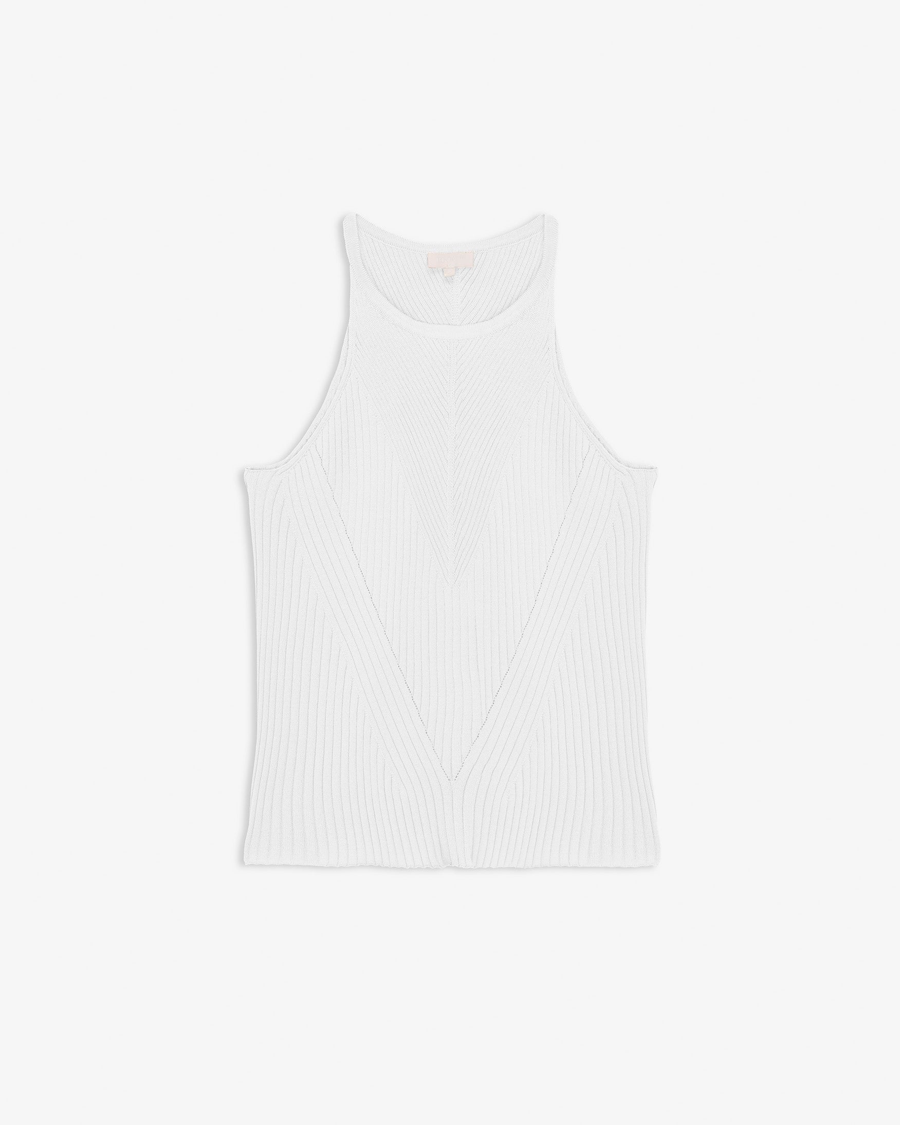 Top de cuello halter y manga sisa. Detalle de tejido en punto elástico con combinación de estructuras en delantero formando motivos geométricos. Acabados en rib fino. Corte entallado.