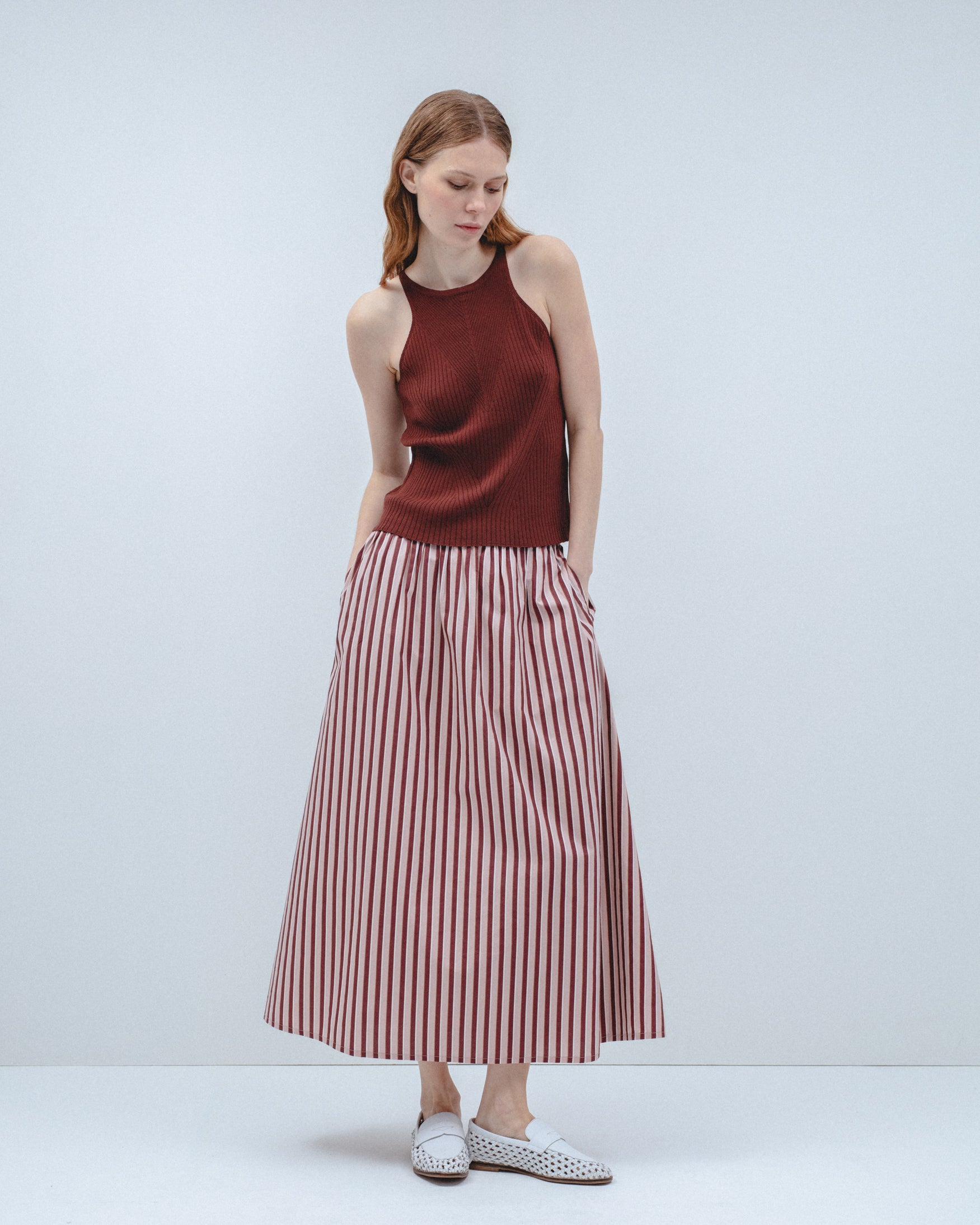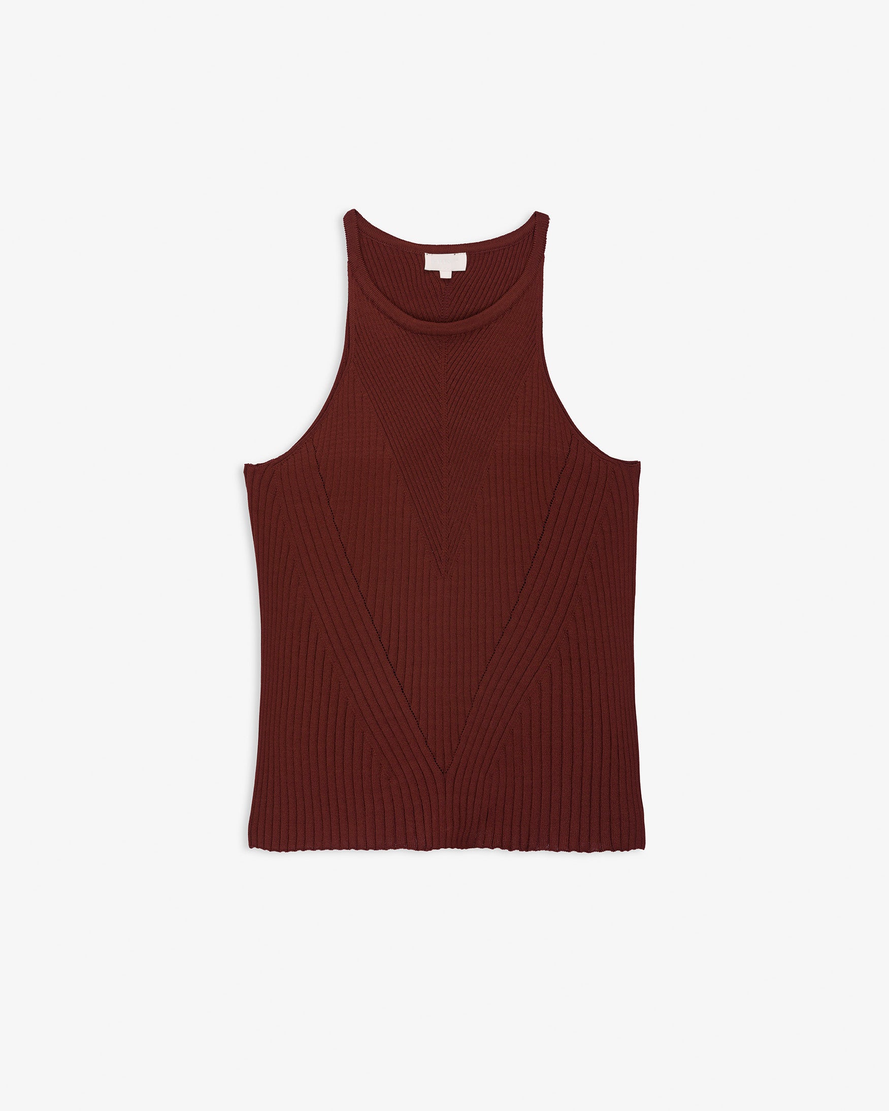 Top de cuello halter y manga sisa. Detalle de tejido en punto elástico con combinación de estructuras en delantero formando motivos geométricos. Acabados en rib fino. Corte entallado.