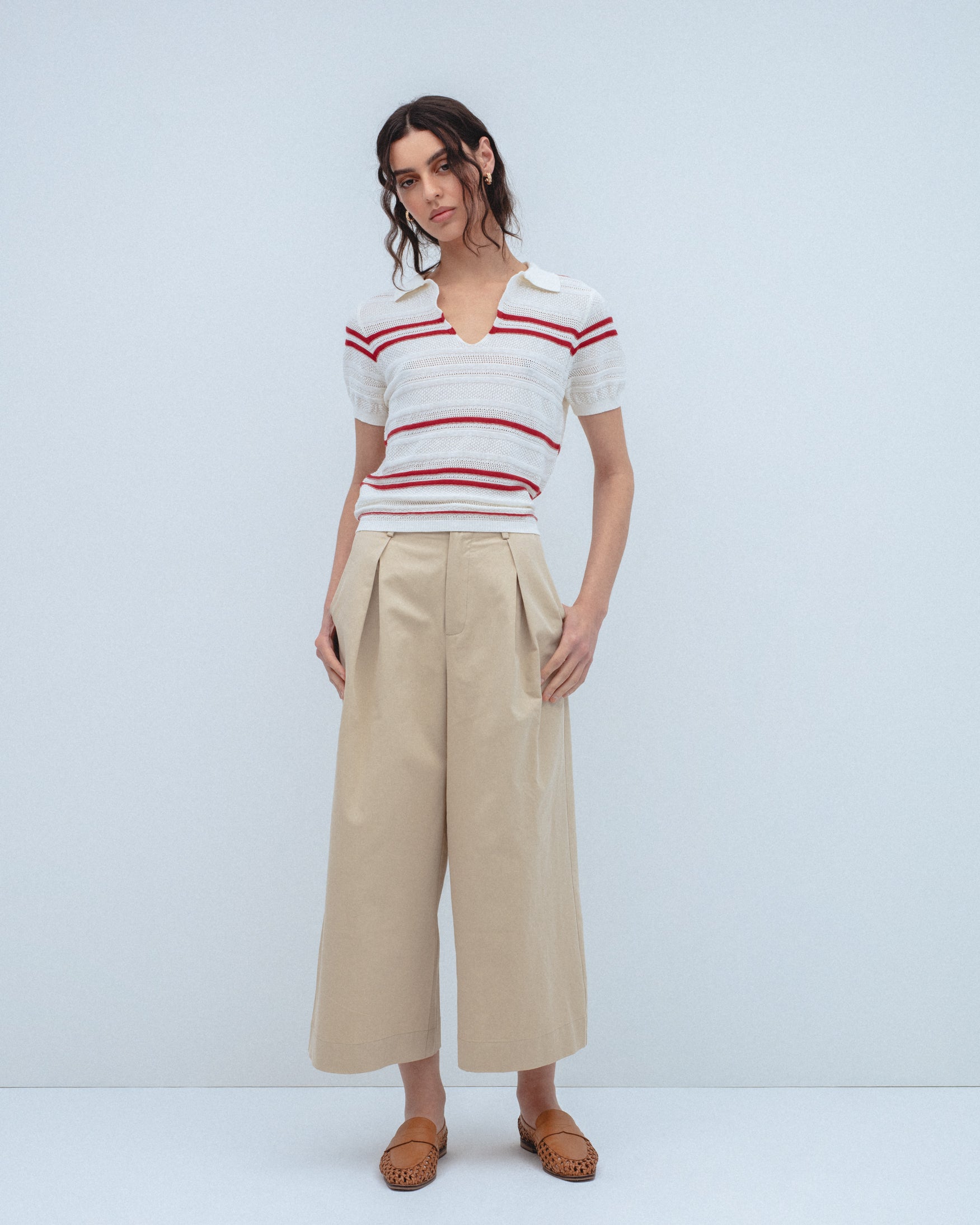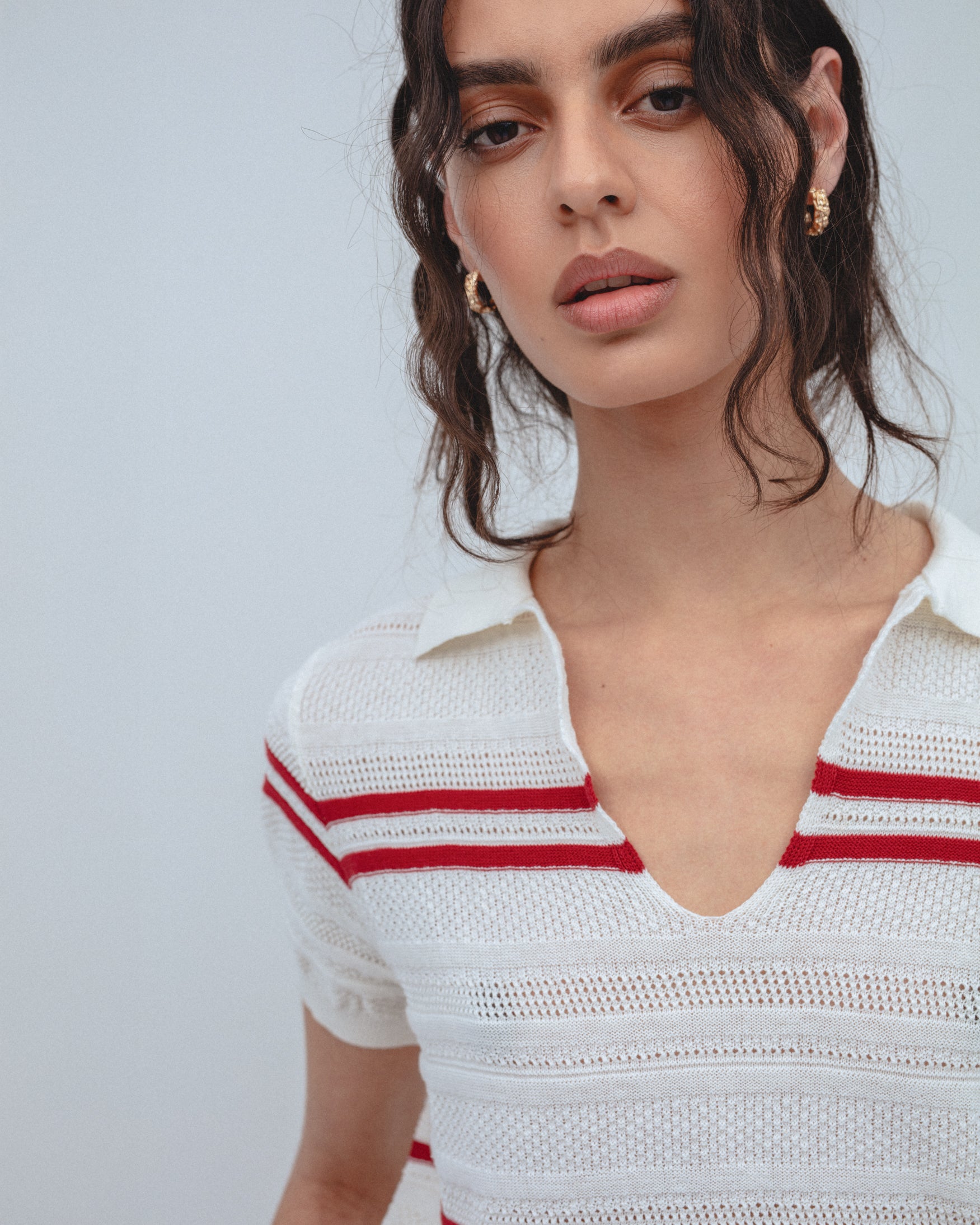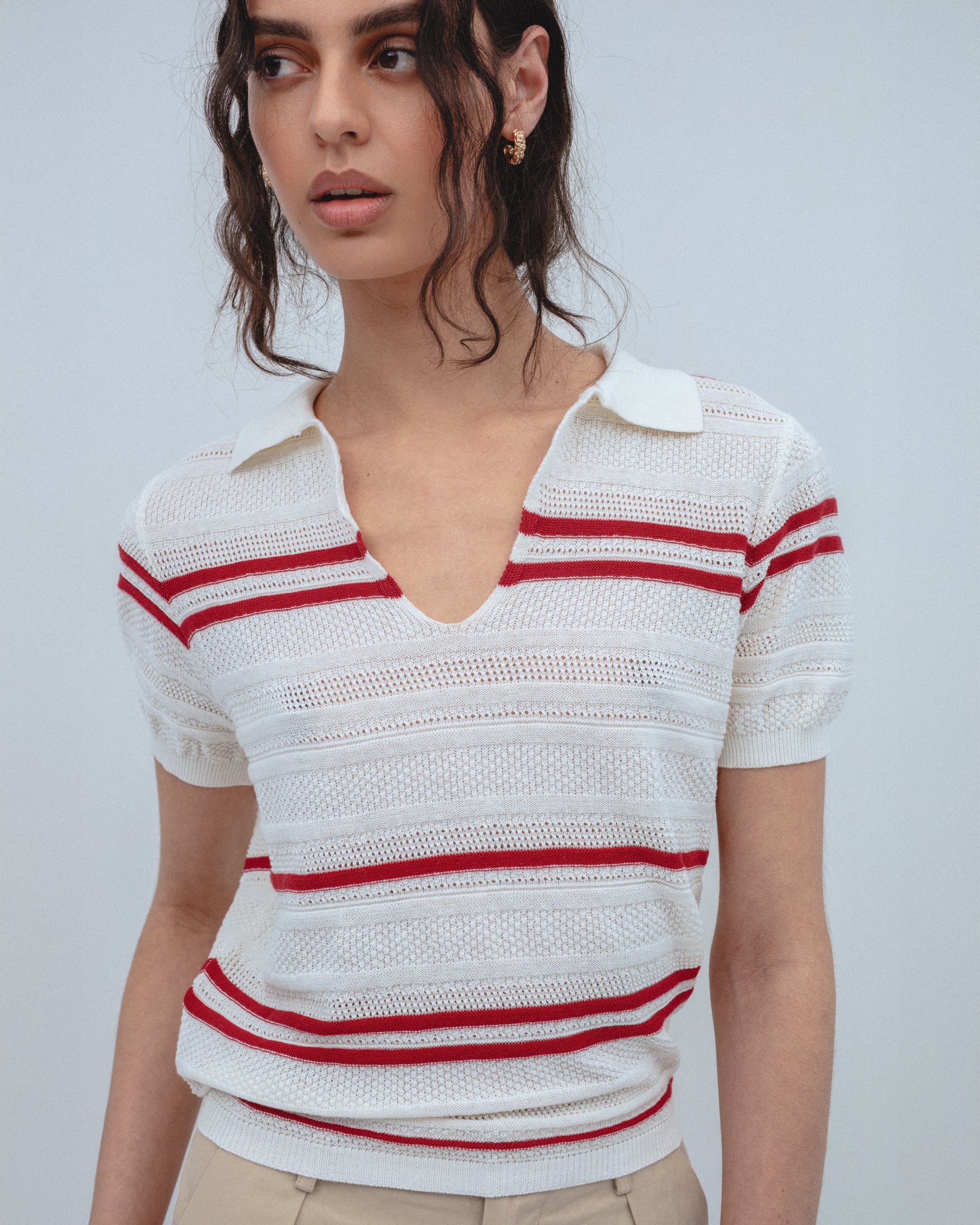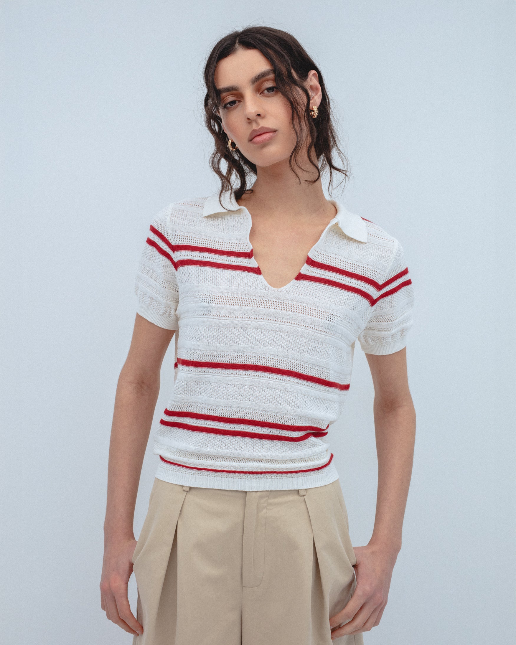Top polo de cuello solapa y escote pico con manga corta. Detalle de tejido con estructura de punto calado. Estampado de rayas horizontales a contraste. Acabados en rib.