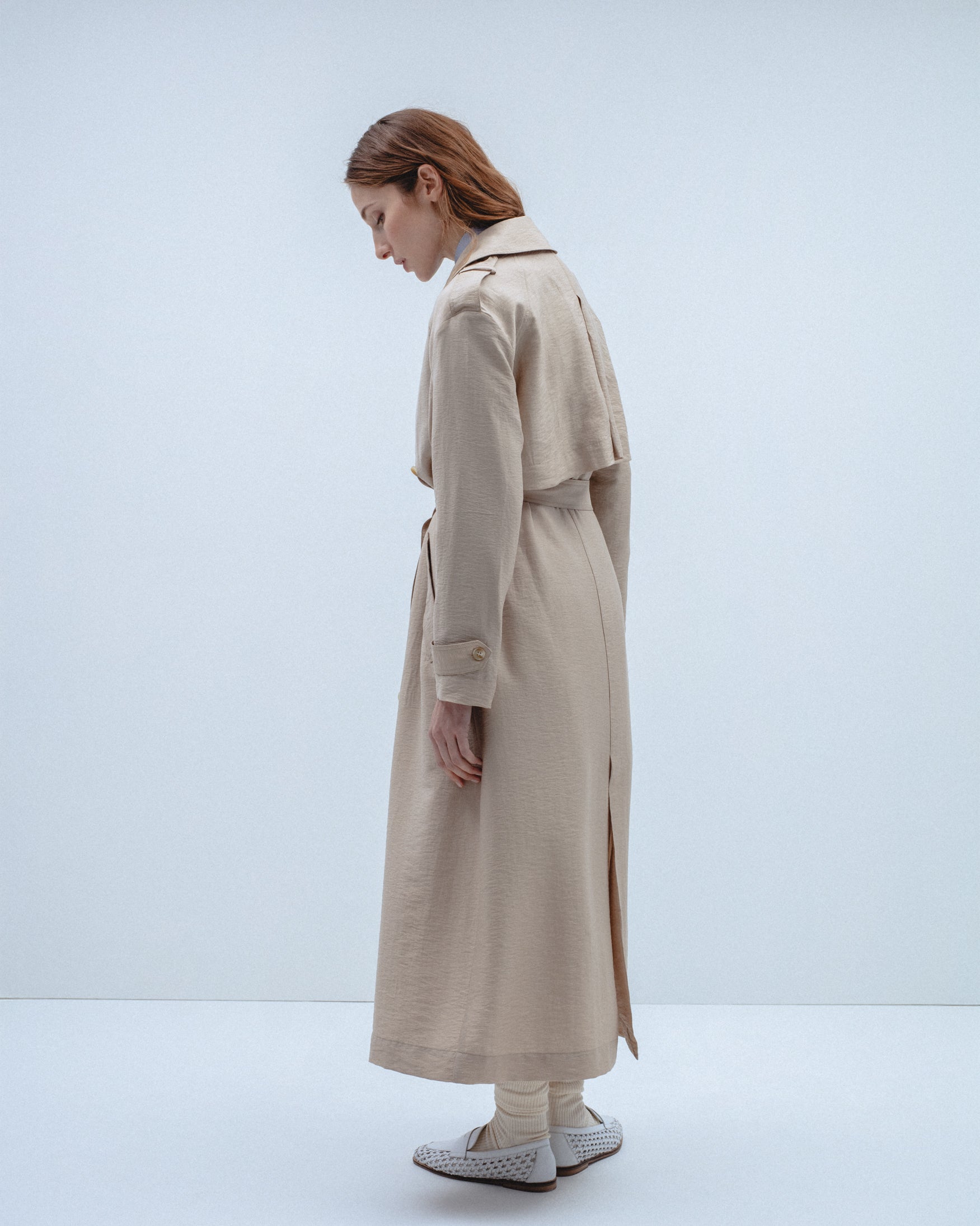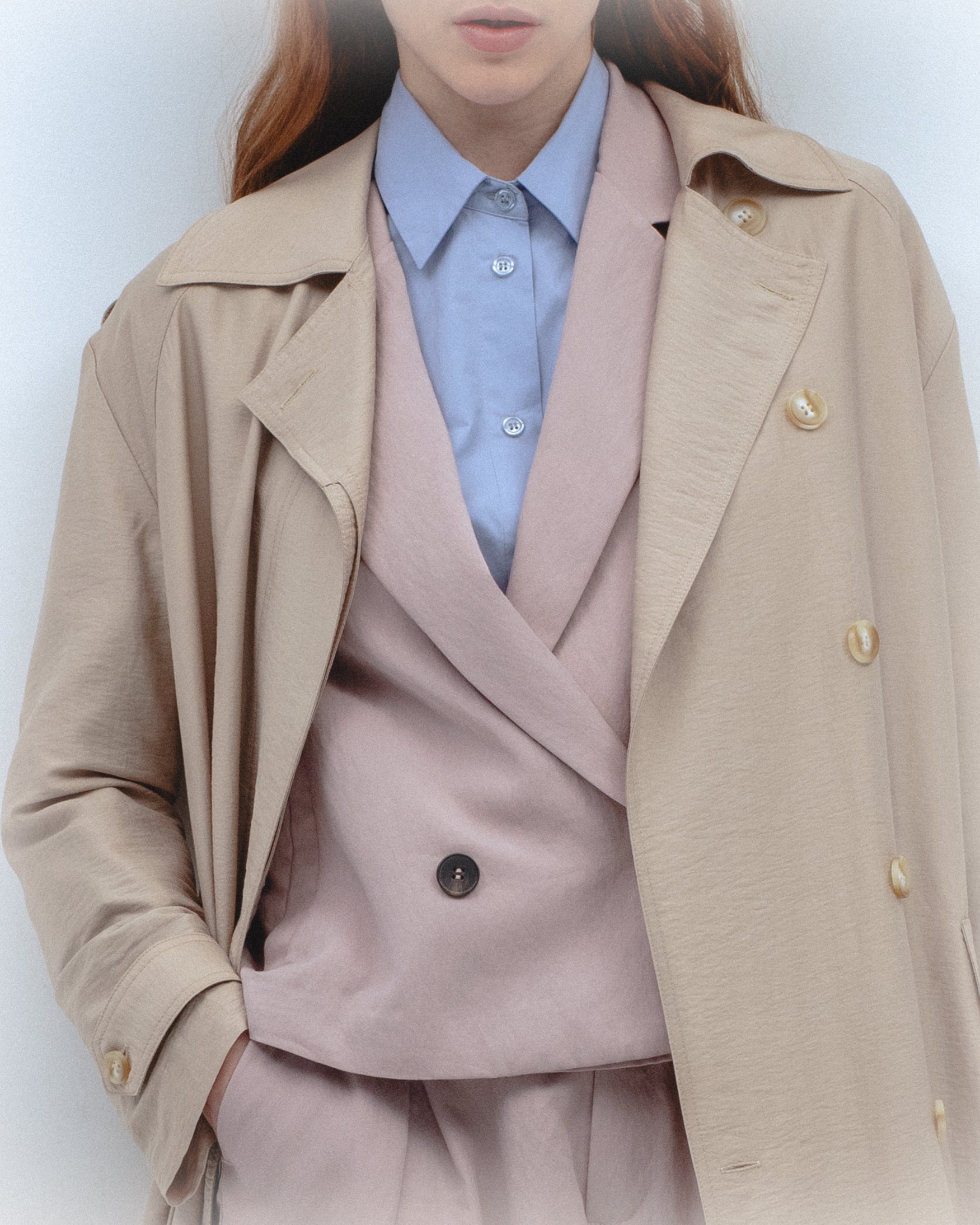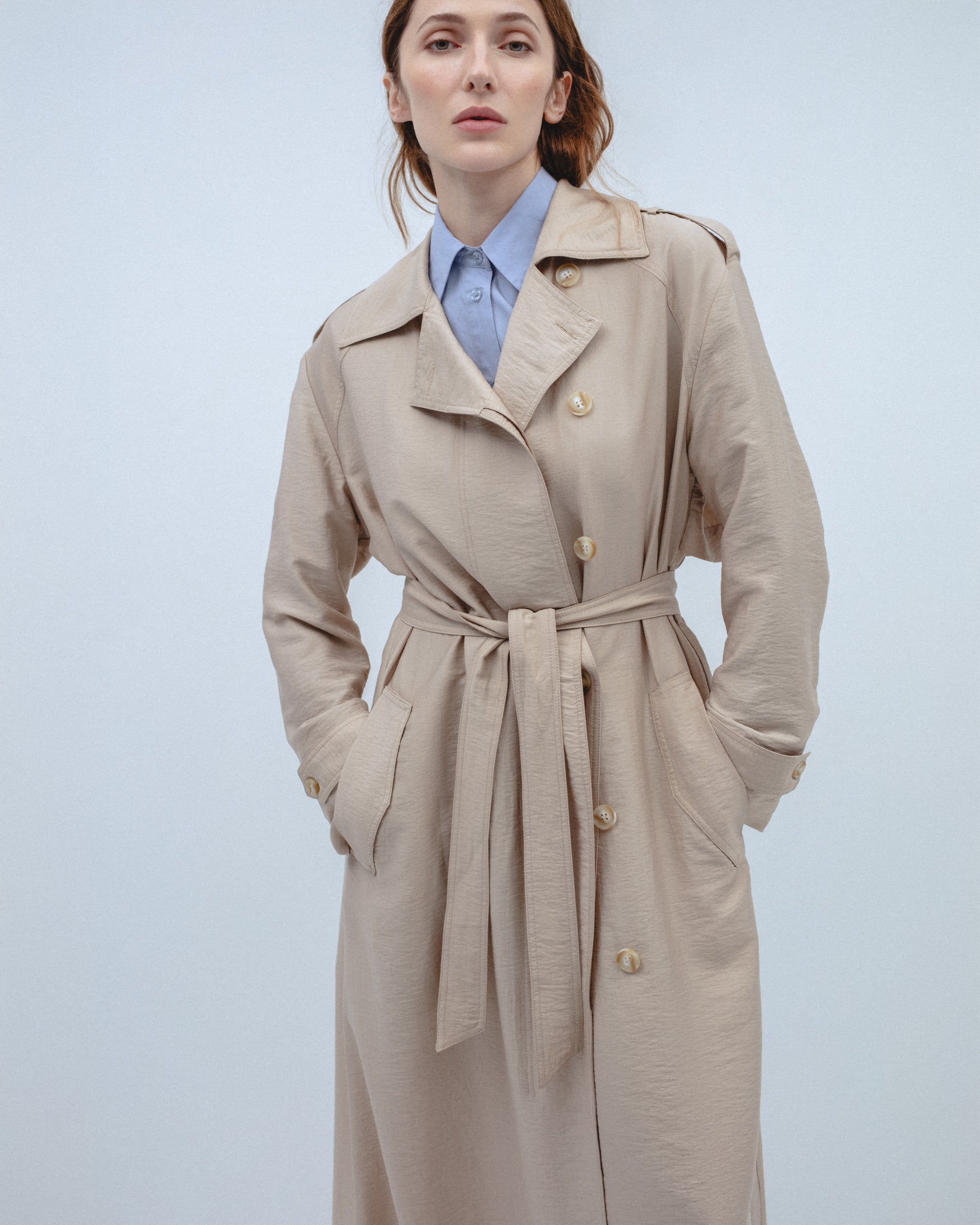 Trench de cuello solapa y manga larga con trabillas en los puños. Bolsillos laterales de ojal. Detalle de cinturón del mismo tejido con hebilla. Bajo con abertura central en espalda. Cierre frontal cruzado con botones.