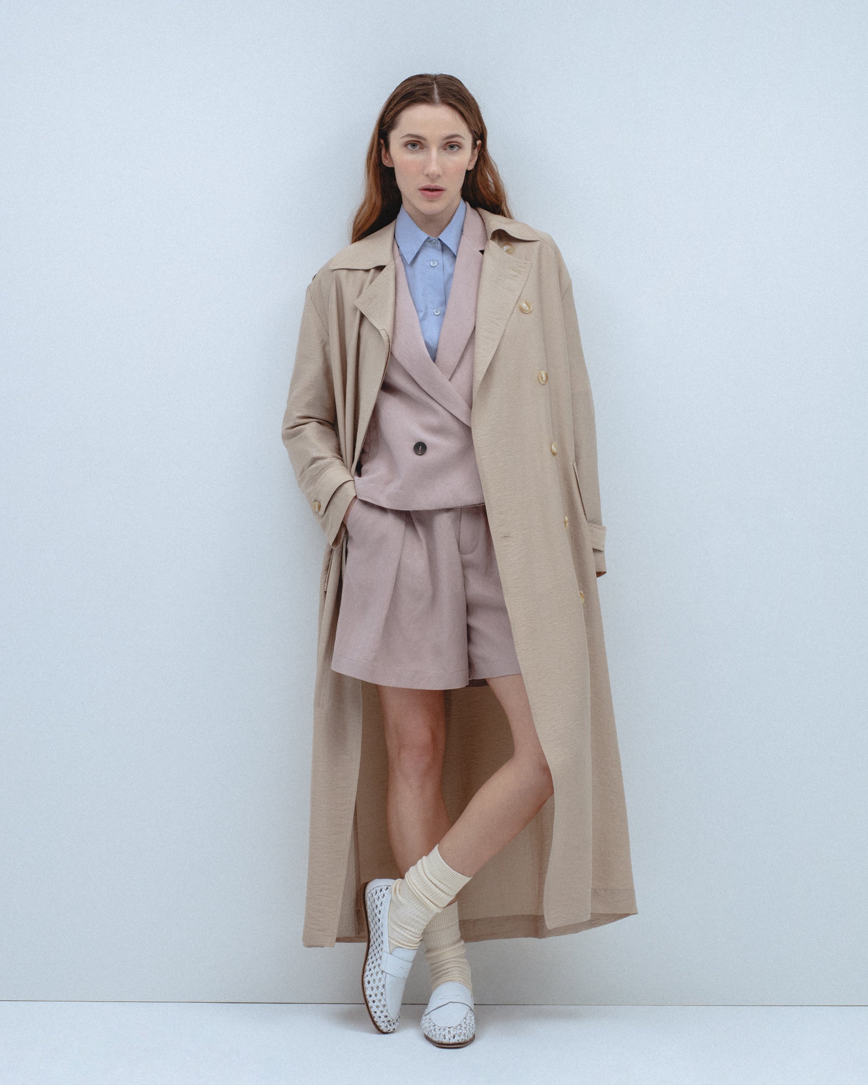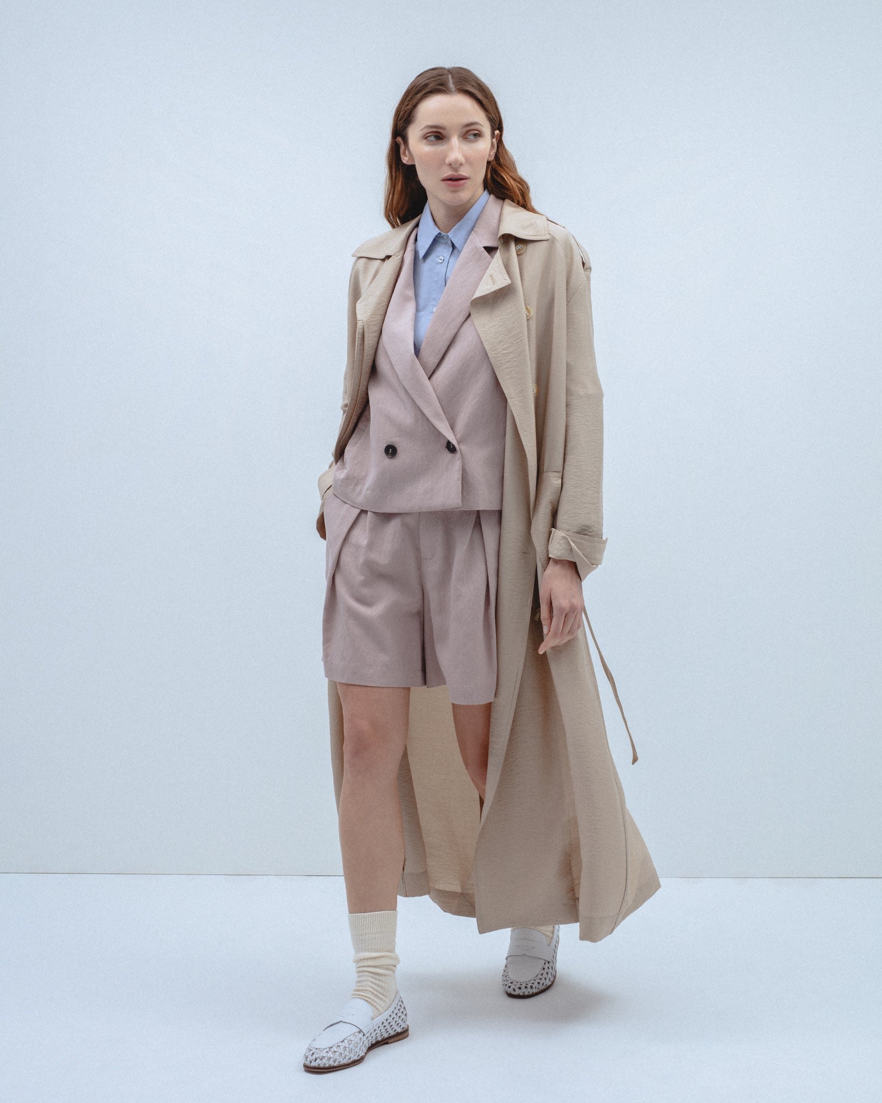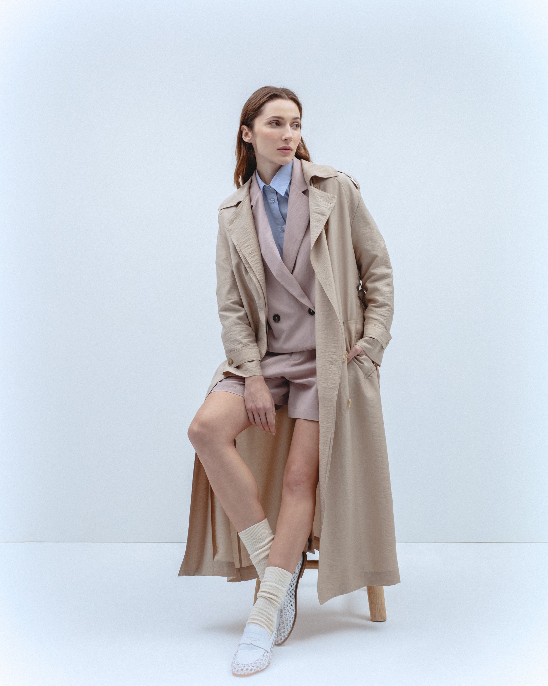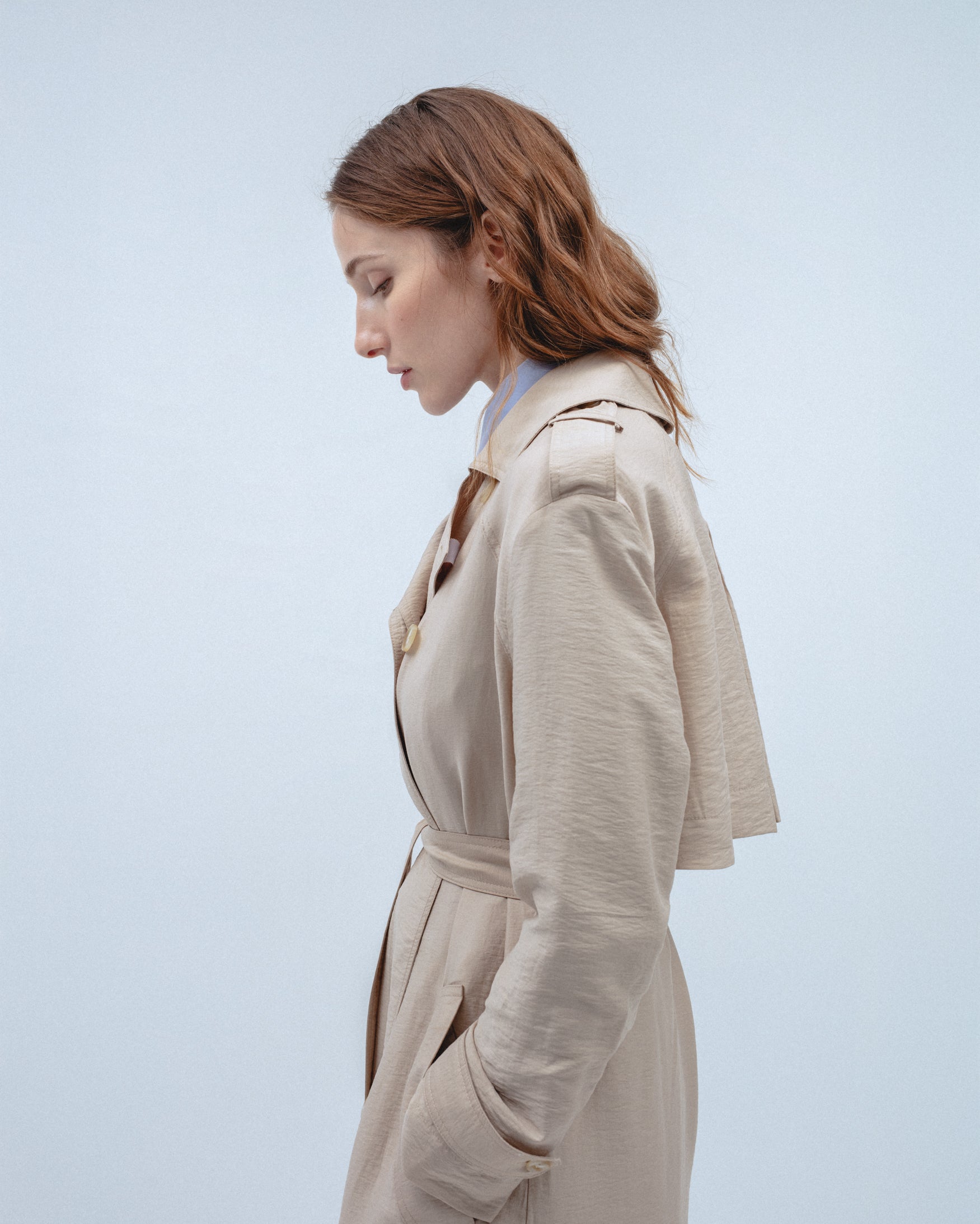 Trench de cuello solapa y manga larga con trabillas en los puños. Bolsillos laterales de ojal. Detalle de cinturón del mismo tejido con hebilla. Bajo con abertura central en espalda. Cierre frontal cruzado con botones.